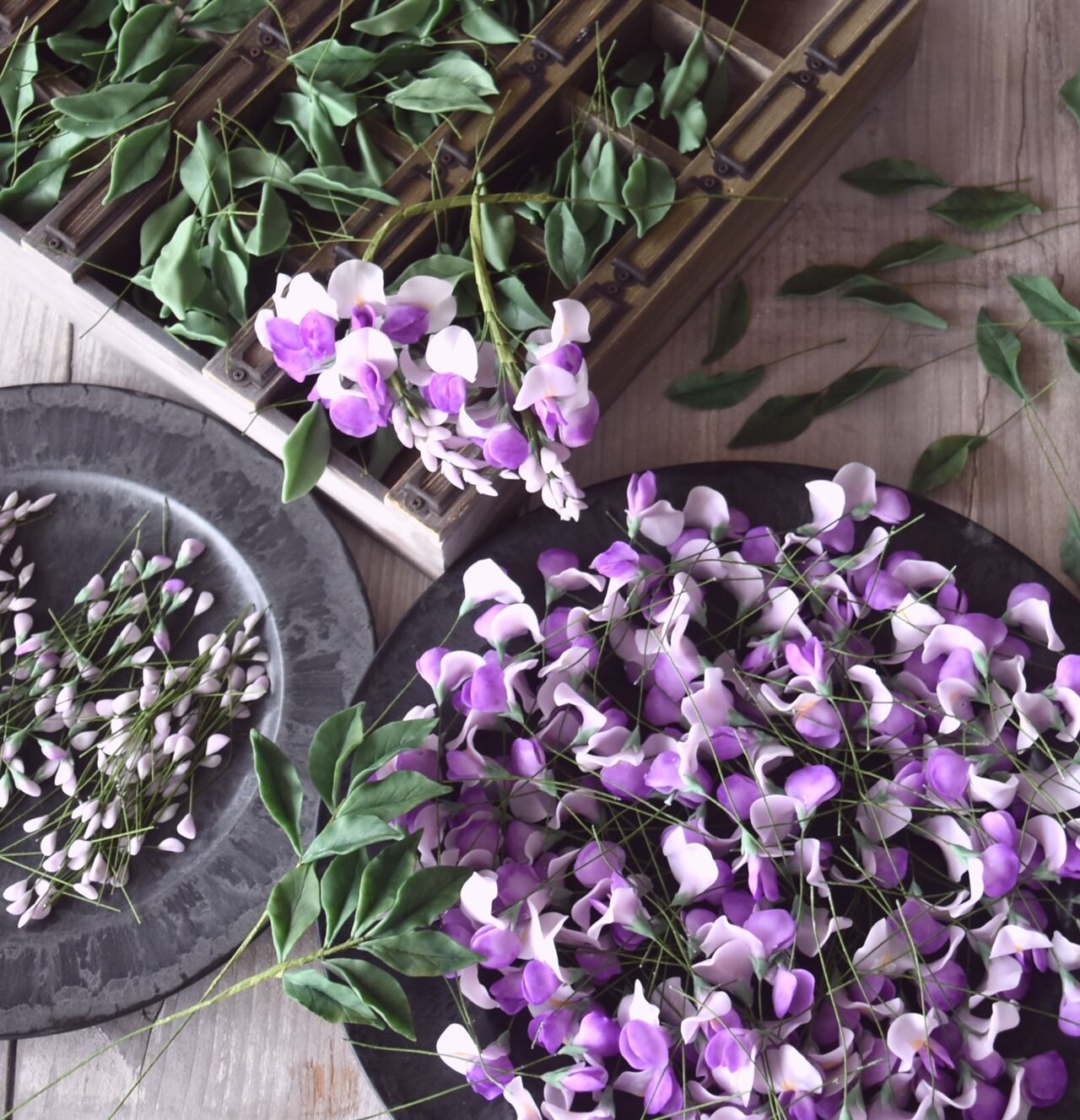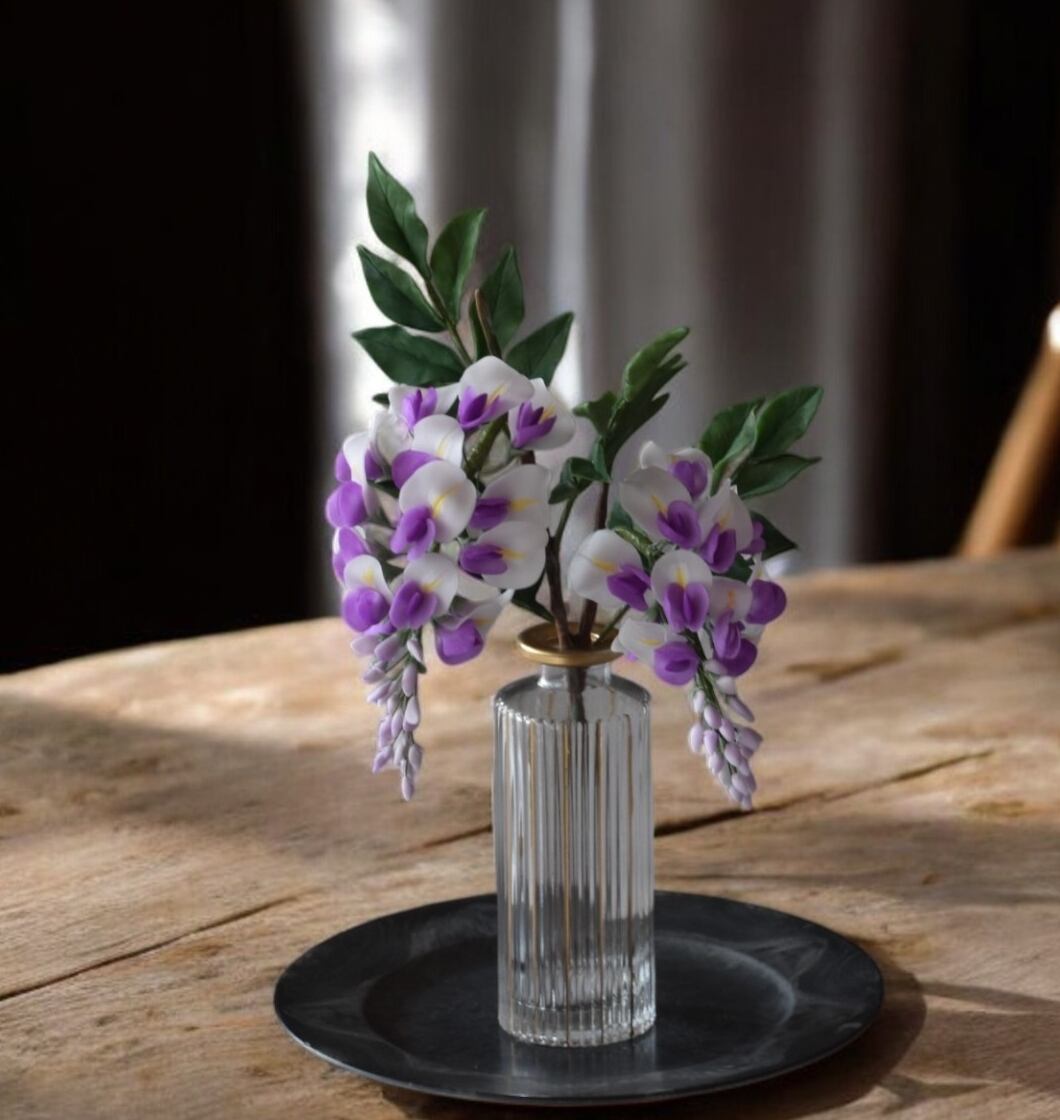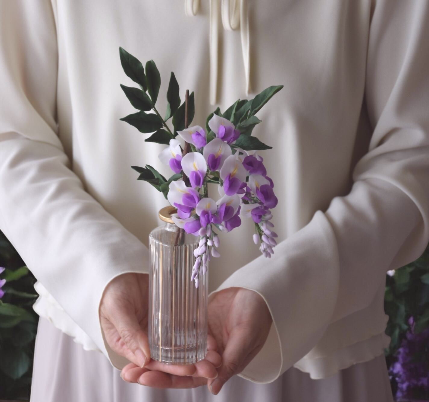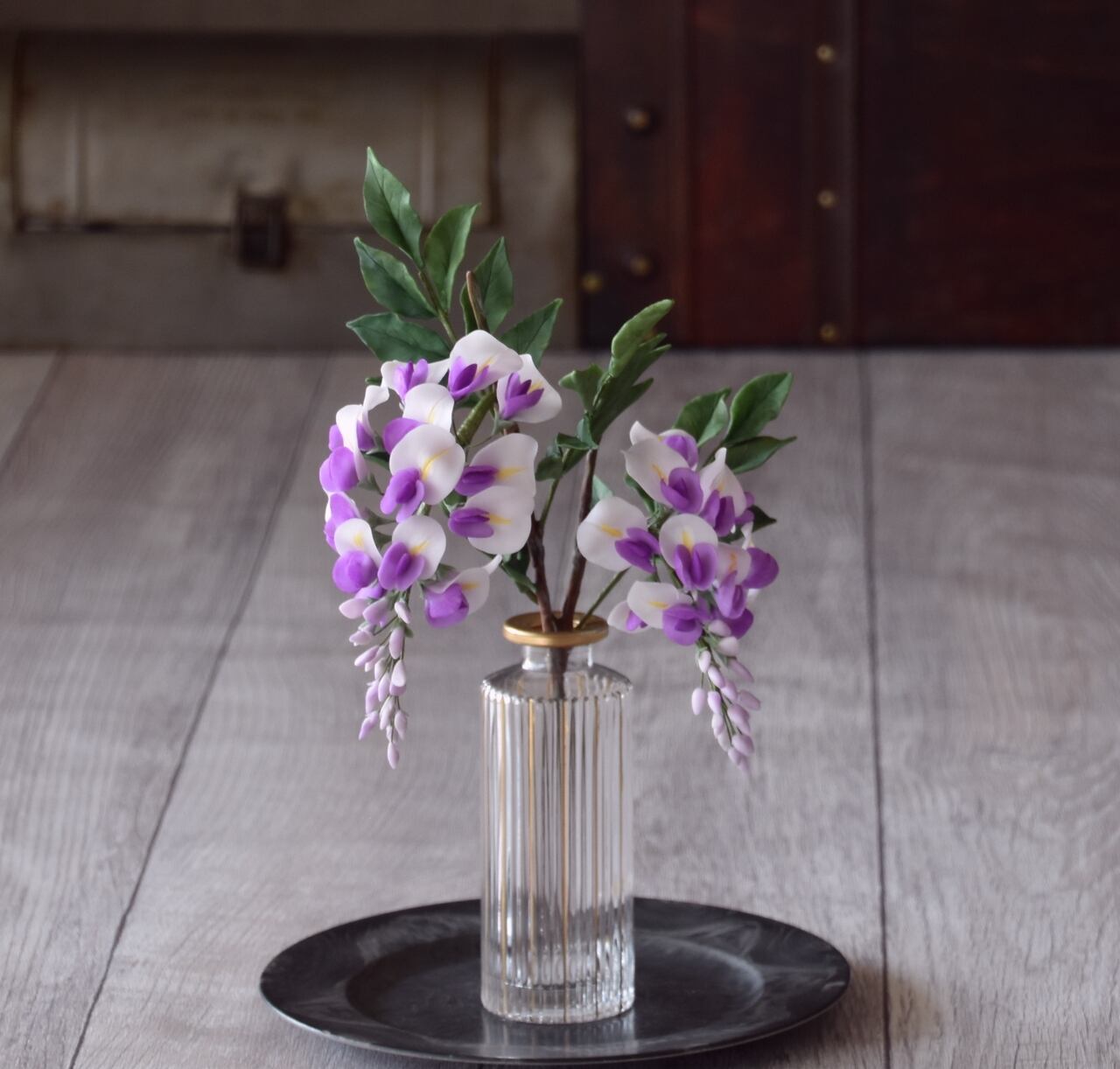 粘土で藤の花をつくり、上品なガラスボトルにアレンジしました。