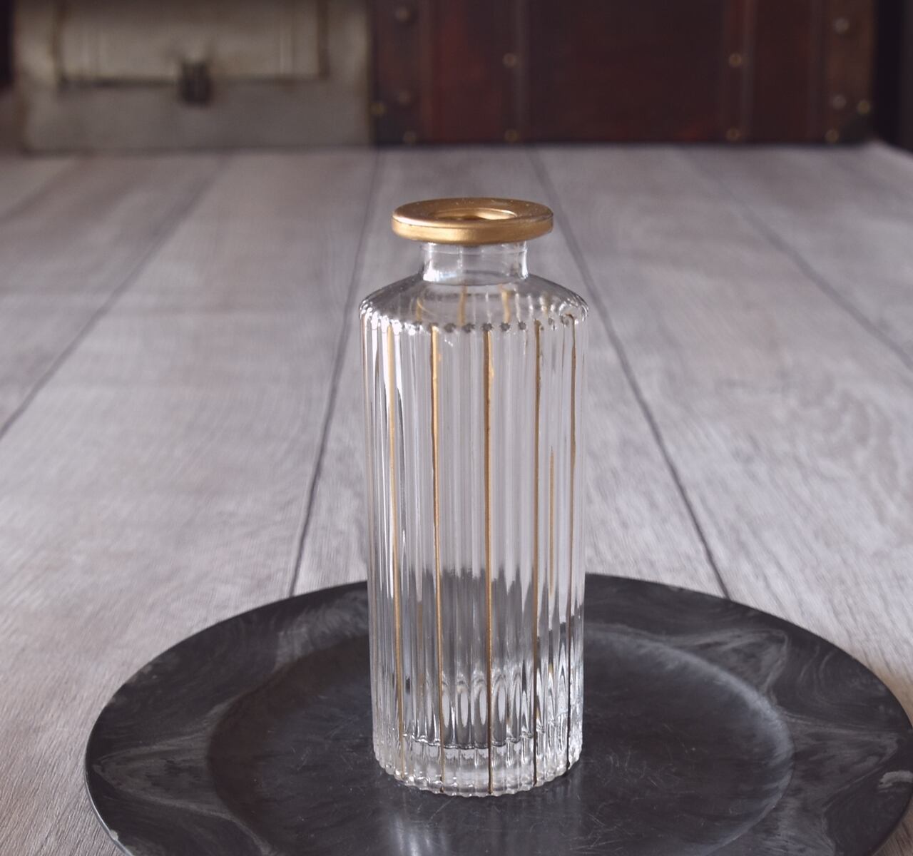 ガラスボトルはハンドメイドで歪みを活かしたデザインのボトルです。製法上、気泡や流れ模様、サイズやガラスの厚みに個体差がございます。アンティーク加工を施した商品です。