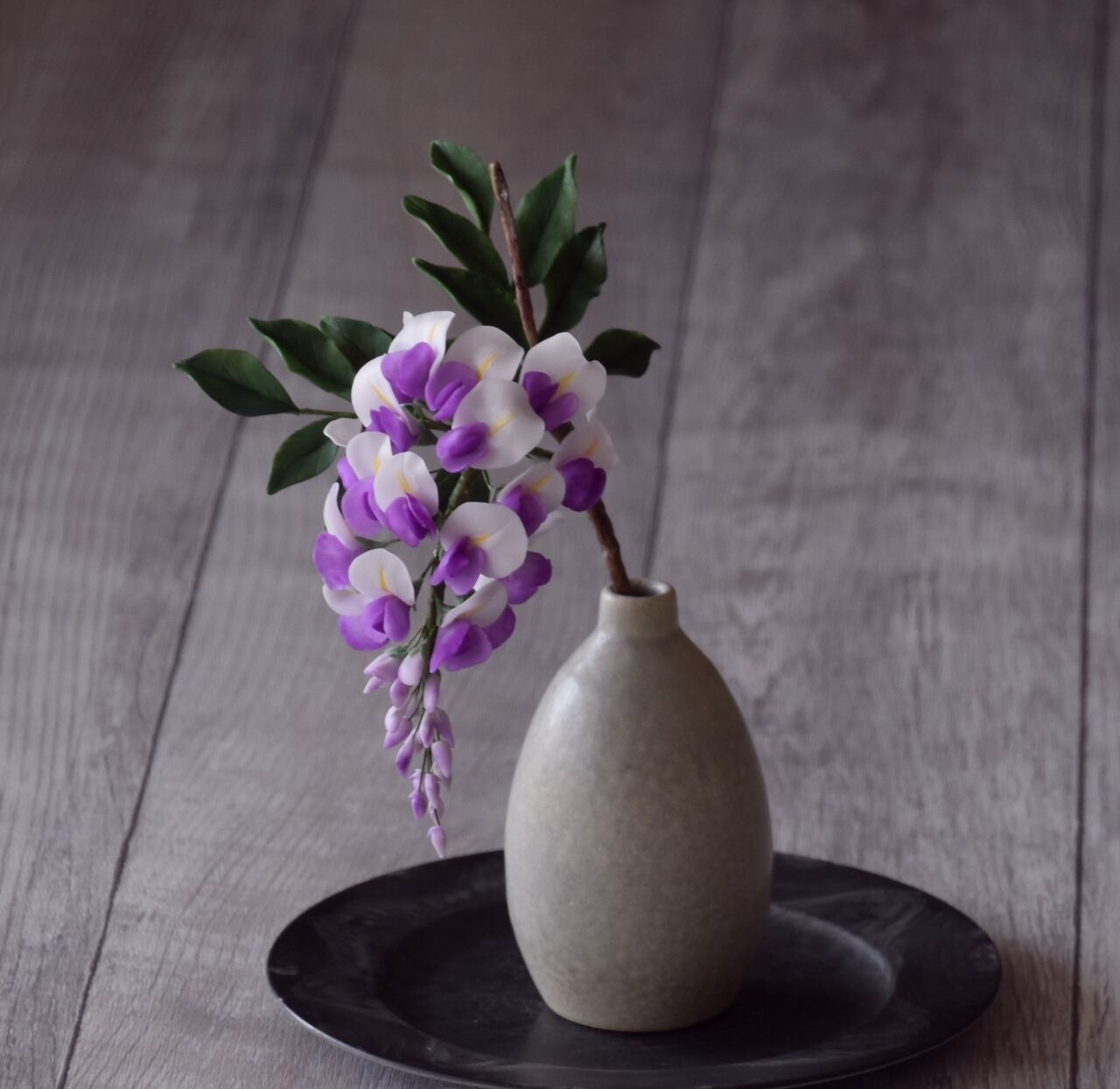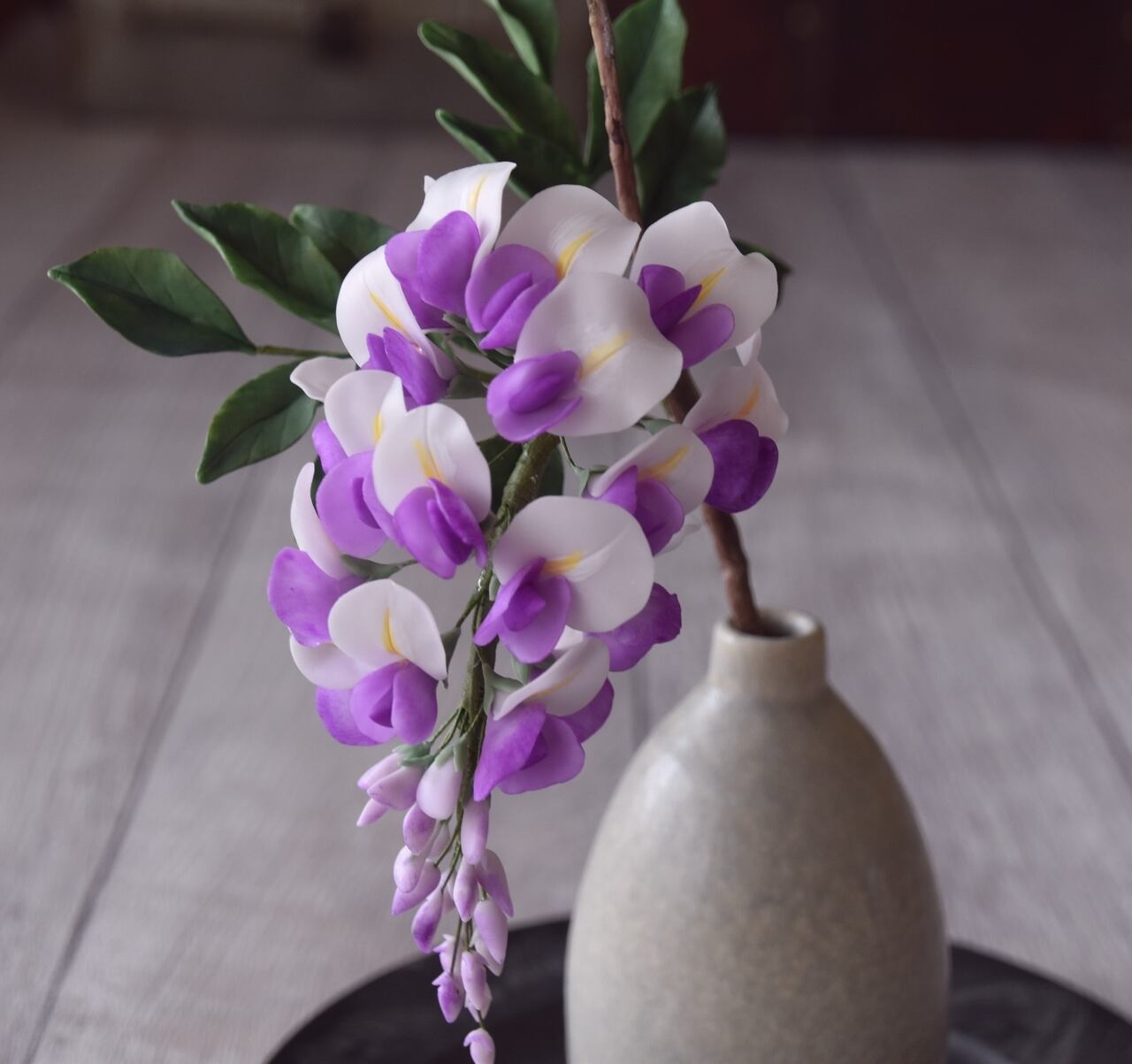 粘土で藤の花をつくり、小ぶりなサイズの信楽焼の一輪挿しの花瓶に活けました。