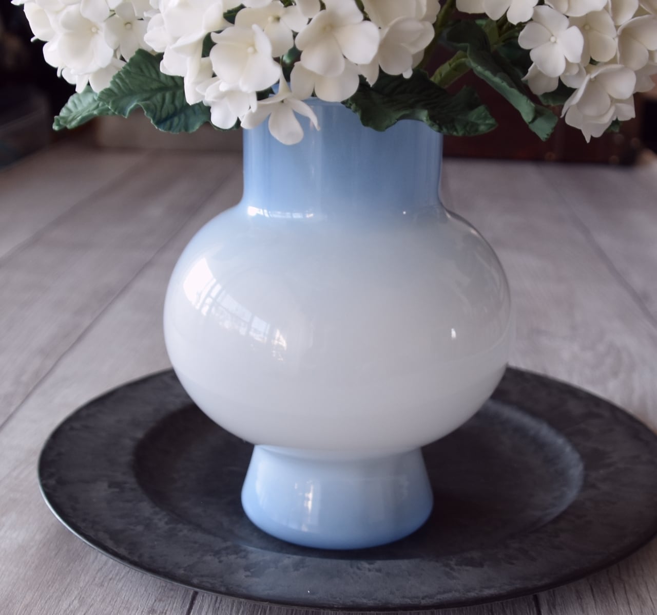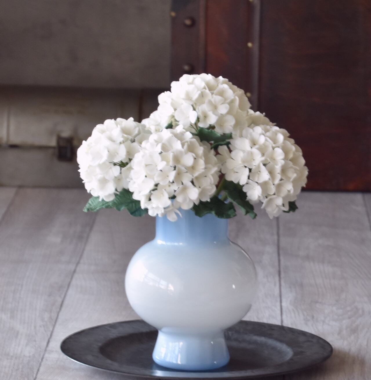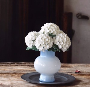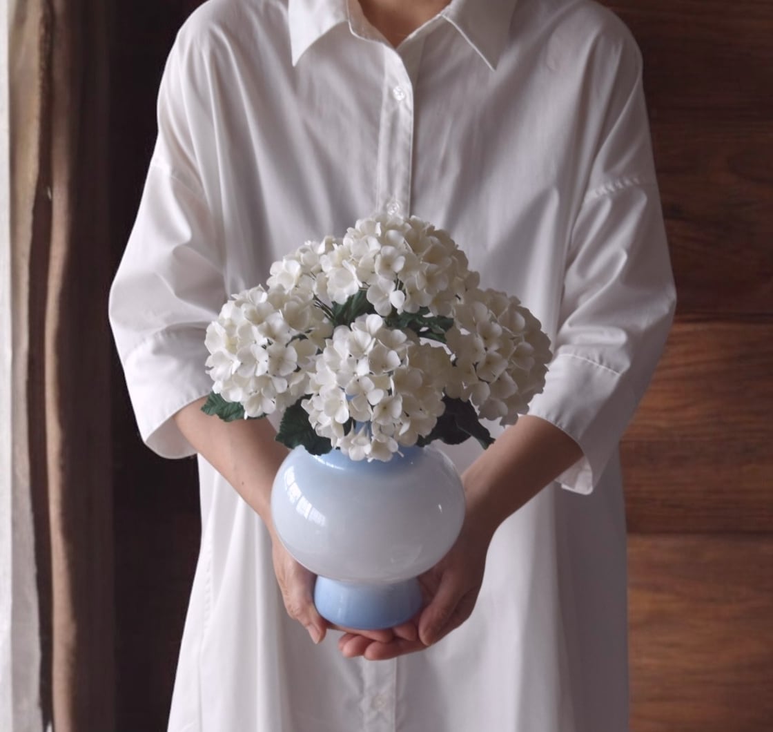 粘土を薄く伸ばし、一枚一枚丁寧に花びらを制作し、ふんわりと毬状になるように仕上げました。花瓶は、綺麗なライトブルーで、シンプルかつ上品な花瓶です。