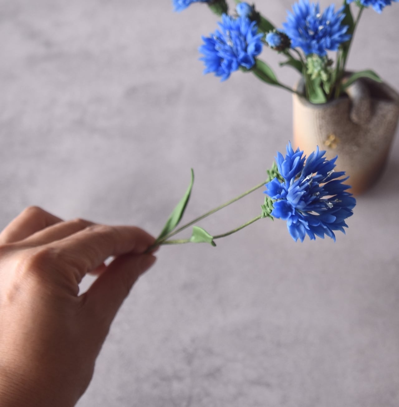 粘土を薄く伸ばし、小さな花弁を一つ一つ作り、繊細で美しいヤグルマギクがふんわりと咲いているように仕上げました。