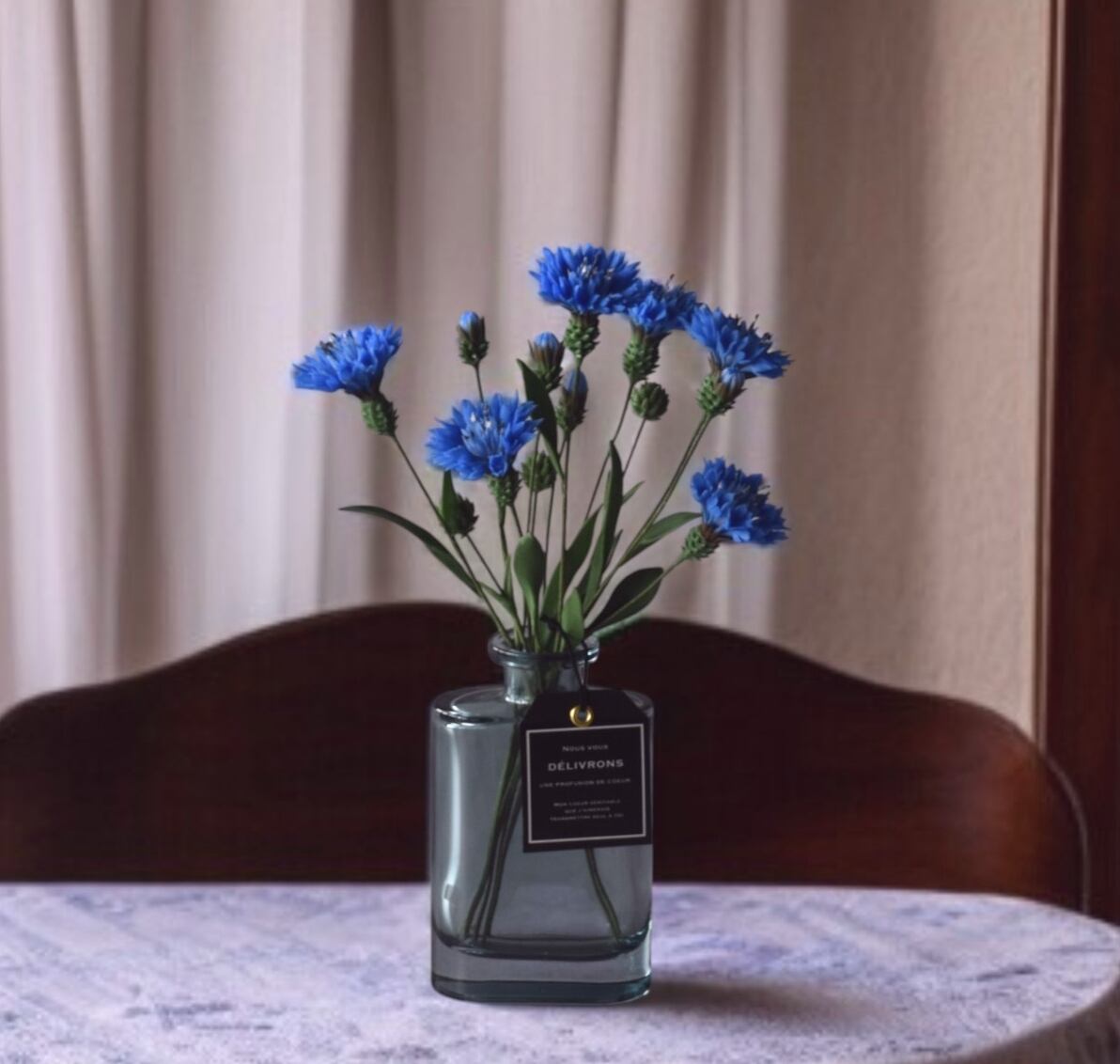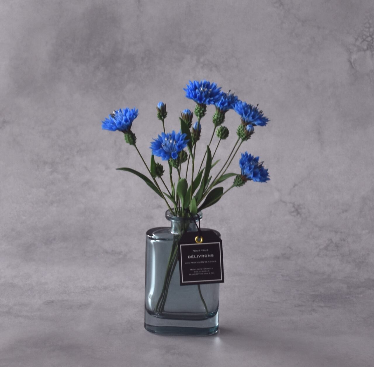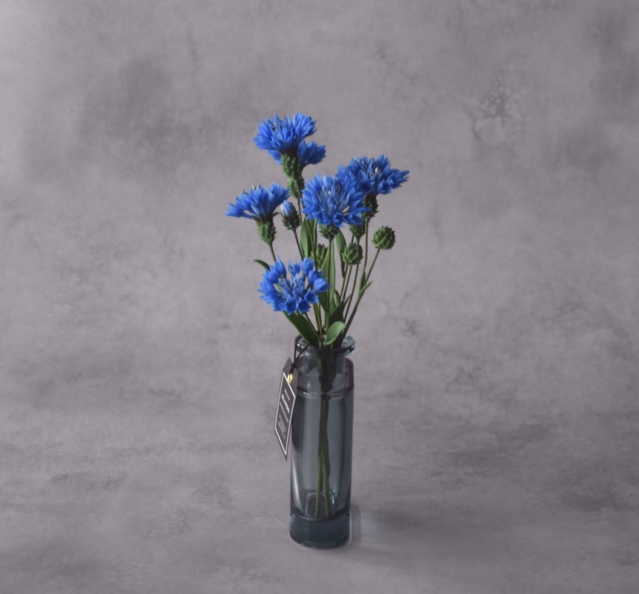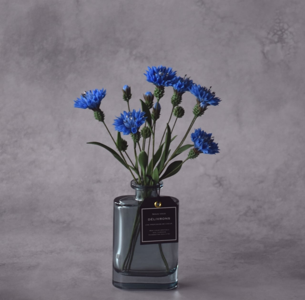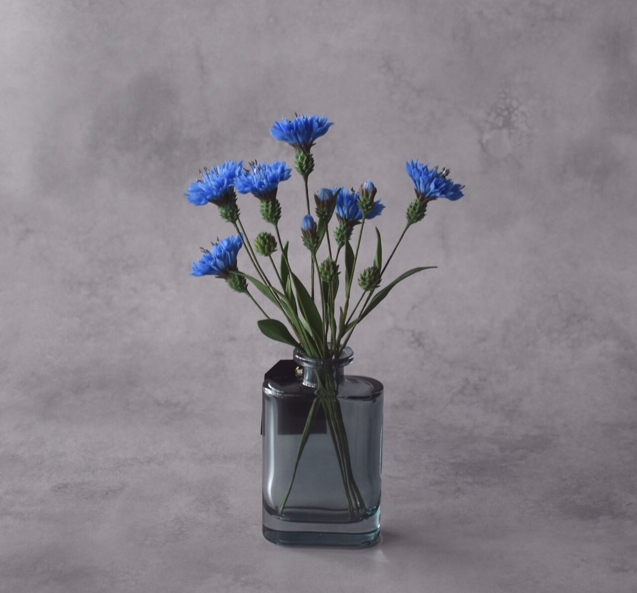 ダークブルーのフラワーベースは、シンプルでどっしりとした重厚感があるボトルです。