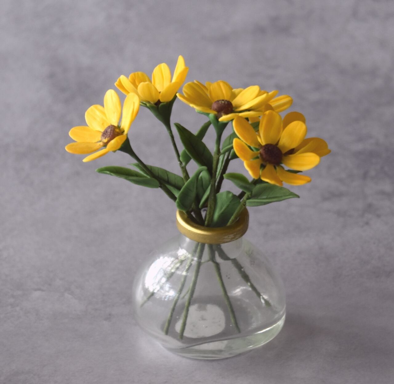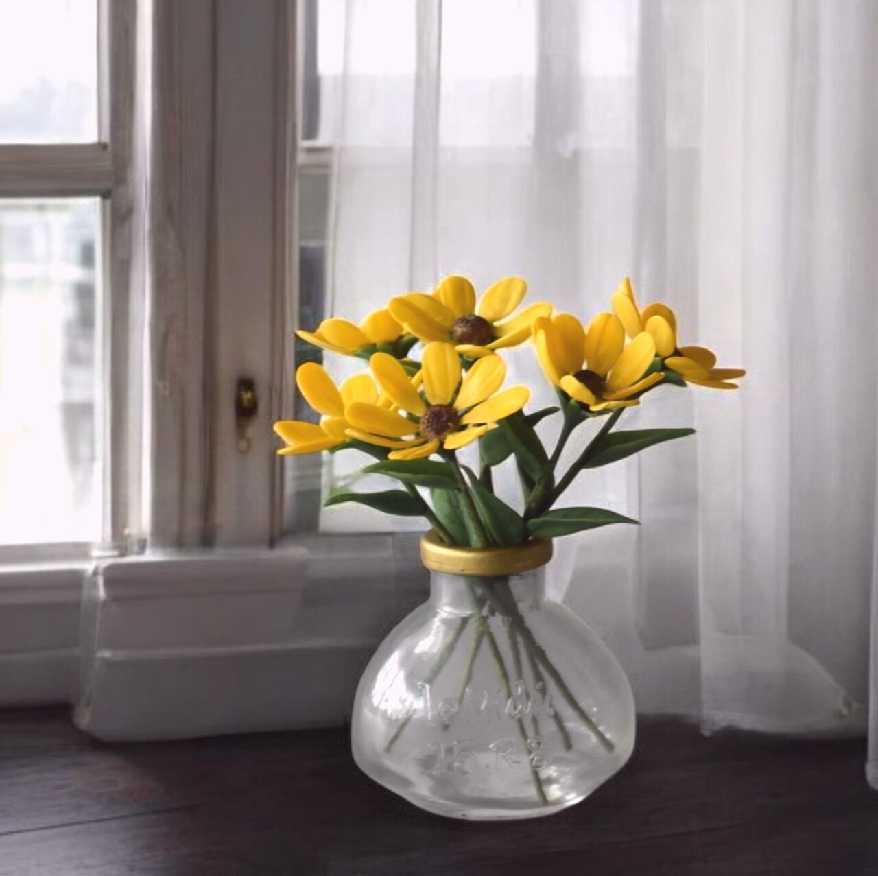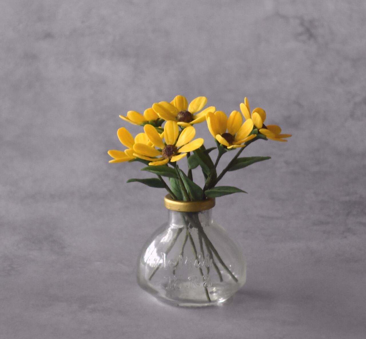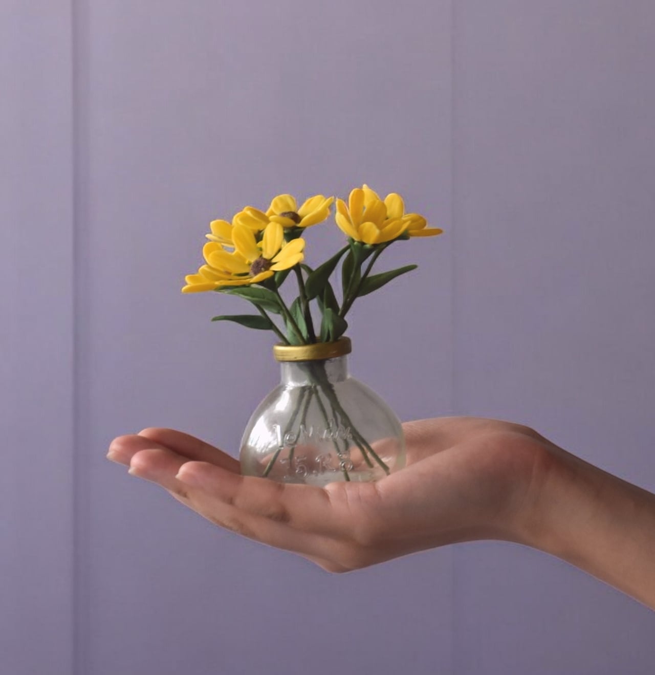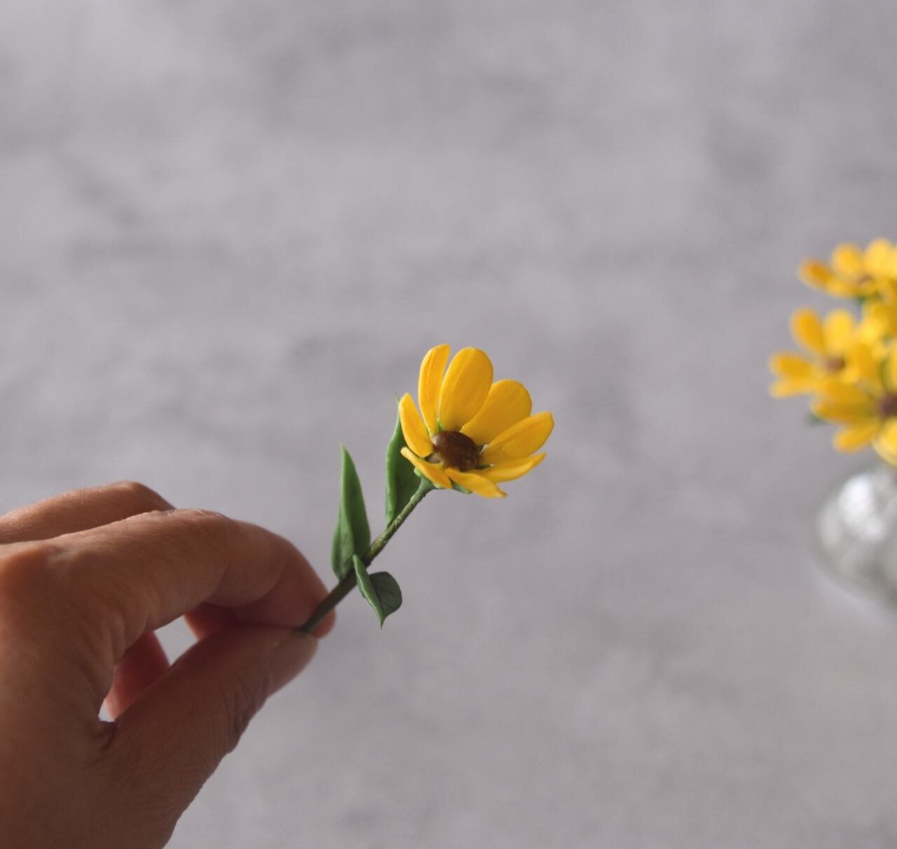 近くの公園に咲いていた、小さなひまわりのような可愛らしい黄色い花に魅了され、「お部屋にも飾りたい」と思い、心を込めて制作しました。