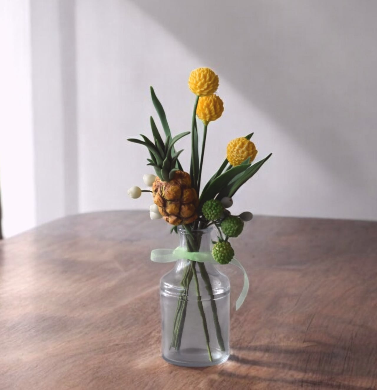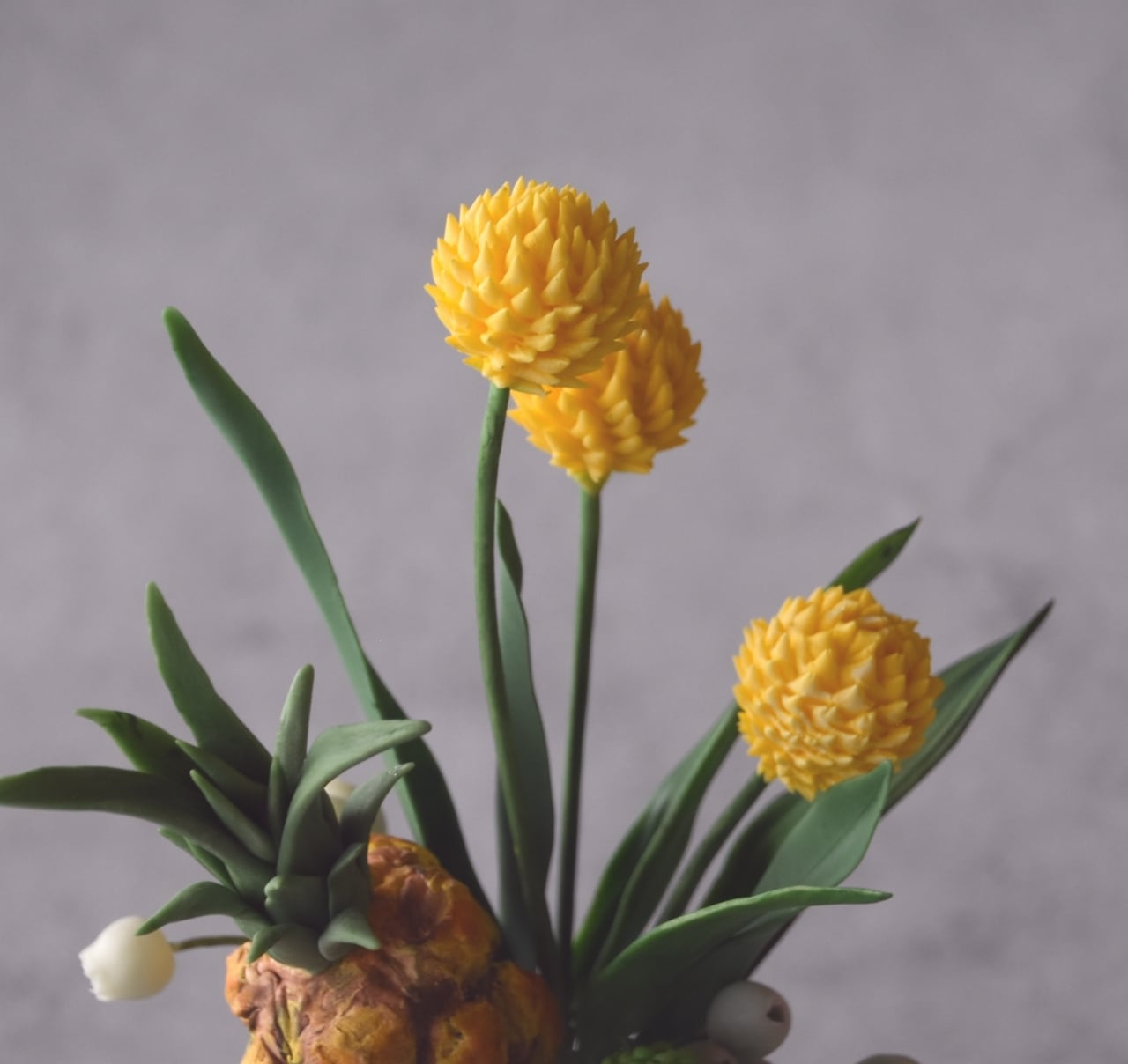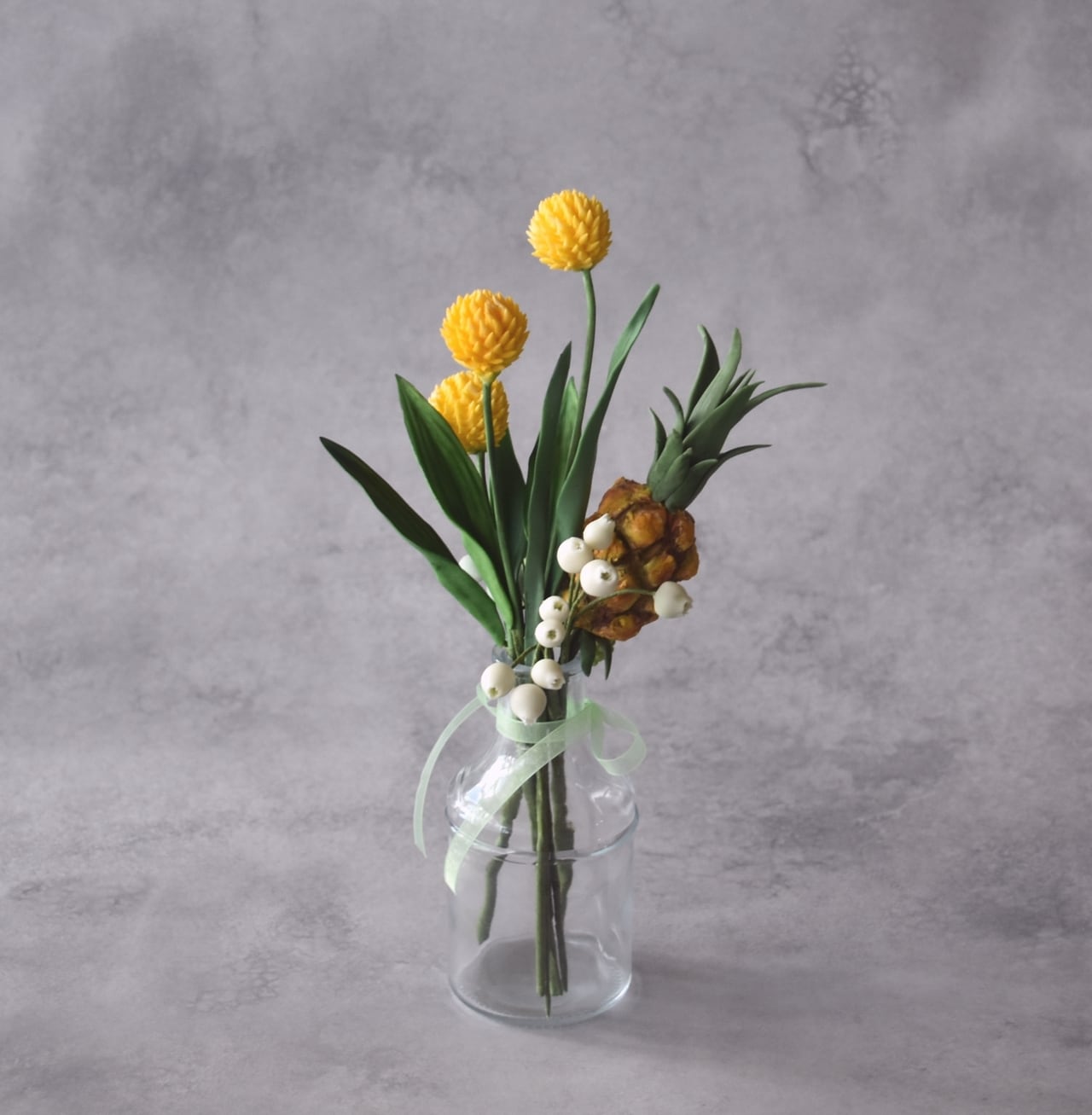 粘土で制作した、ミニパイナップルとビリーボタン(クラスペディア)のアレンジです。