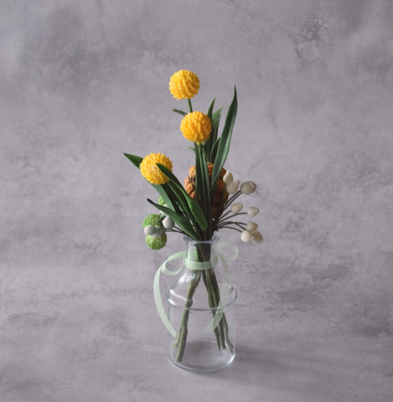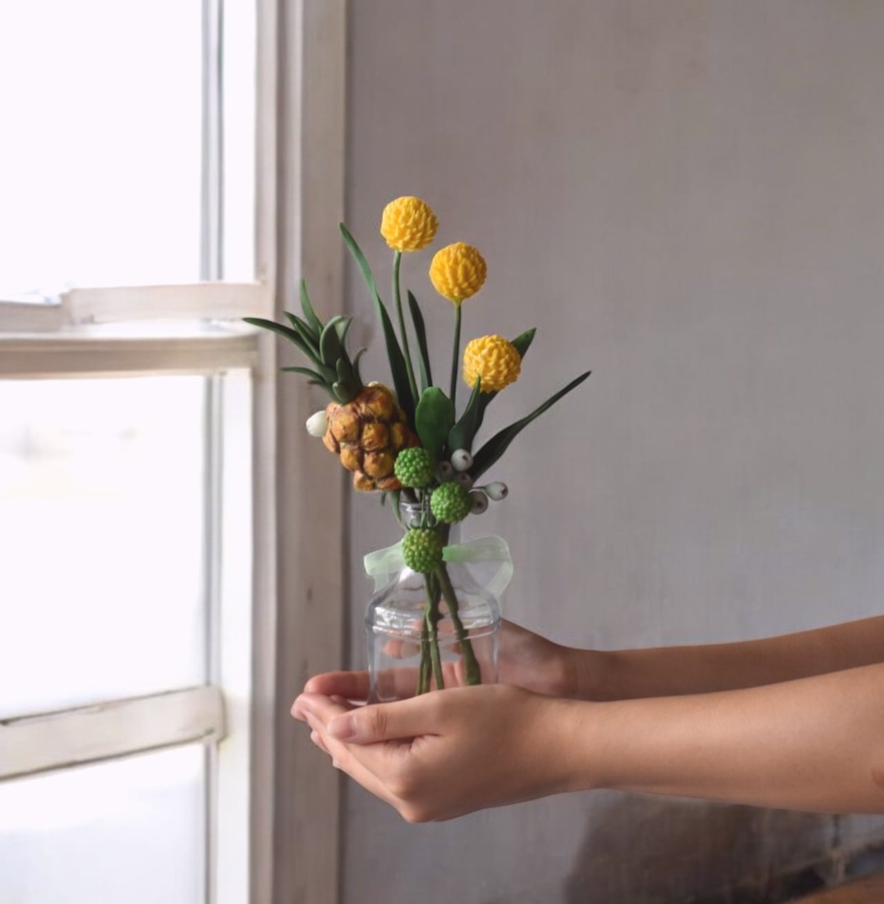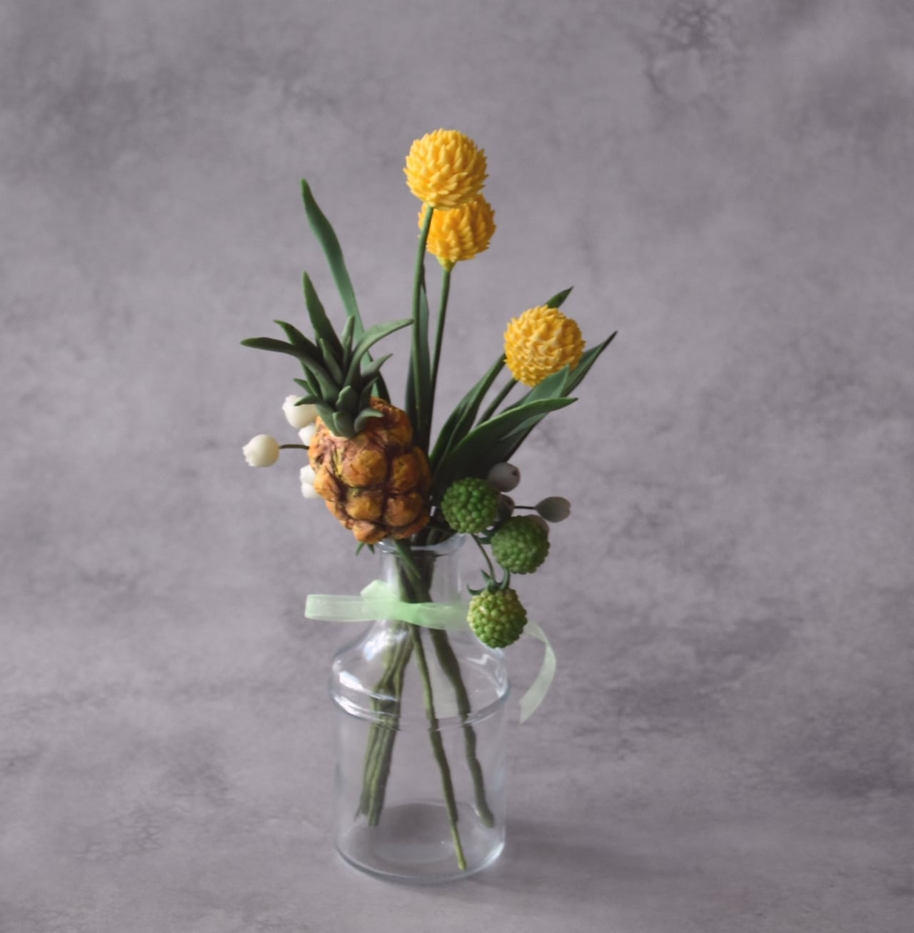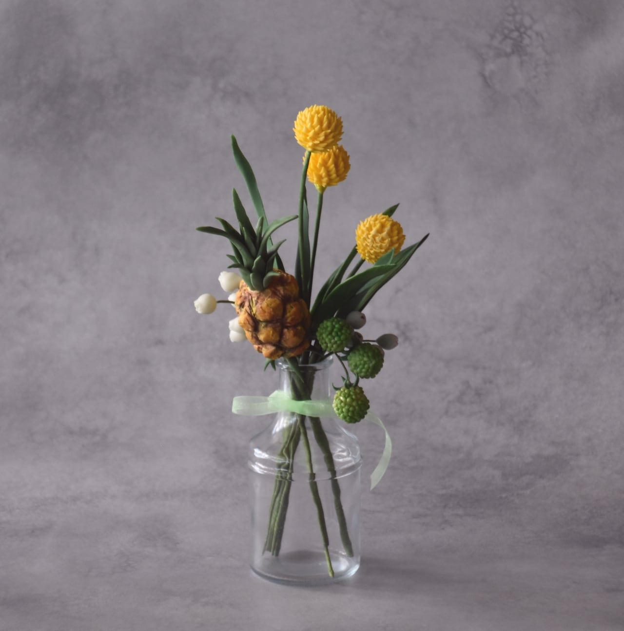 粘土で制作した、ミニパイナップルとビリーボタン(クラスペディア)のアレンジです。