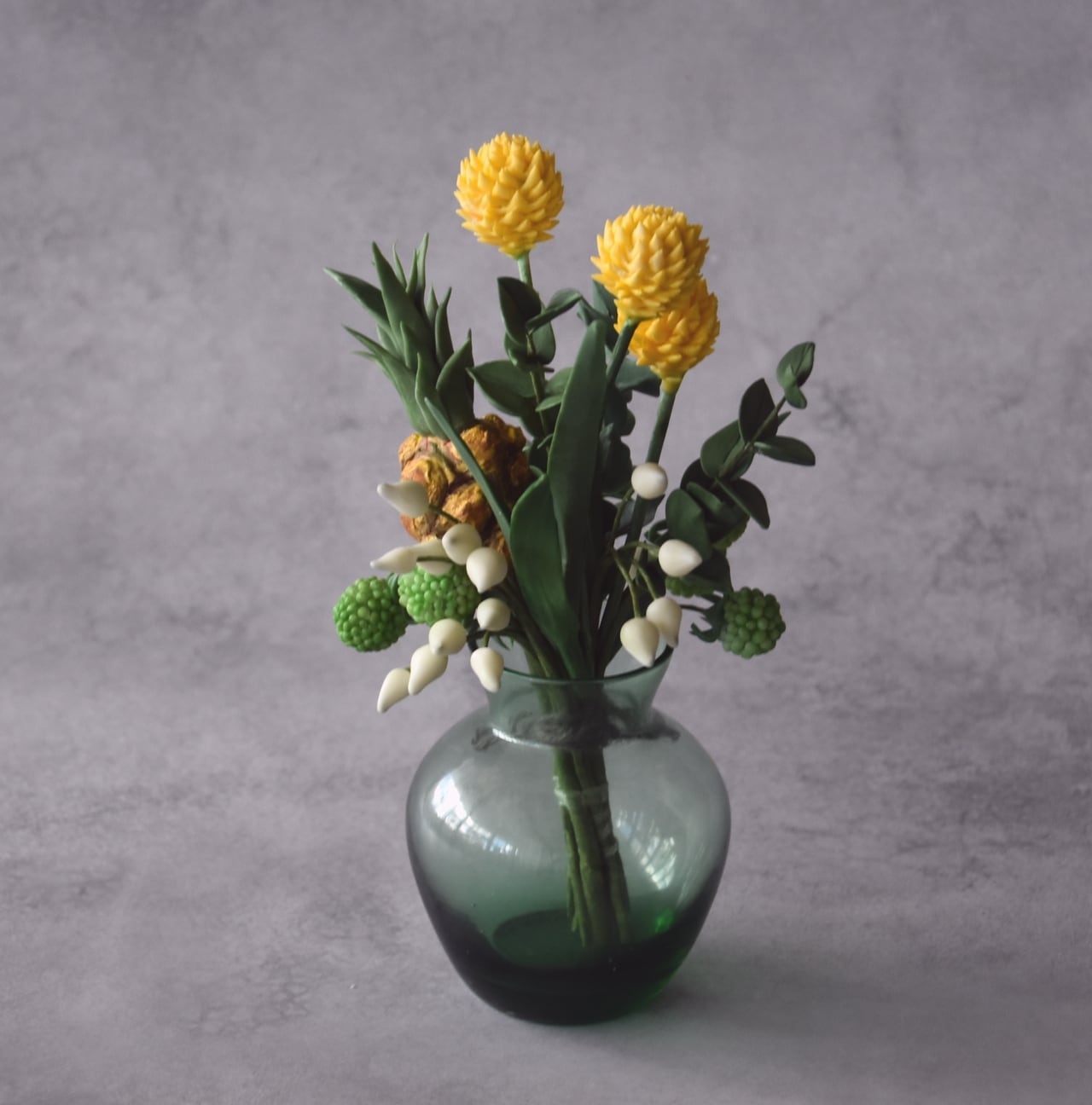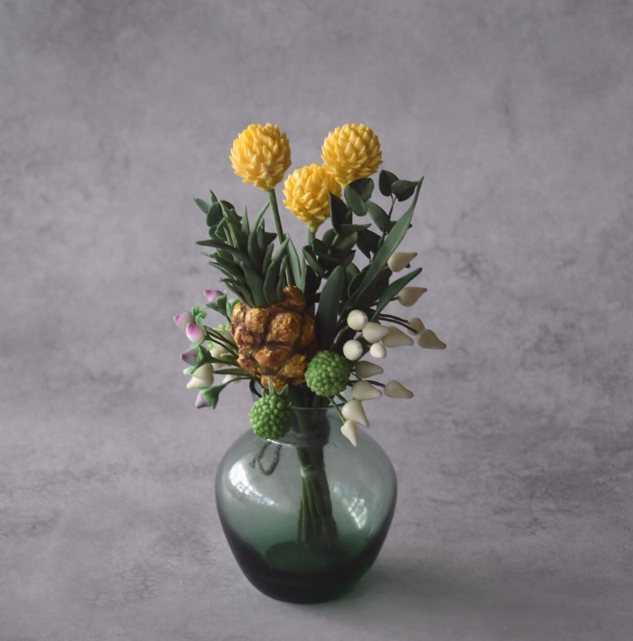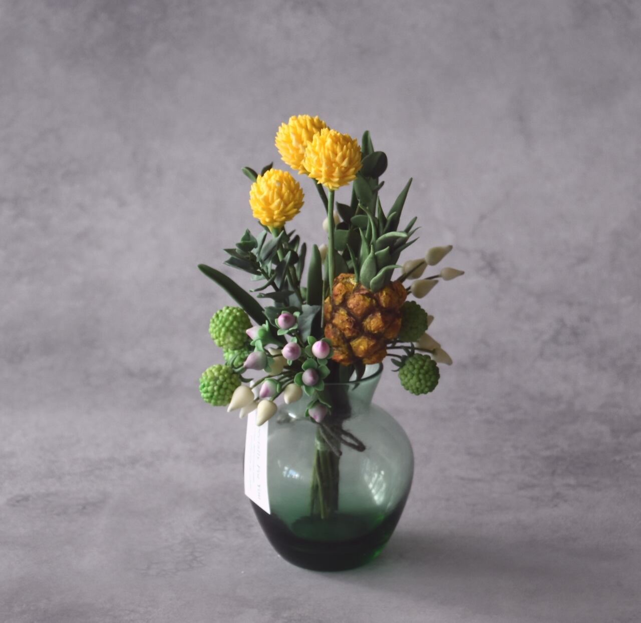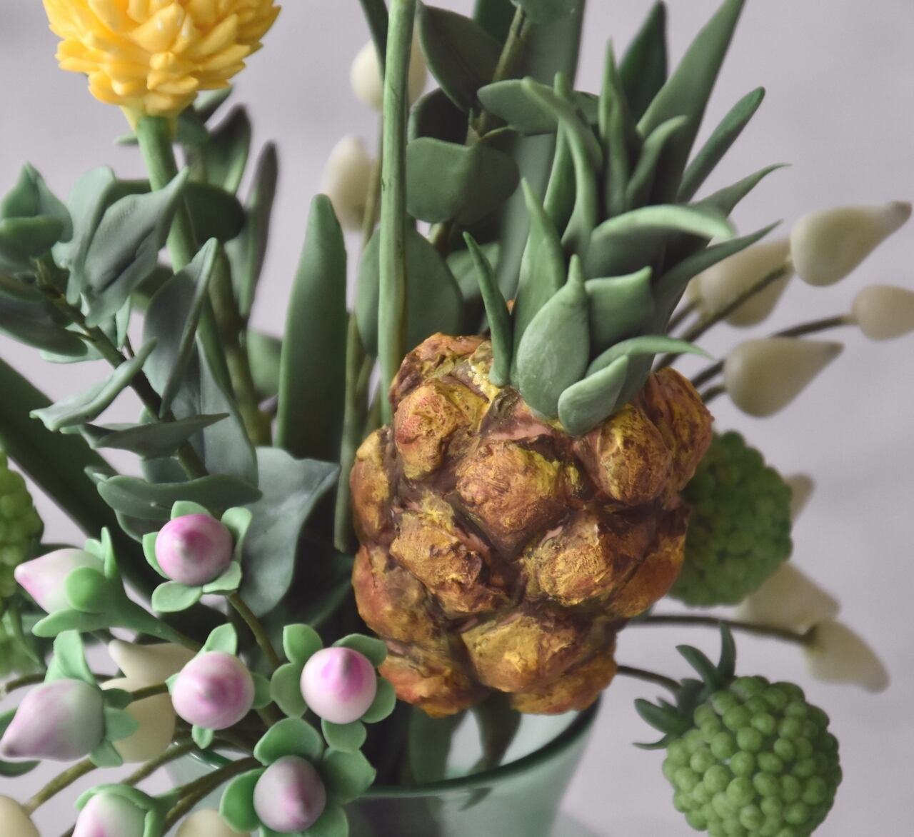 粘土で制作した、ミニパイナップルとビリーボタン(クラスペディア)のアレンジです。