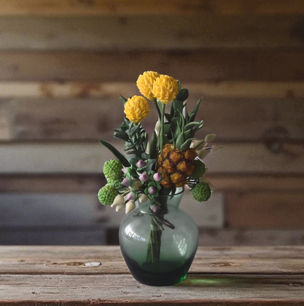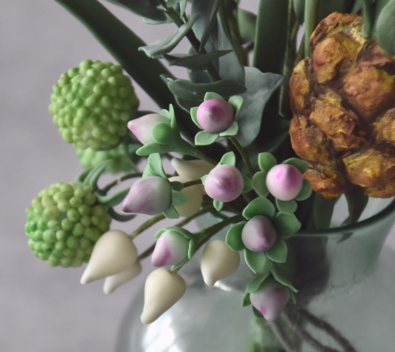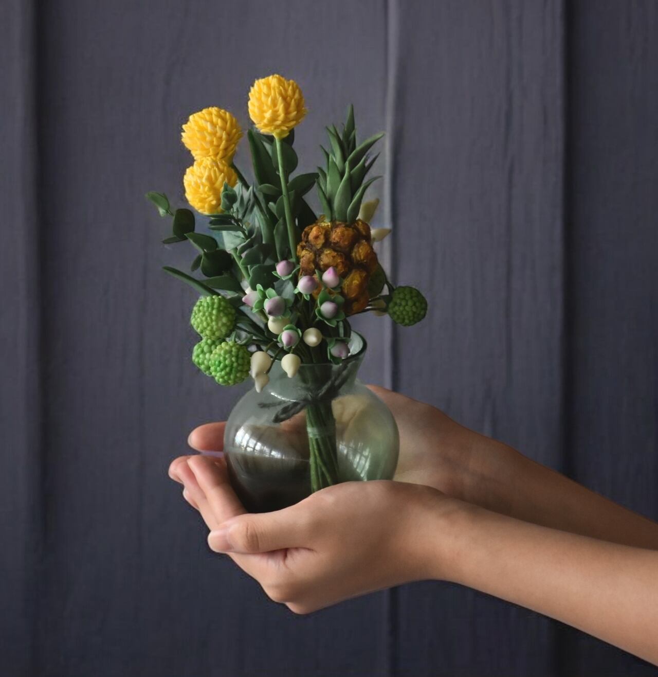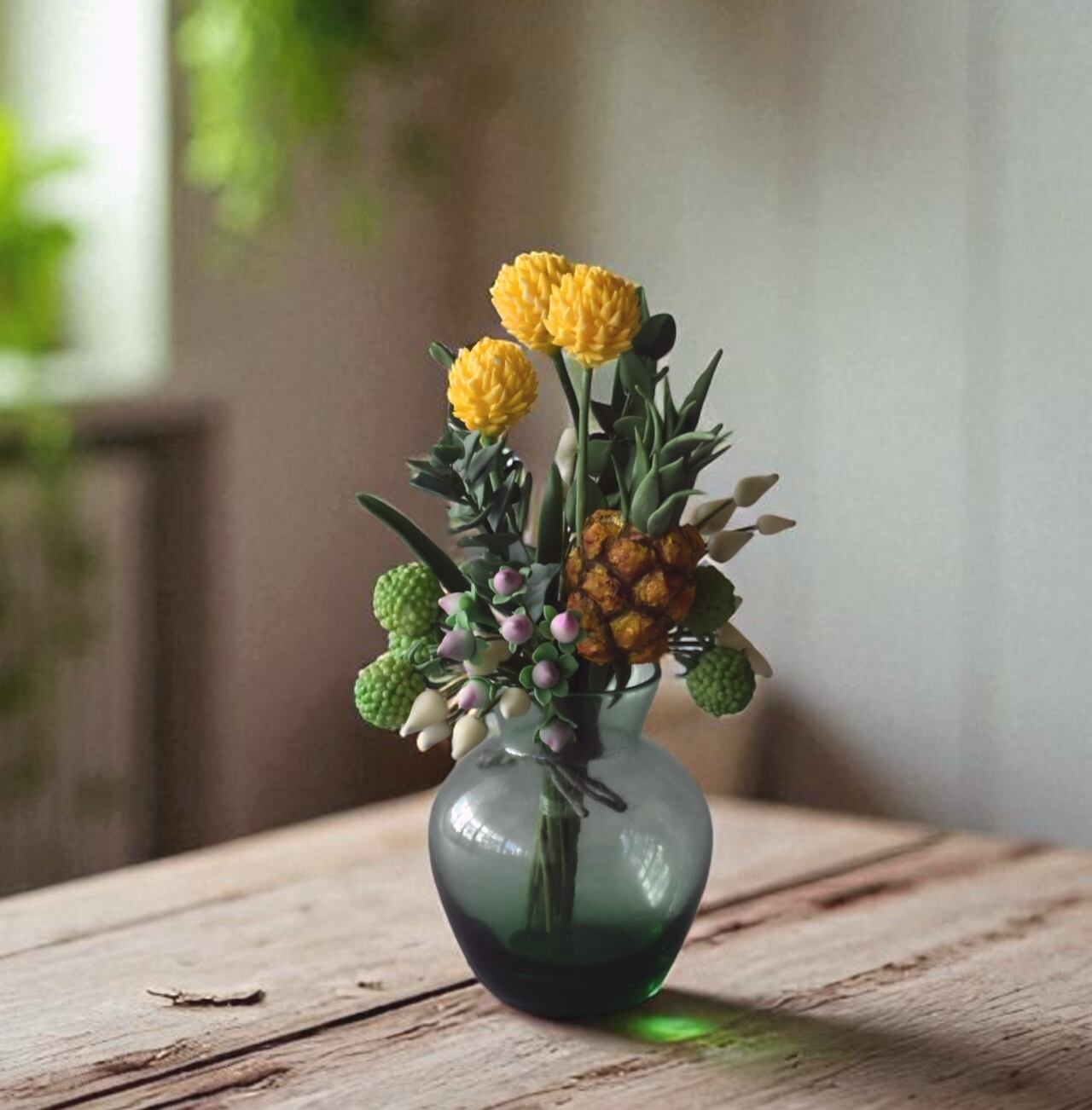 粘土で制作した、ミニパイナップルとビリーボタン(クラスペディア)のアレンジです。