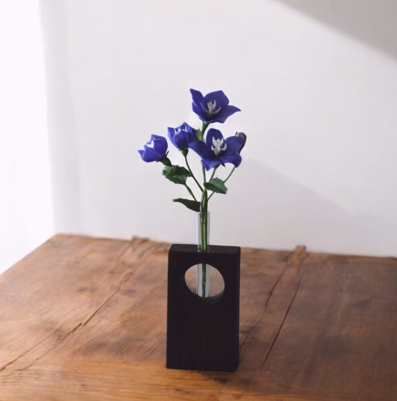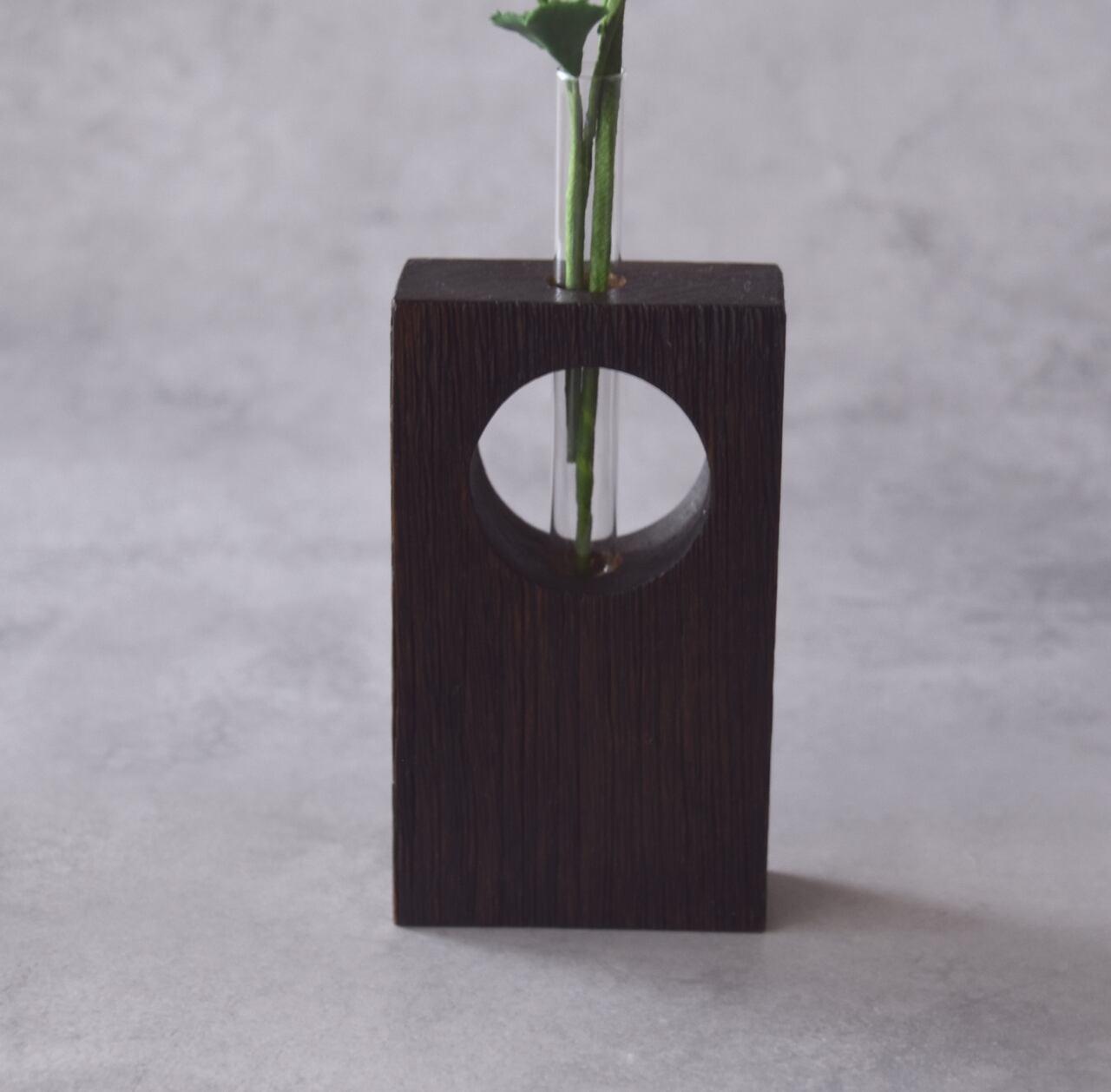 お花を生けている一輪挿しは、世界三大銘木のひとつであるチーク材の古材を使用したフラワーベースです。