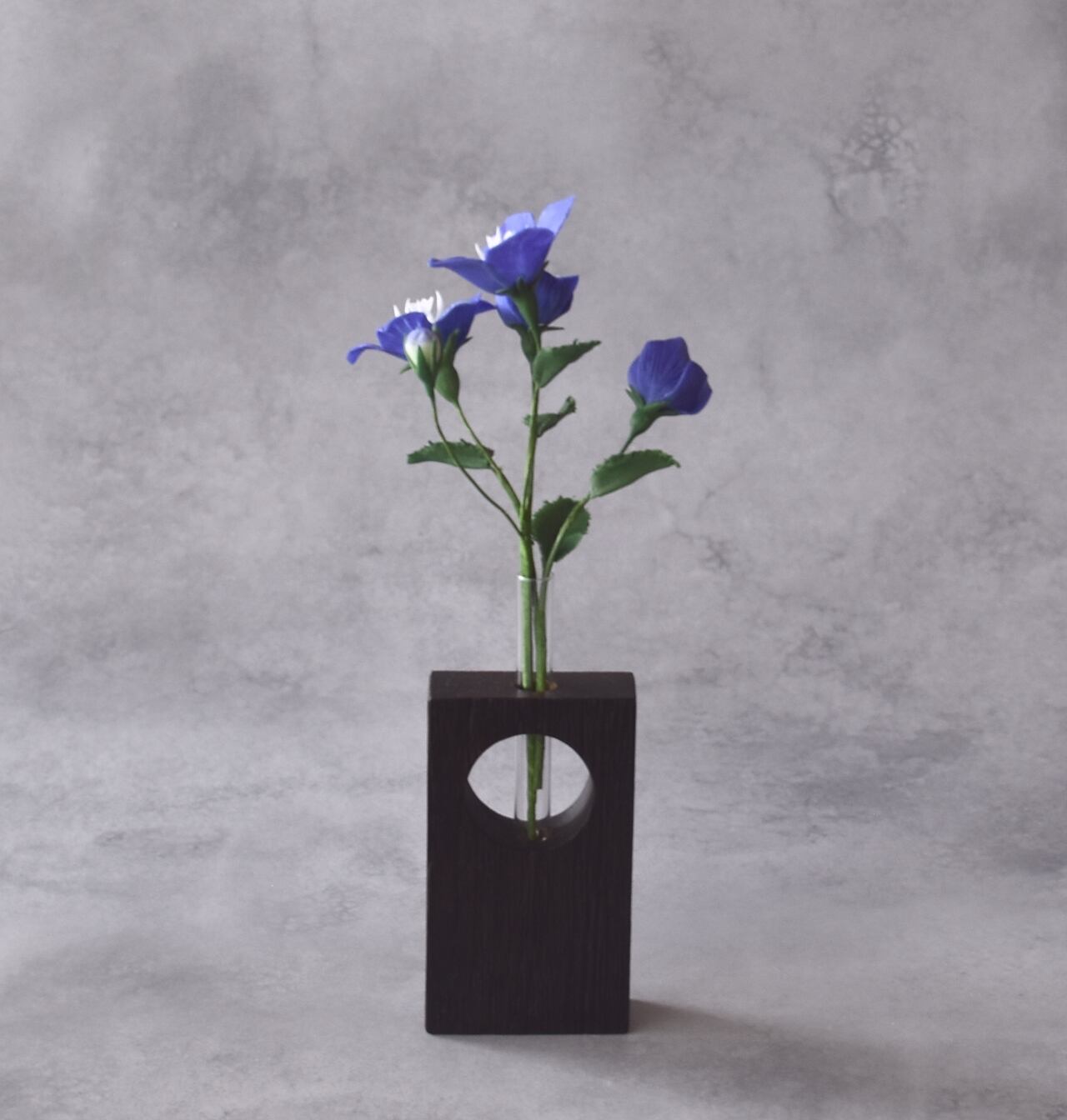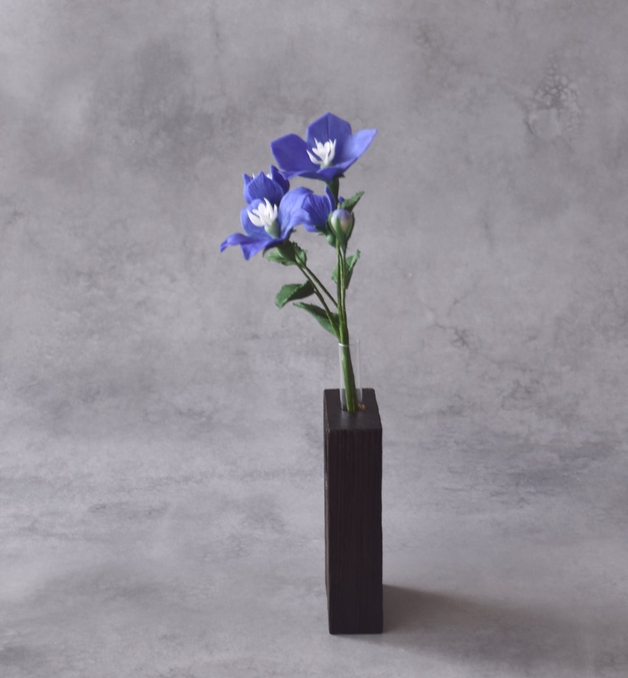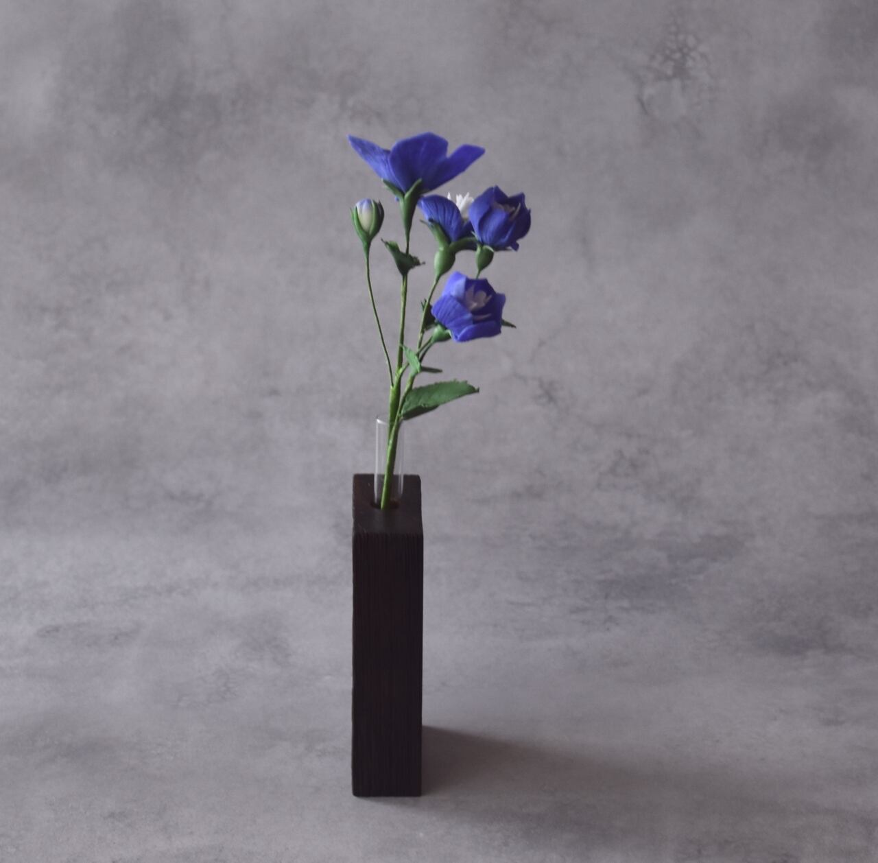 花びらは一枚一枚丁寧に薄く伸ばし、青紫色のふっくらとした、やさしい印象の花に仕上げています。