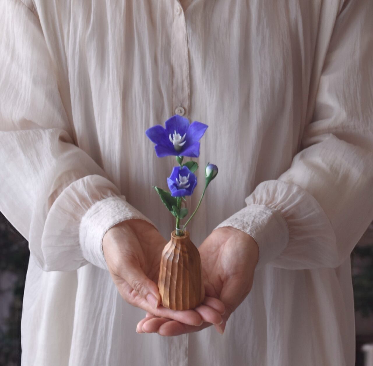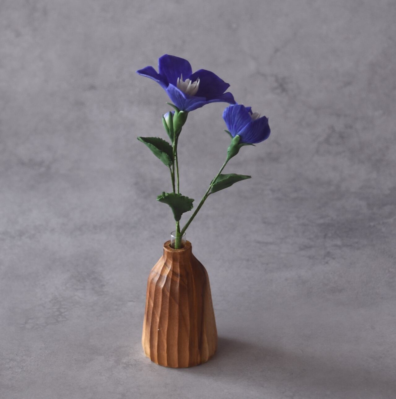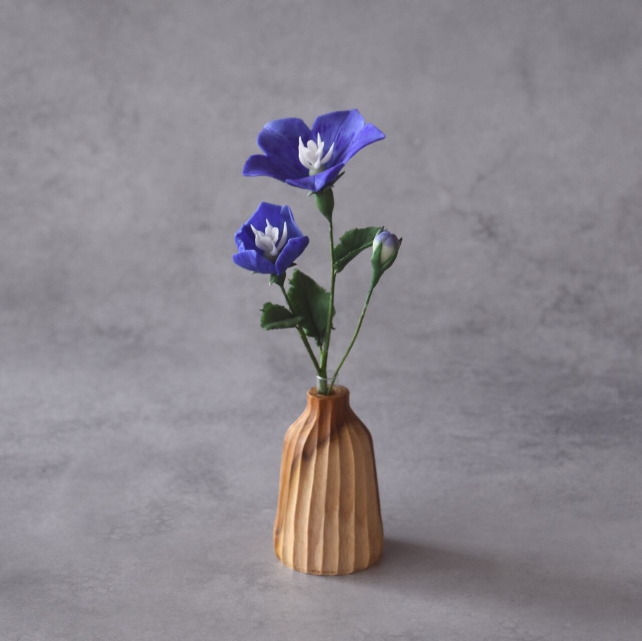 花びらは一枚一枚丁寧に薄く伸ばし、青紫色のふっくらとした、やさしい印象の花に仕上げています。