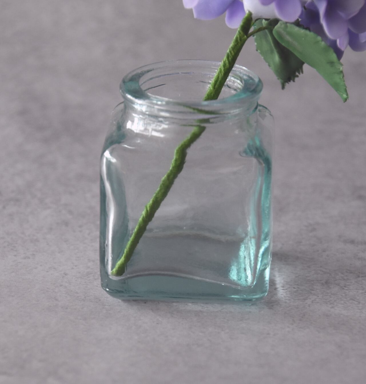 お花を生けている花瓶は、爽やかなブルーカラーが特徴のガラスボトルです。