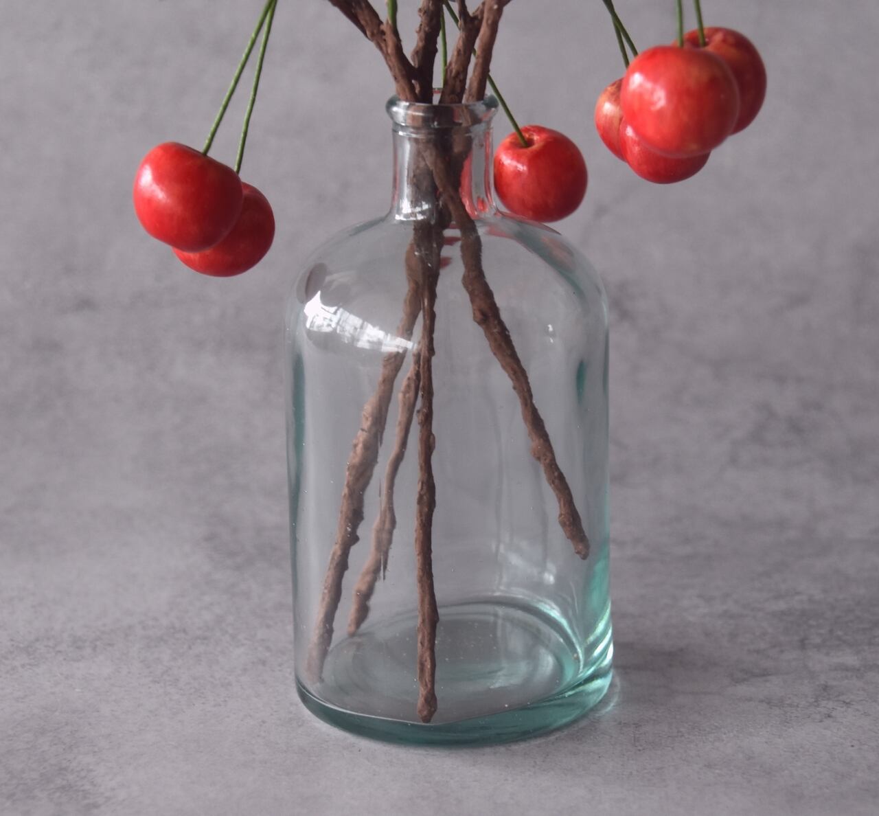 生けている花瓶は、薄いブルーカラーが特徴の爽やかなガラスボトルです。