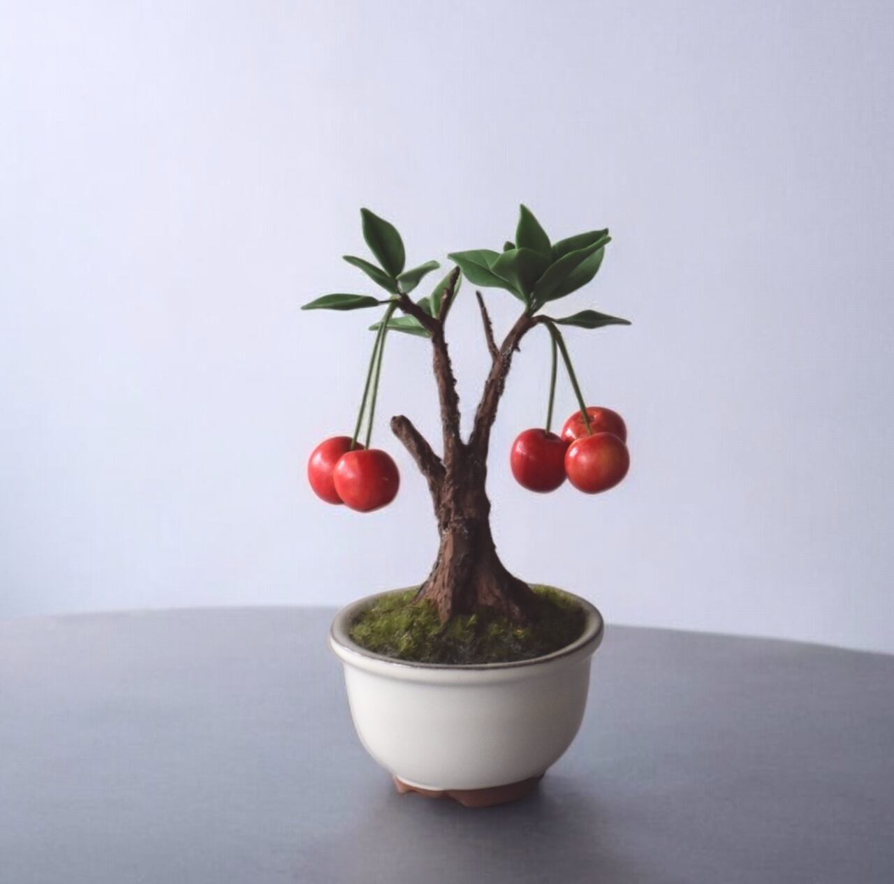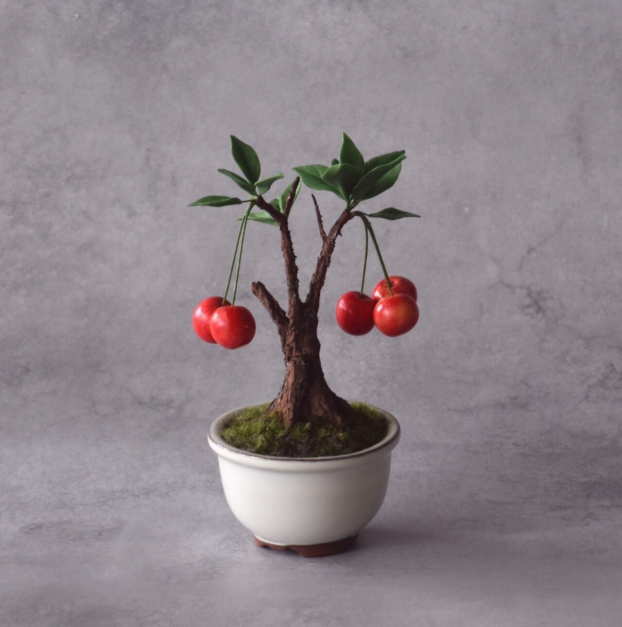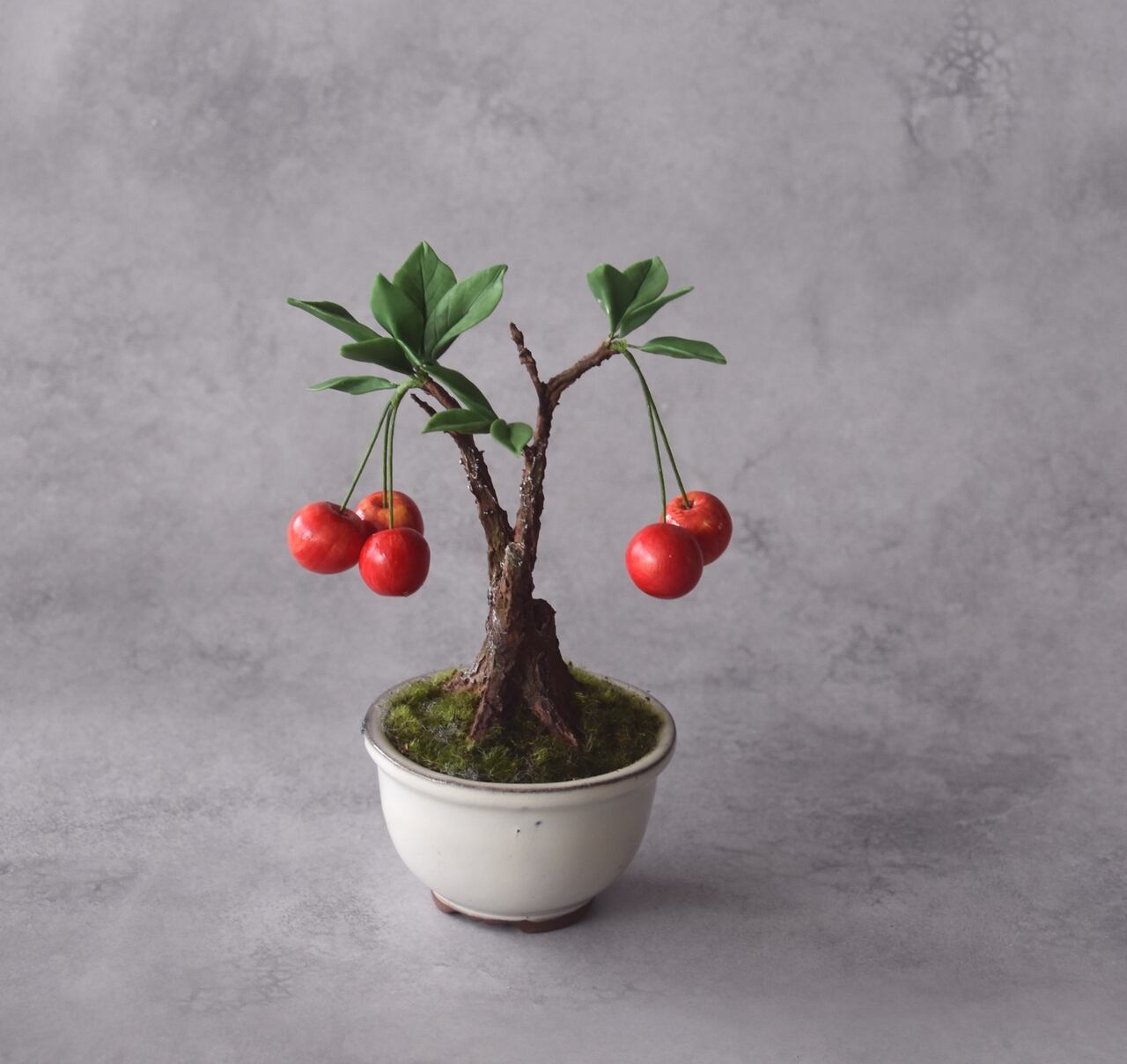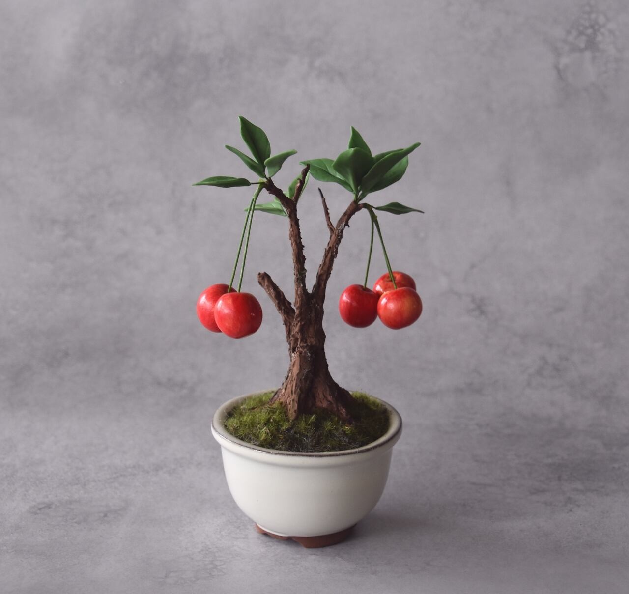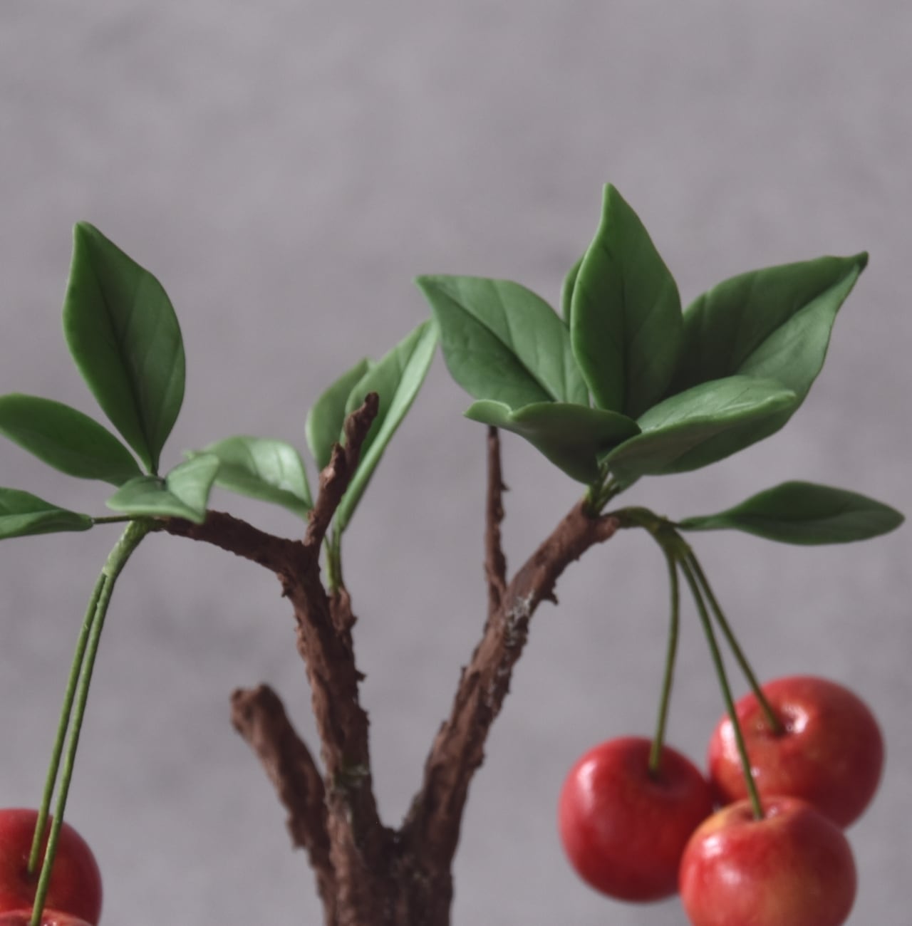 粘土で一つひとつ丁寧に制作し、太い幹に細い枝とさくらんぼをバランスよく配置しました。