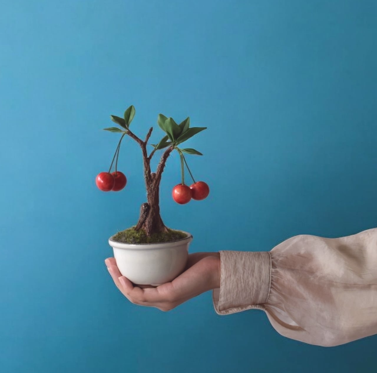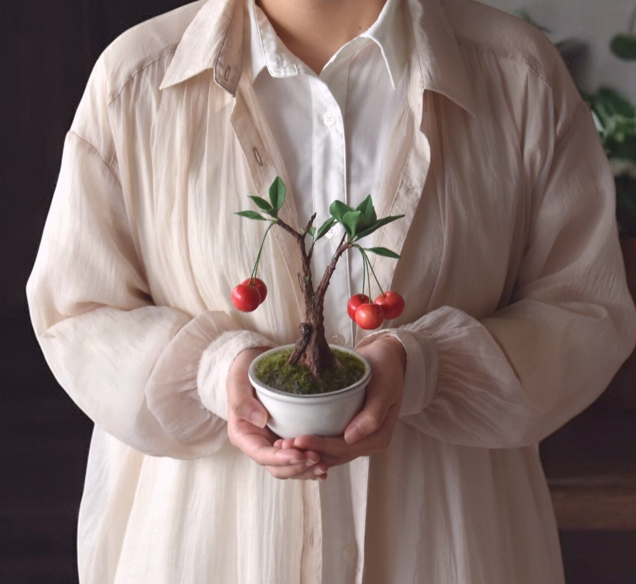 手のひらに収まる、小さなさくらんぼ盆栽。