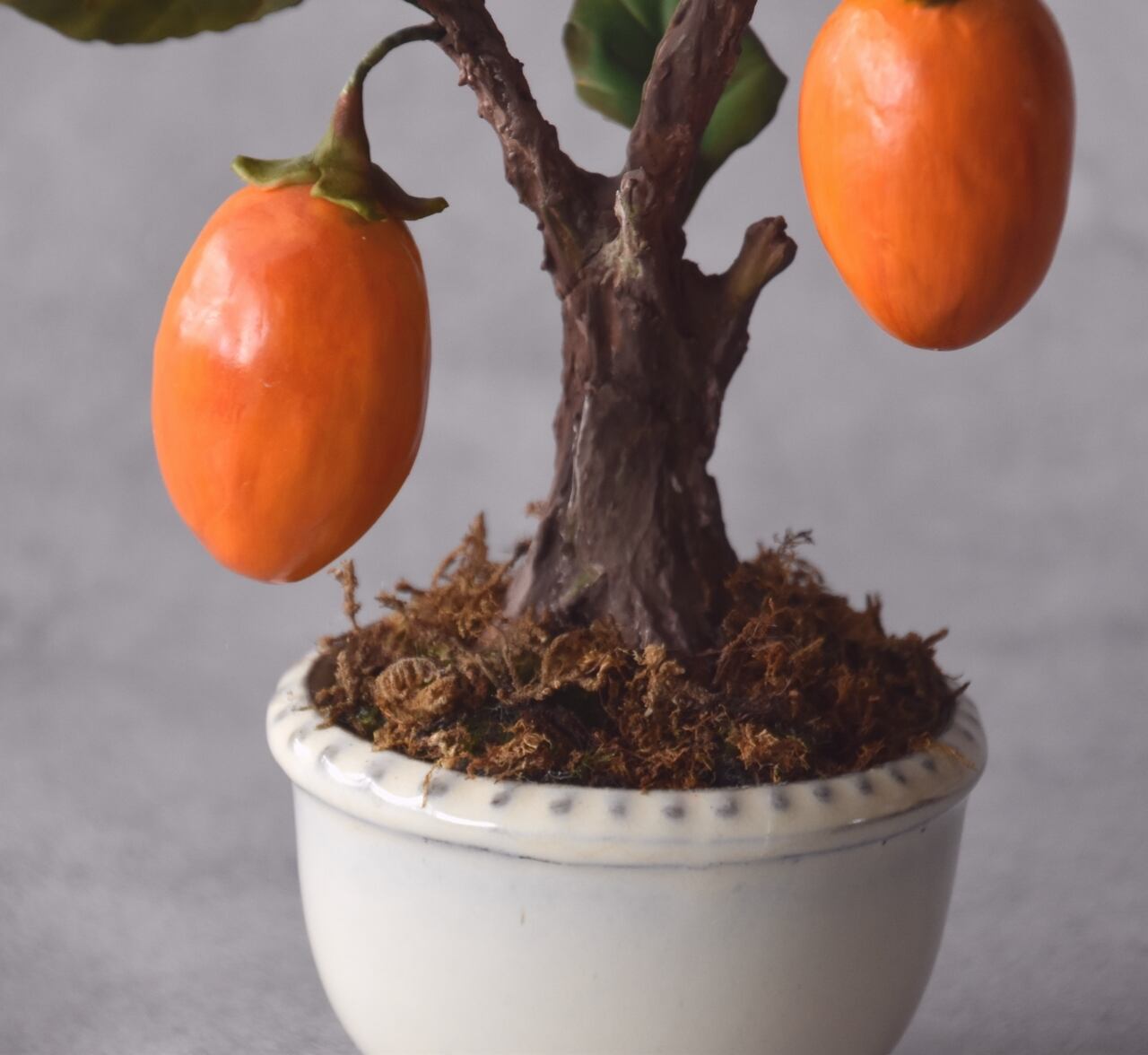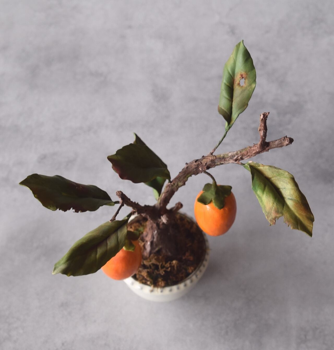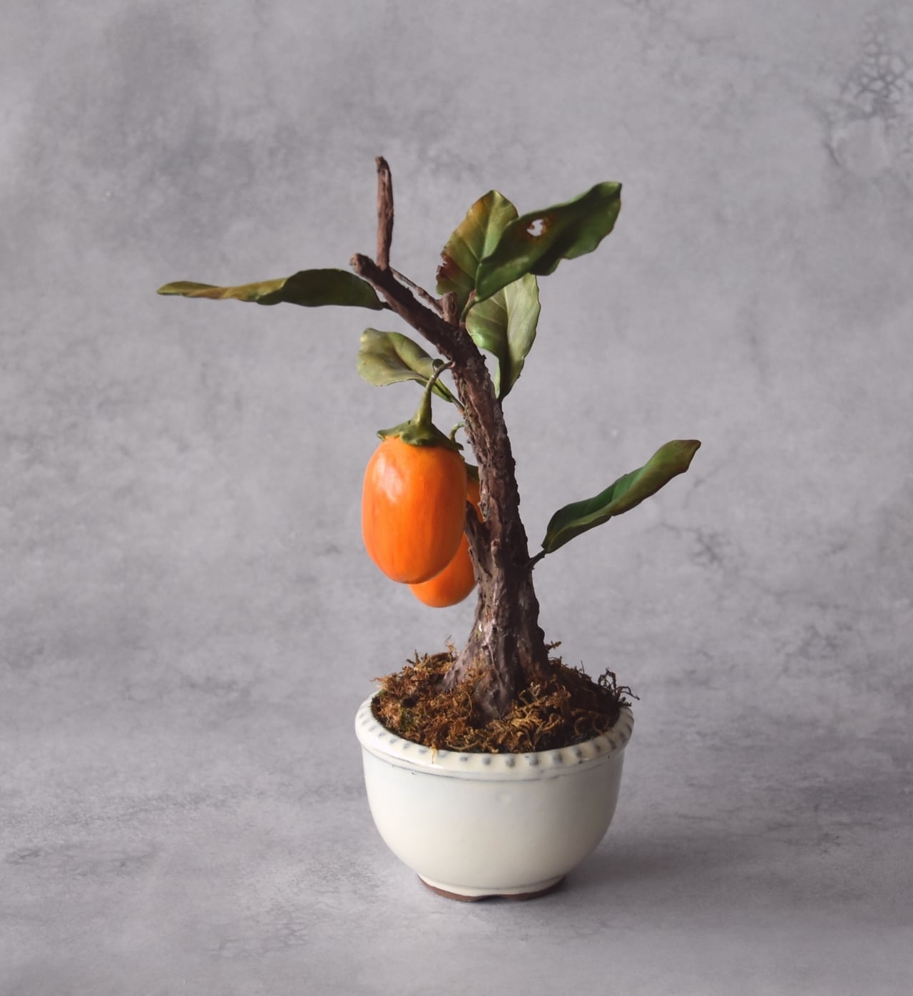 粘土で一つひとつ丁寧に制作し、太い幹に細い枝と柿【ロウヤガキ(老爺柿)】をバランスよく配置しました。