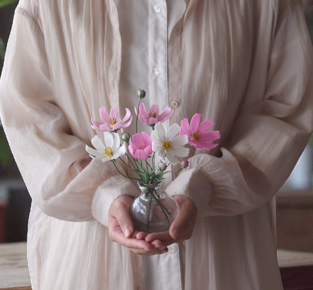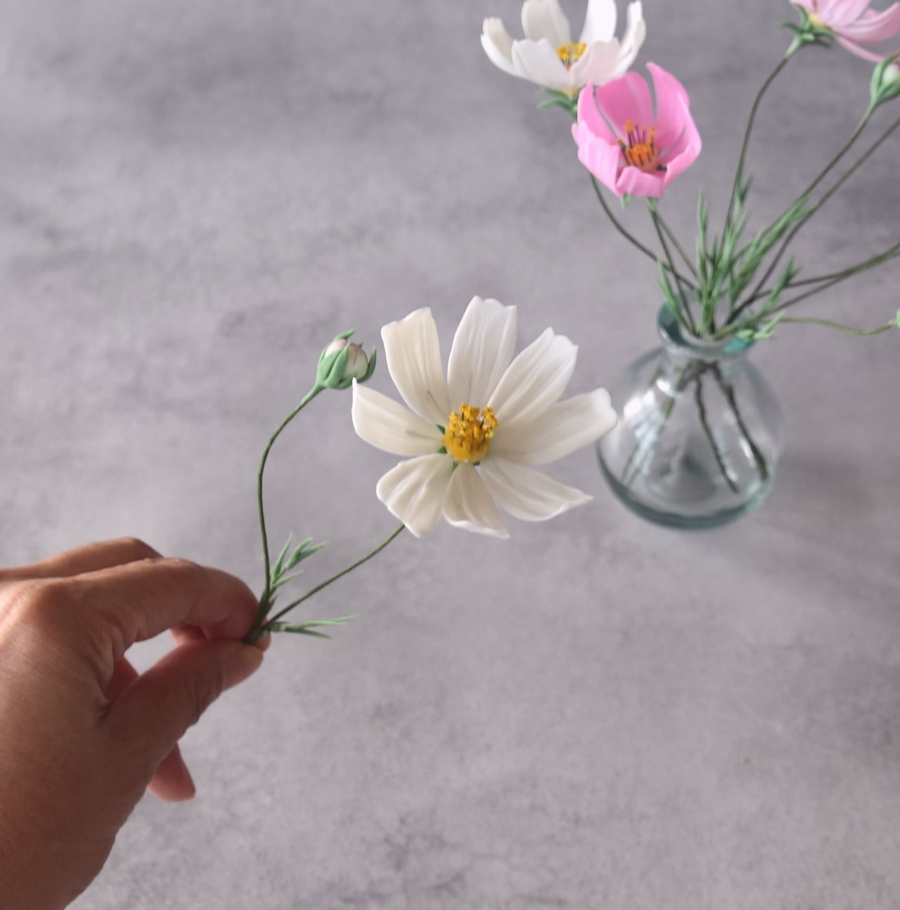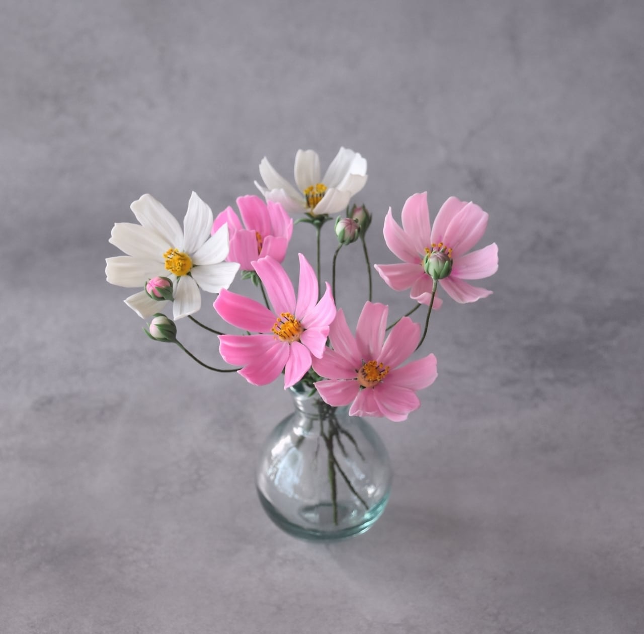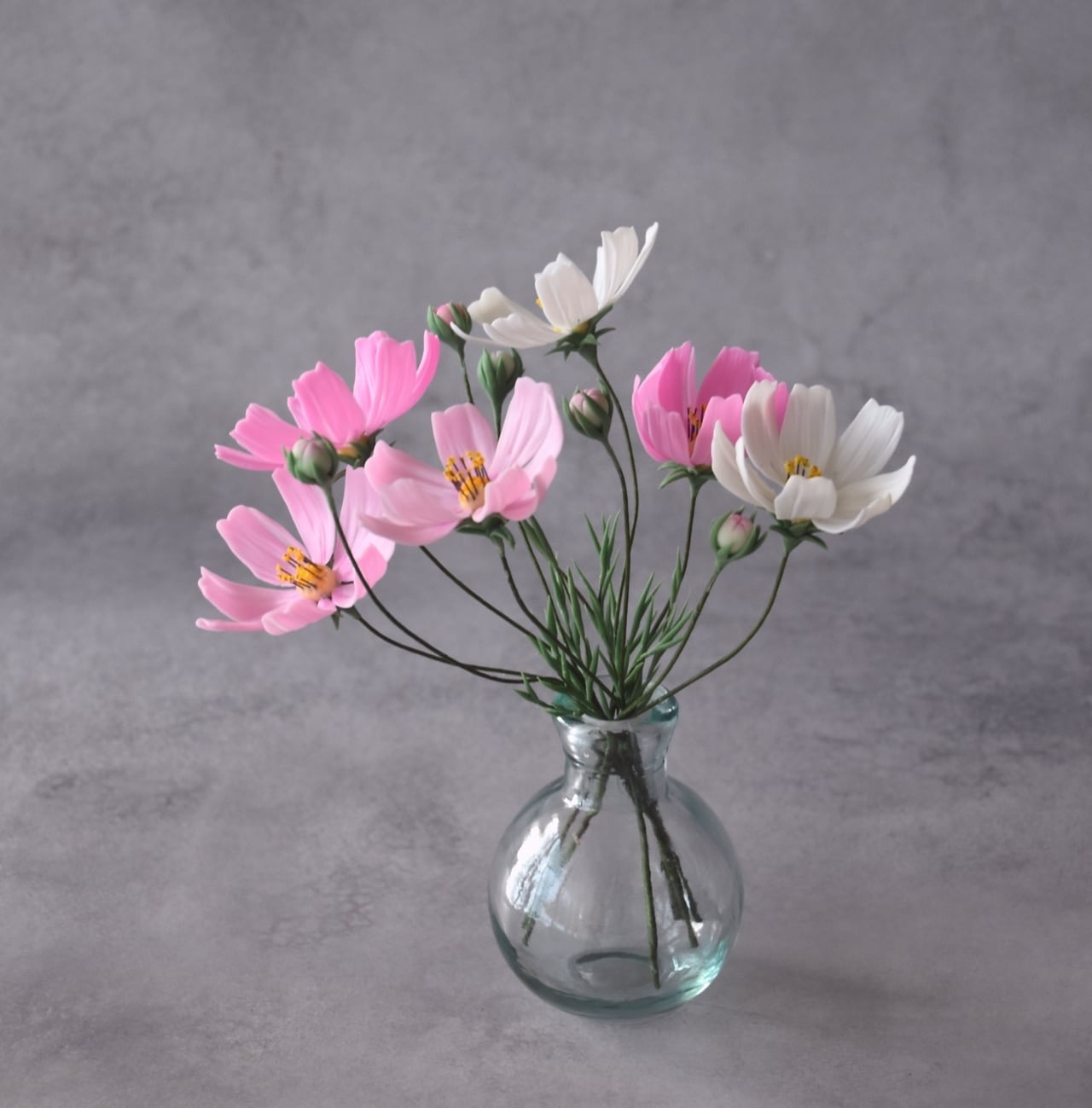 コスモスの花びらは、一枚一枚丁寧に粘土を薄く伸ばして成形しました。淡いピンク色がやさしく、ホワイトのコスモスと合わさって、秋にぴったりの爽やかなアレンジに仕上がっています。