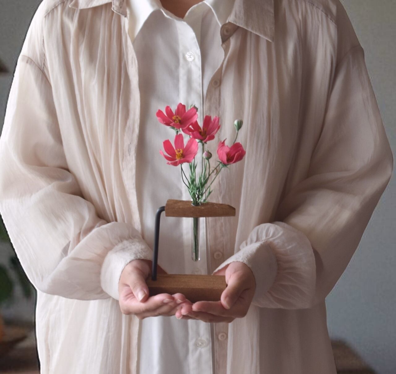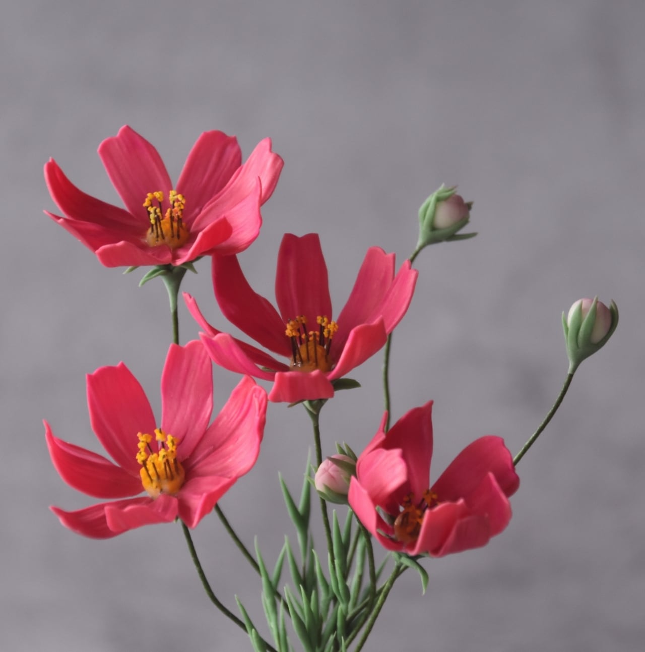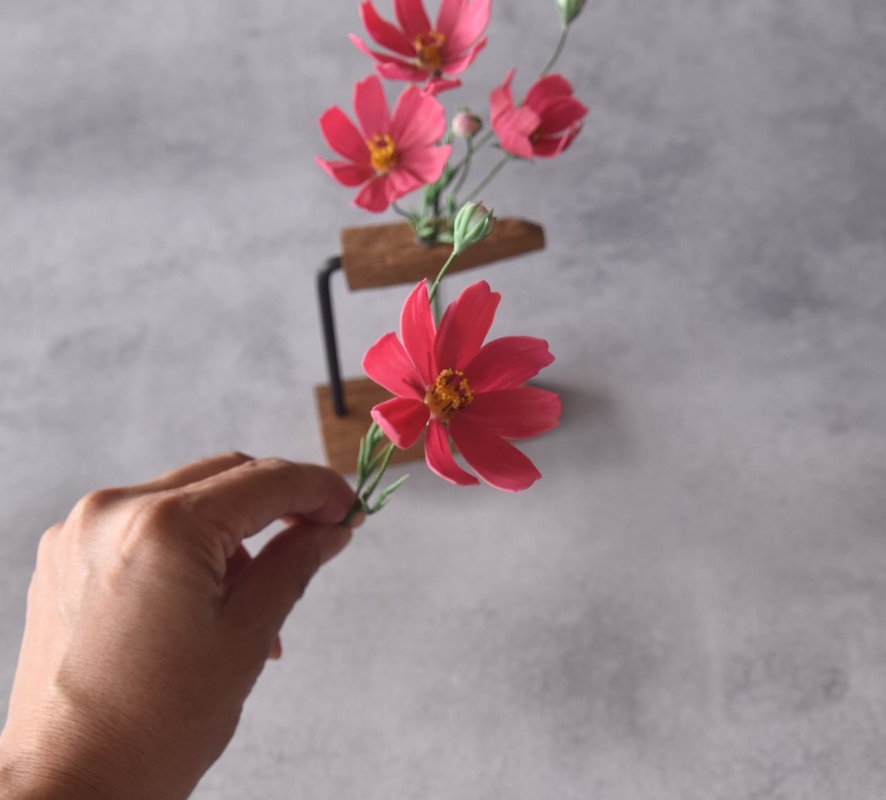 コスモスの花びらは、一枚一枚、粘土を丁寧に薄く伸ばして成形しました。風に揺れるようなやわらかなシルエットが、秋にぴったりの爽やかなアレンジに仕上がっています。