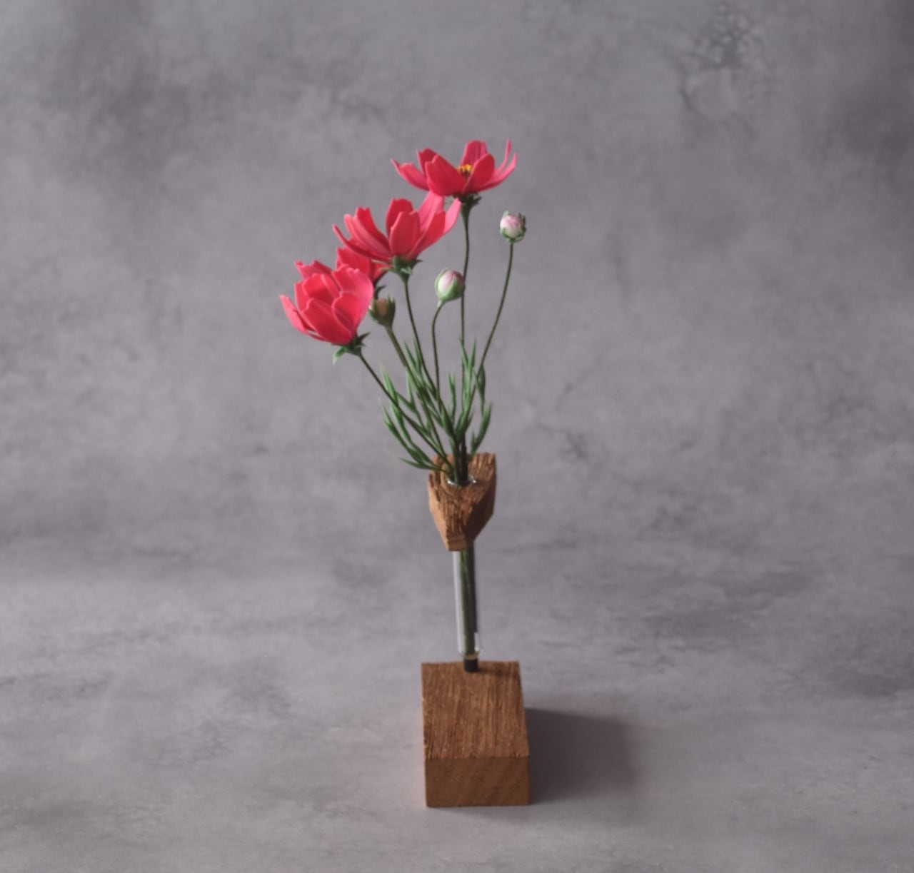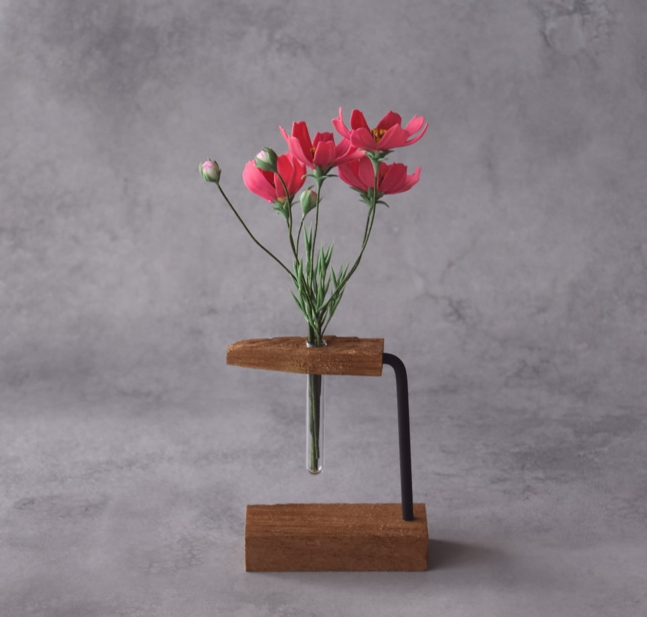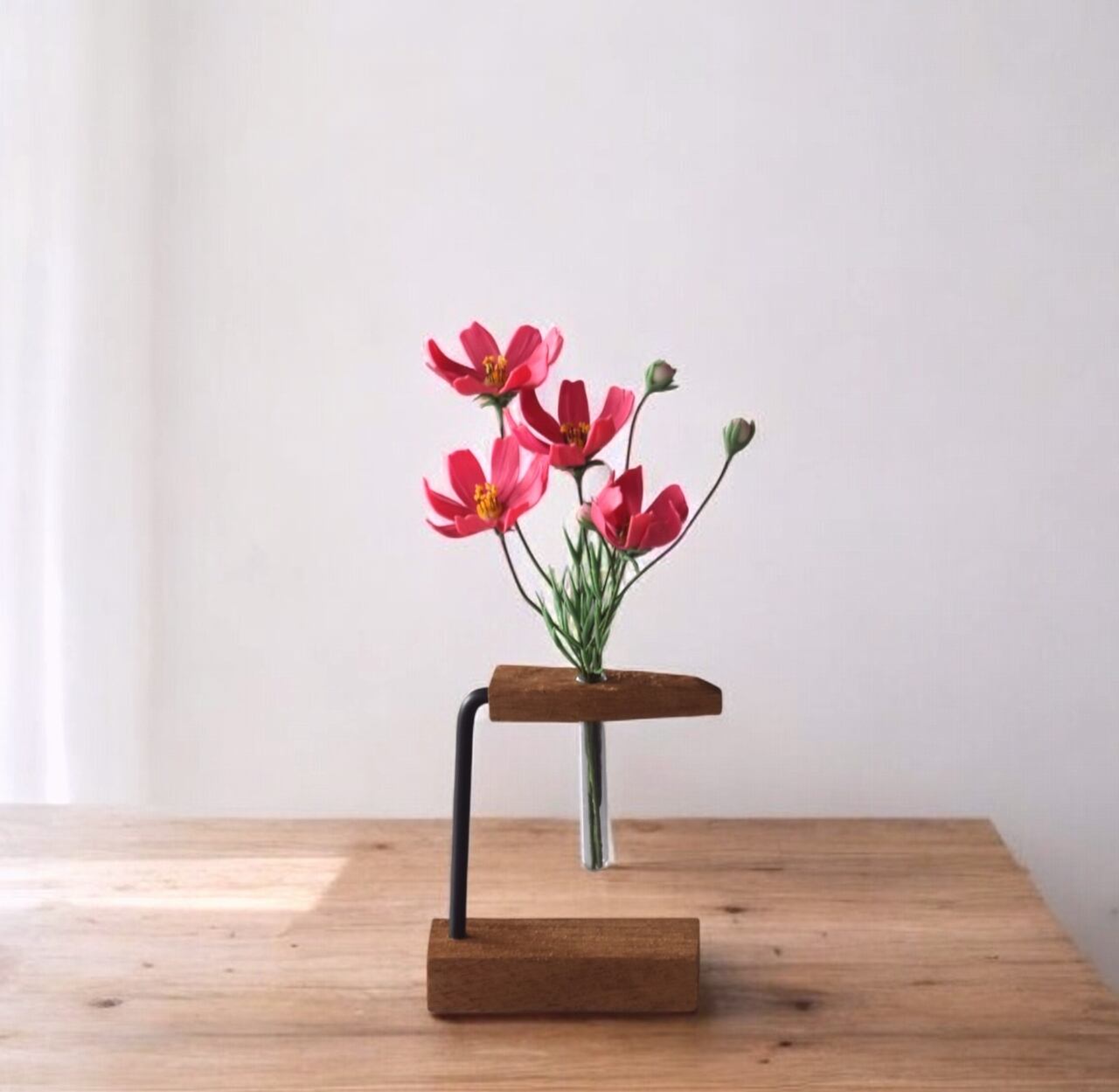 生けている一輪挿しは、古材を使用しており、小さくても存在感バツグンです。