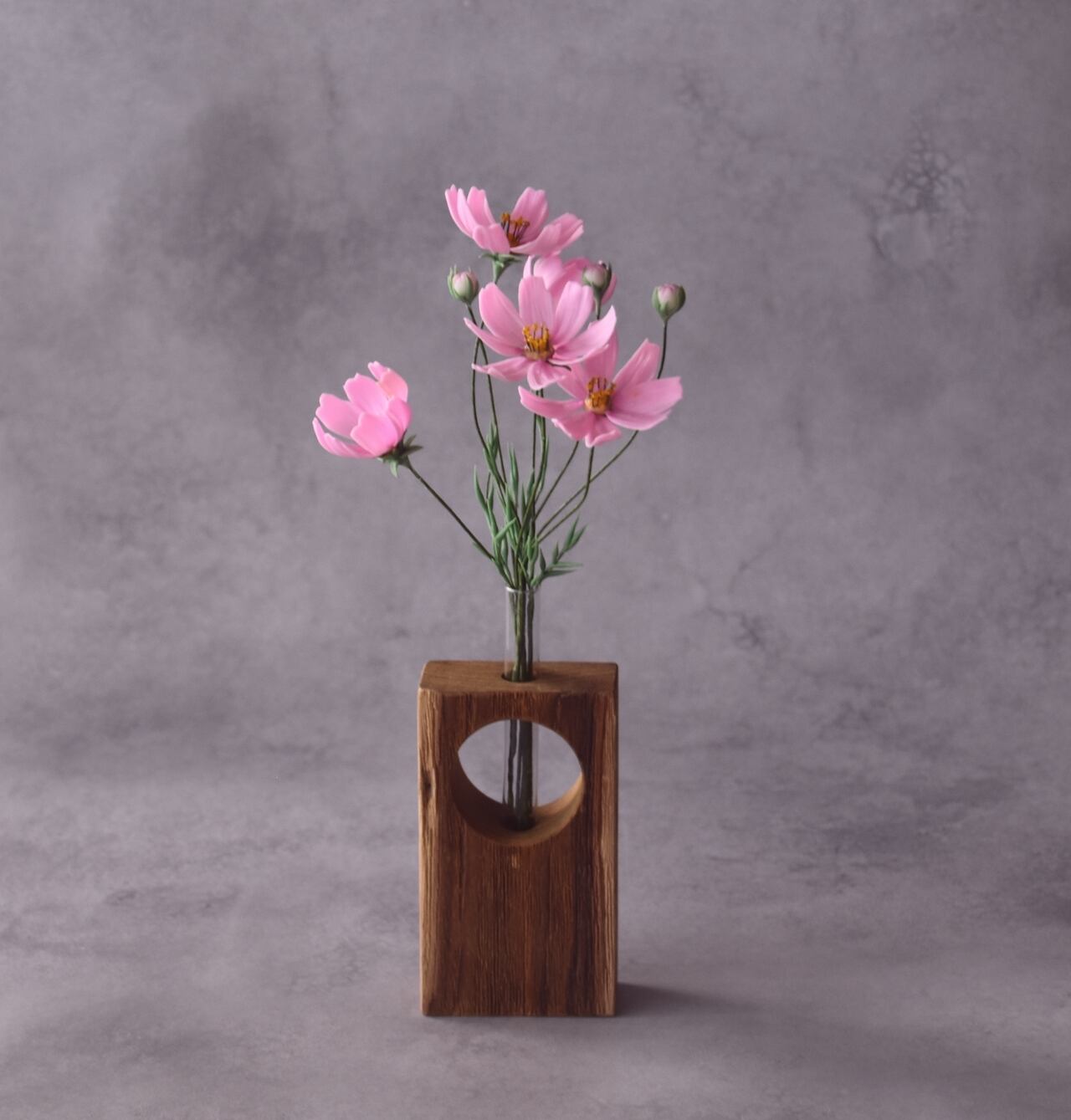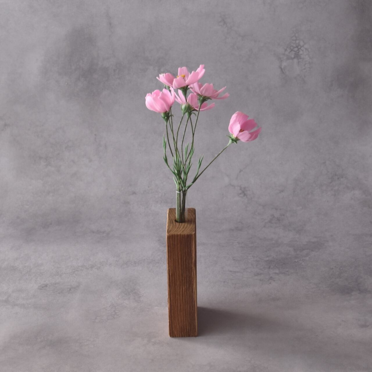 お花を生けている一輪挿しは、世界三大銘木のひとつであるチーク材の古材を使用したフラワーベースです。
