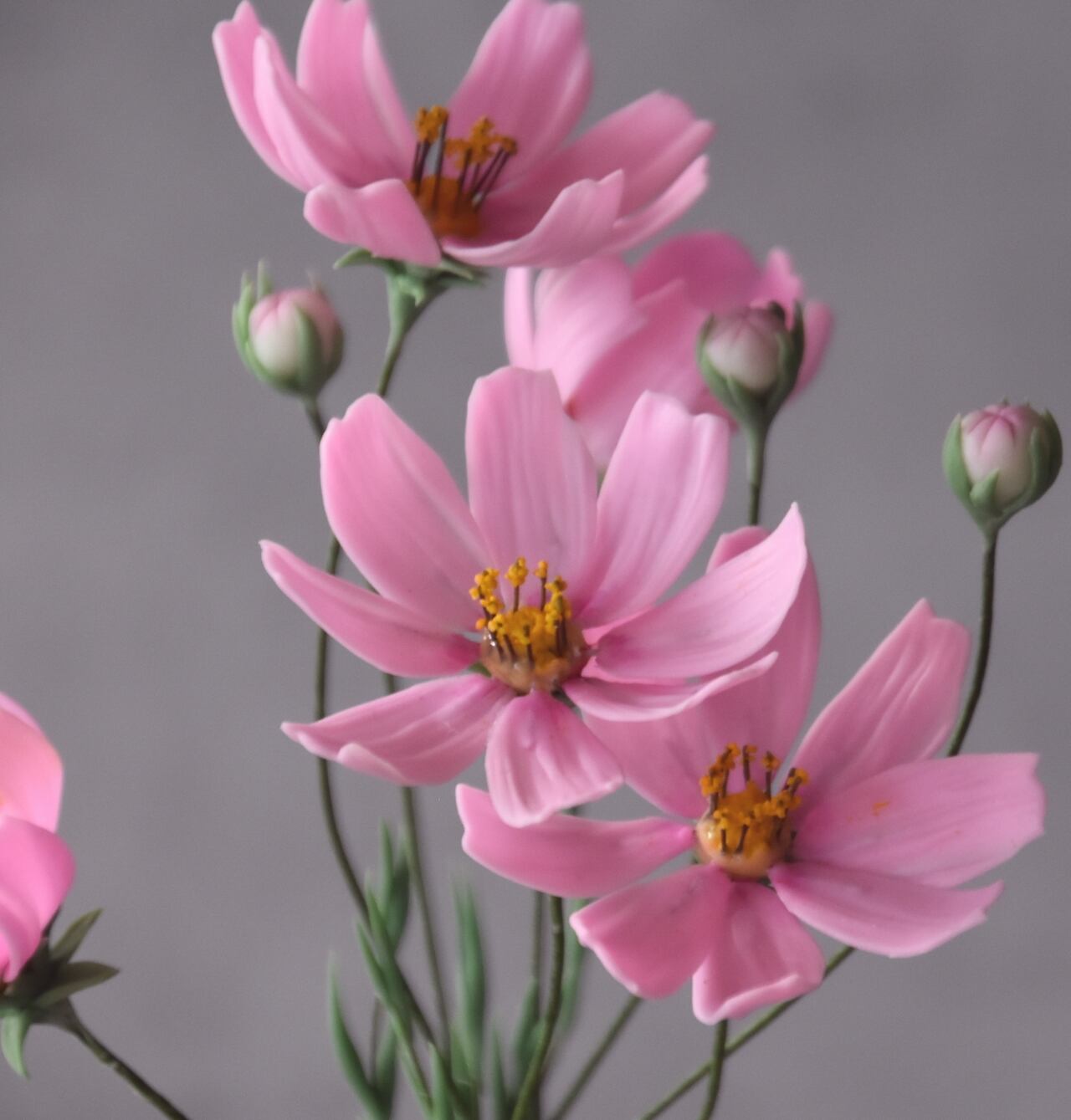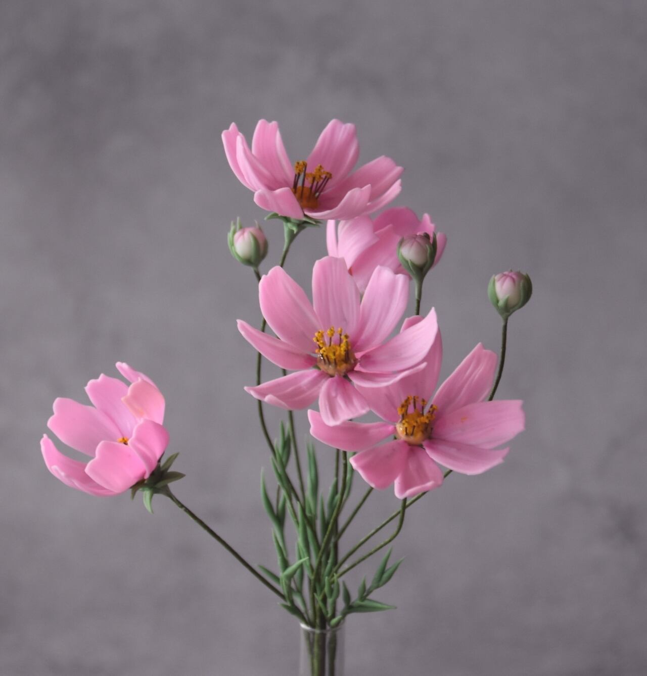 コスモスの花びらは、一枚一枚、粘土を丁寧に薄く伸ばして成形しました。風に揺れるようなやわらかなシルエットが、秋にぴったりの爽やかなアレンジに仕上がっています。