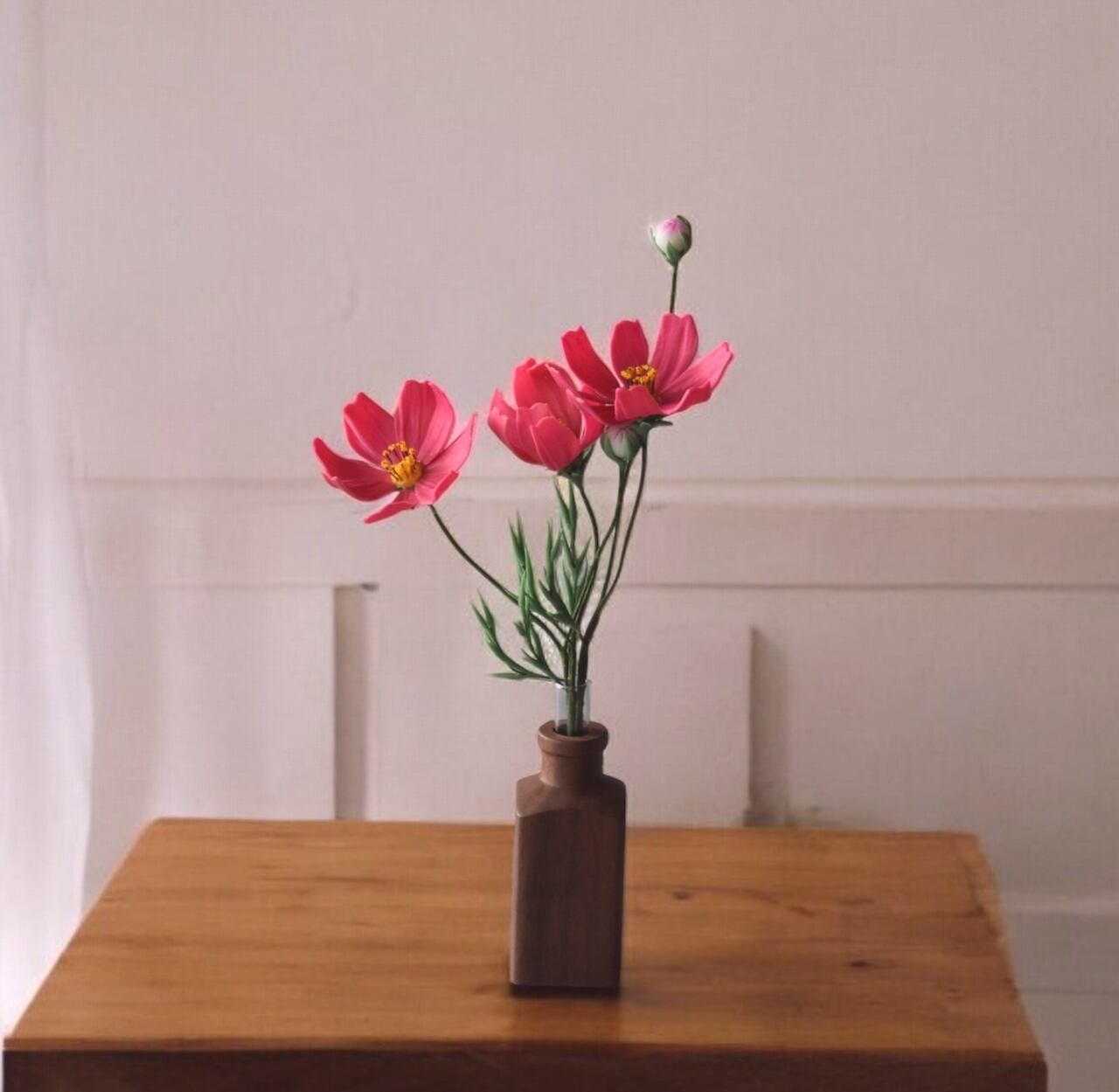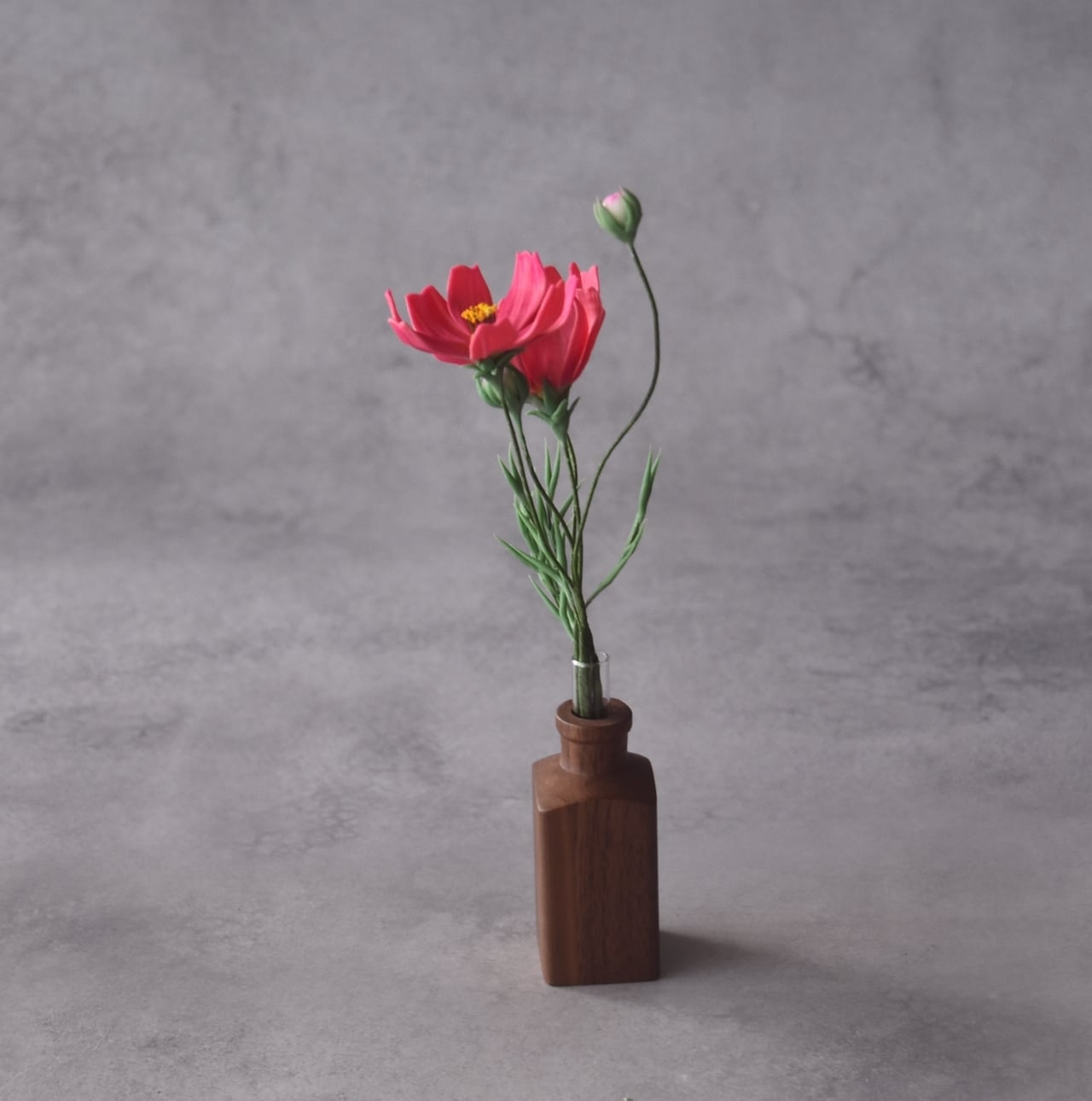 お花を生けている一輪挿しは、チーク材作られたフラットボトルです。