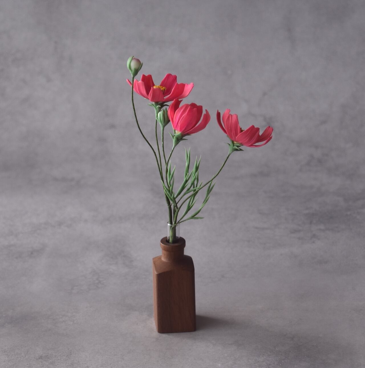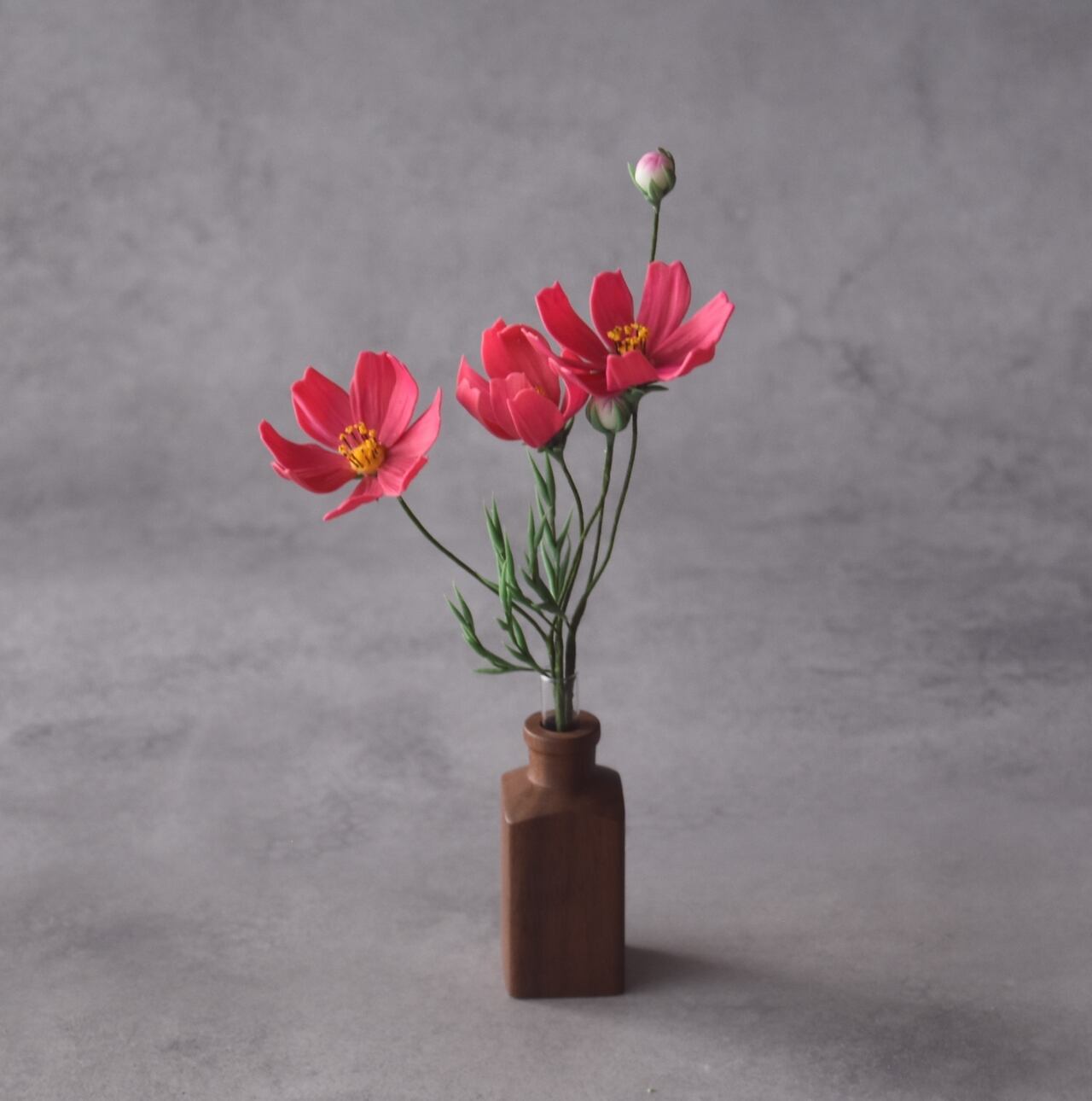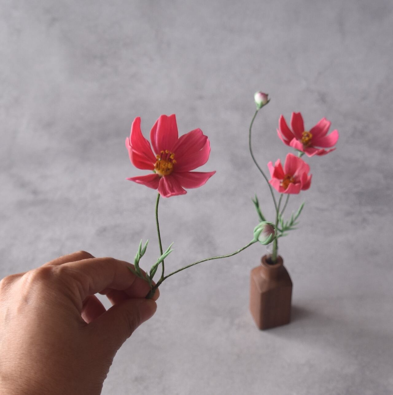 コスモスの花びらは、一枚一枚、粘土を丁寧に薄く伸ばして成形しました。風に揺れるようなやわらかなシルエットが、秋にぴったりの爽やかなアレンジに仕上がっています。