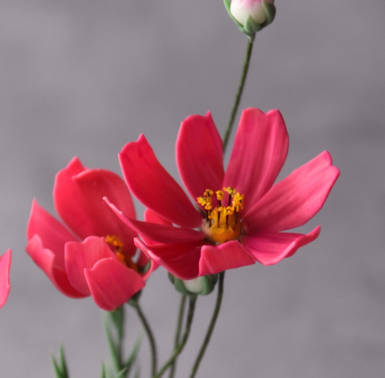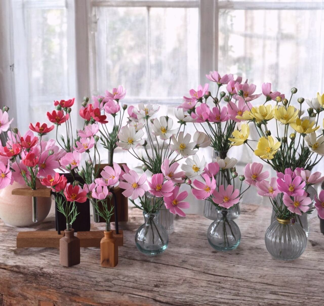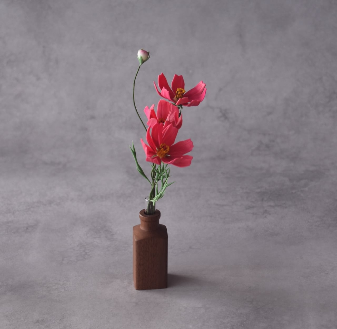 コスモスの花びらは、一枚一枚、粘土を丁寧に薄く伸ばして成形しました。風に揺れるようなやわらかなシルエットが、秋にぴったりの爽やかなアレンジに仕上がっています。