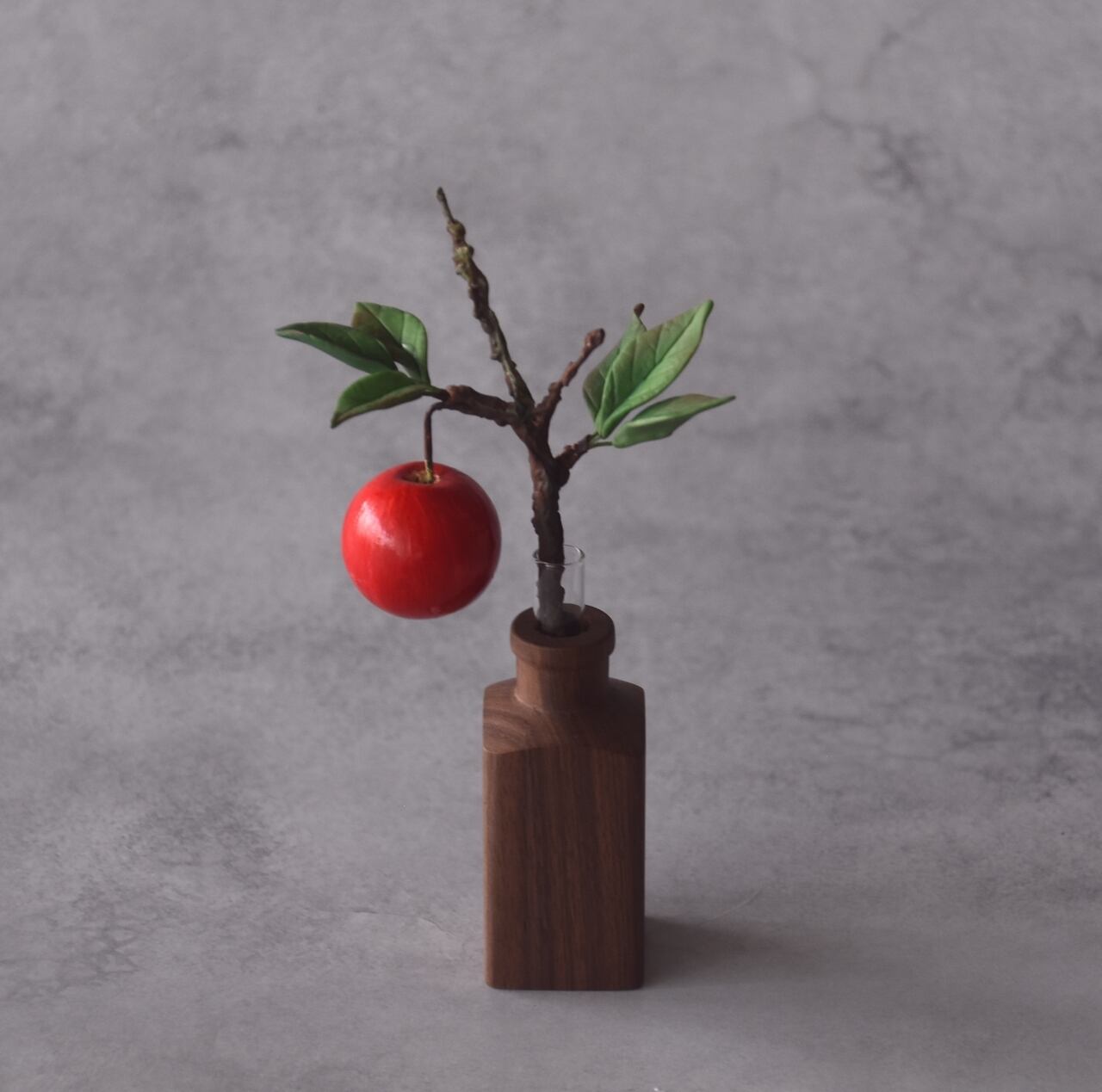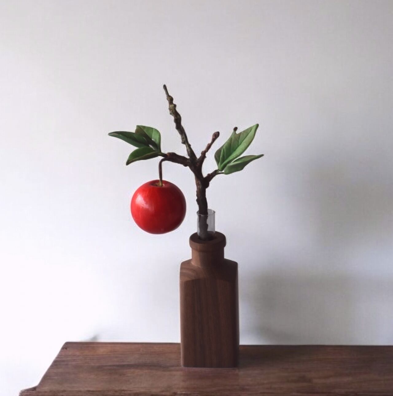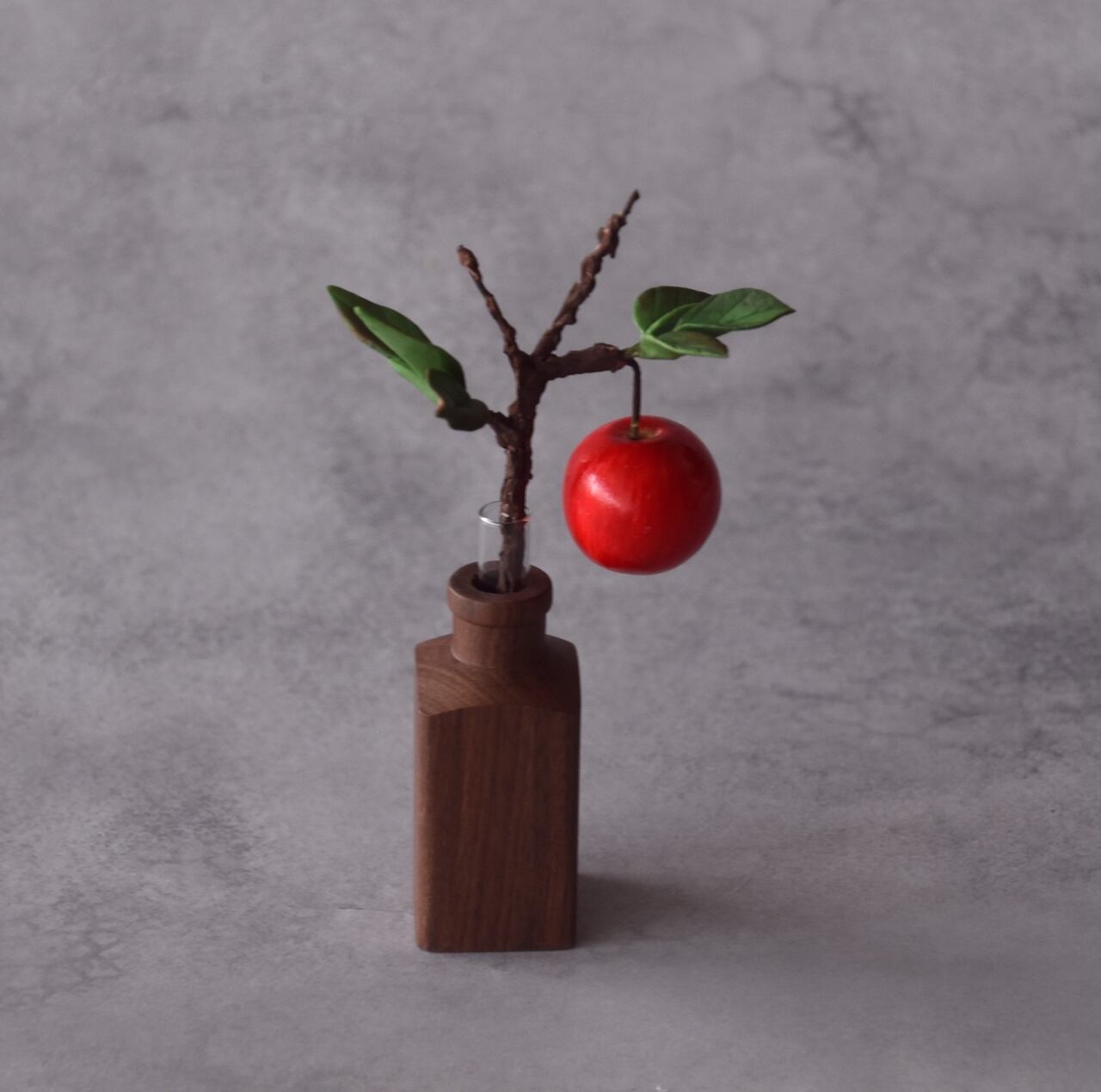 りんごを生けている一輪挿しは、チーク材作られたフラットボトルです。