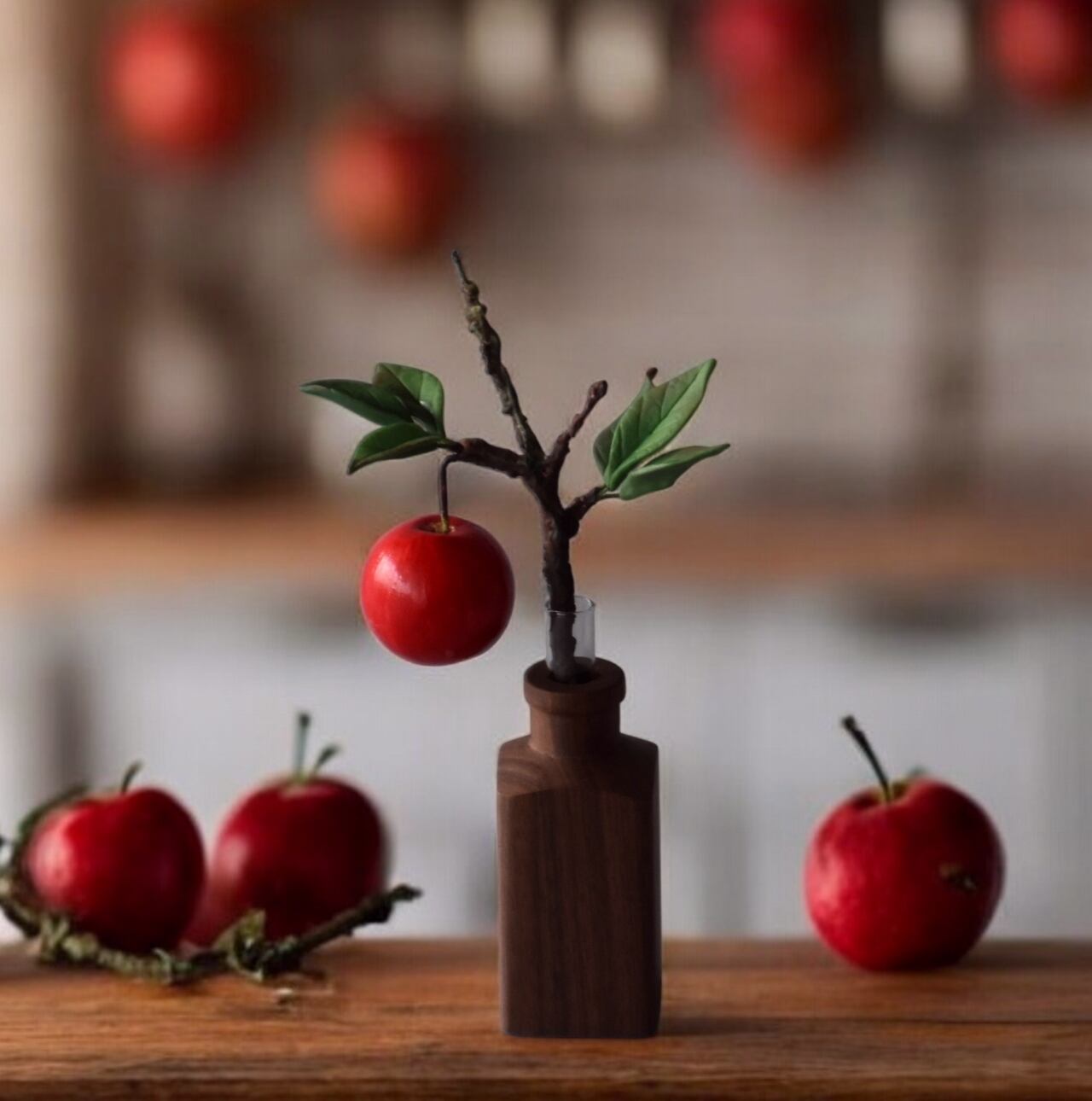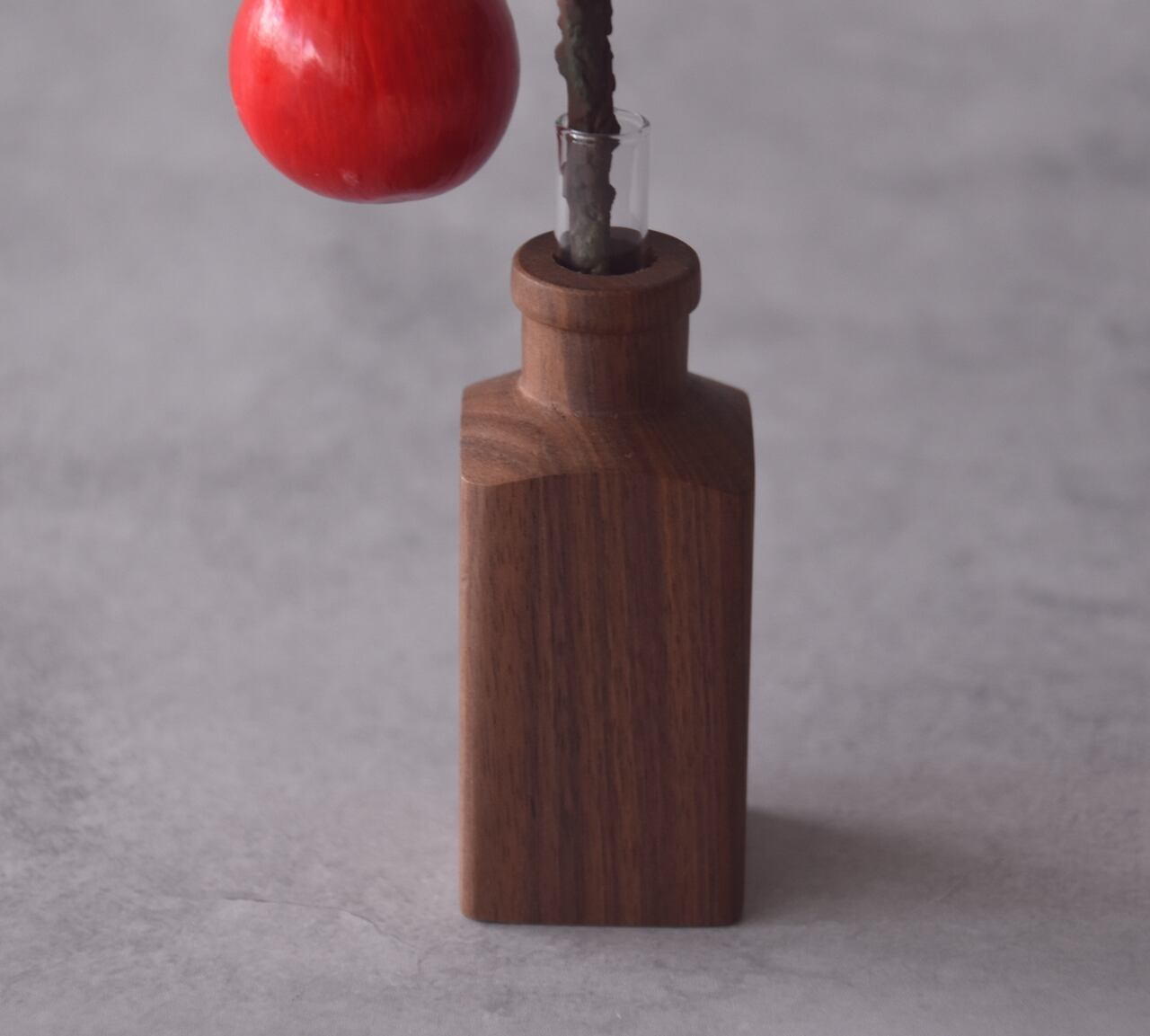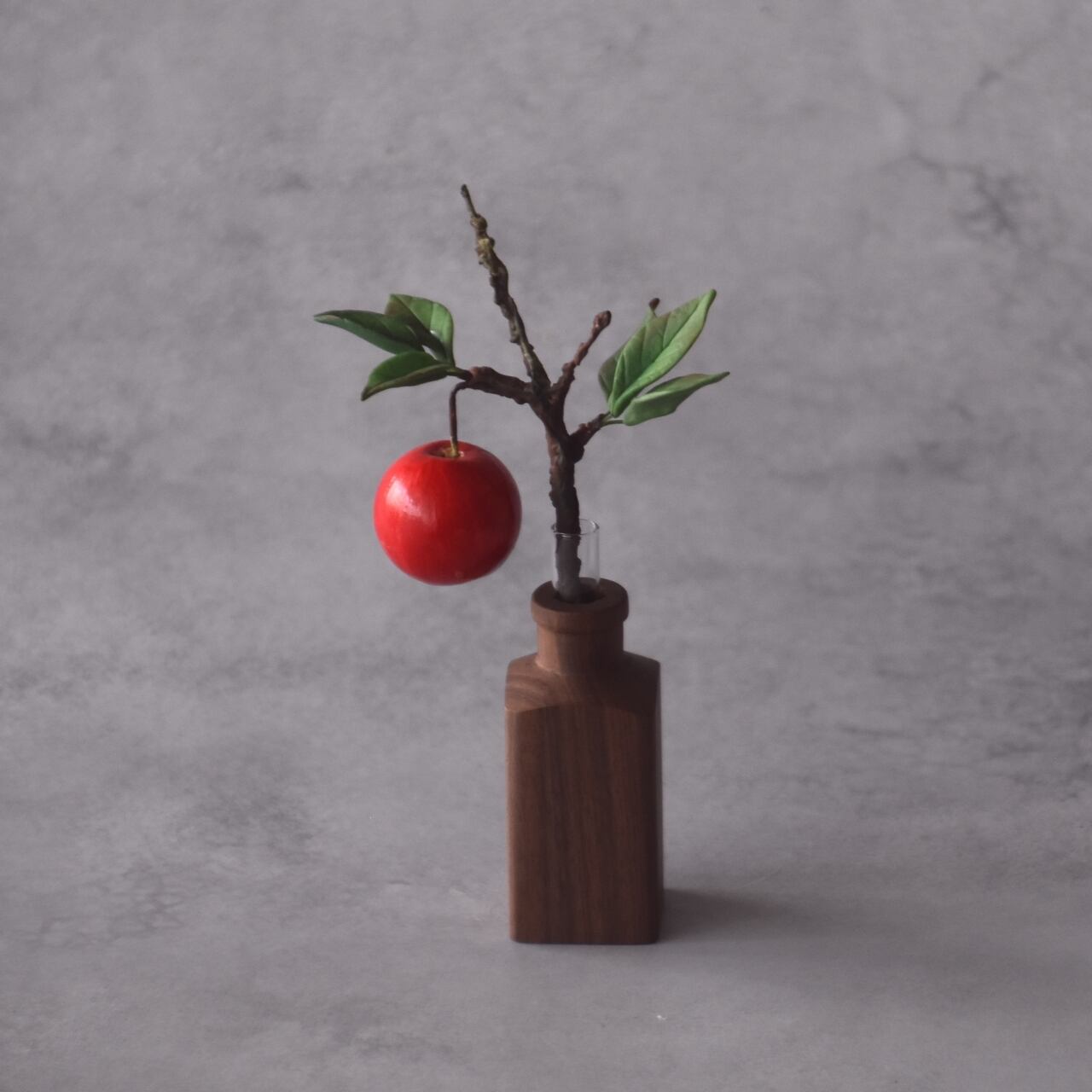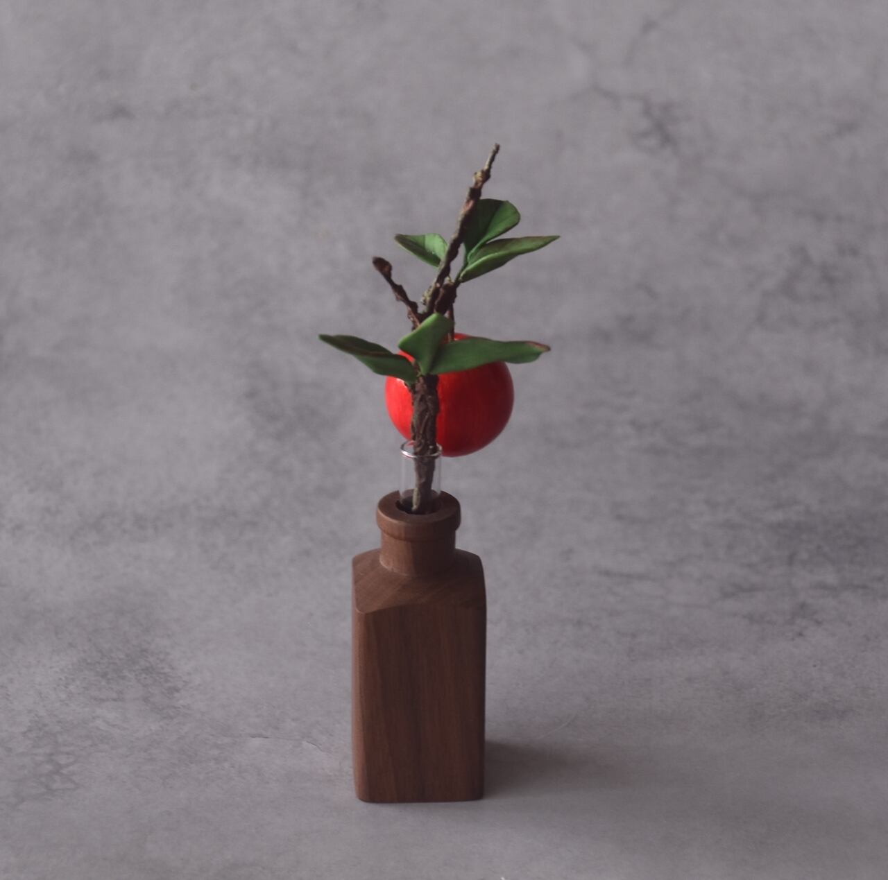 りんごを生けている一輪挿しは、チーク材作られたフラットボトルです。