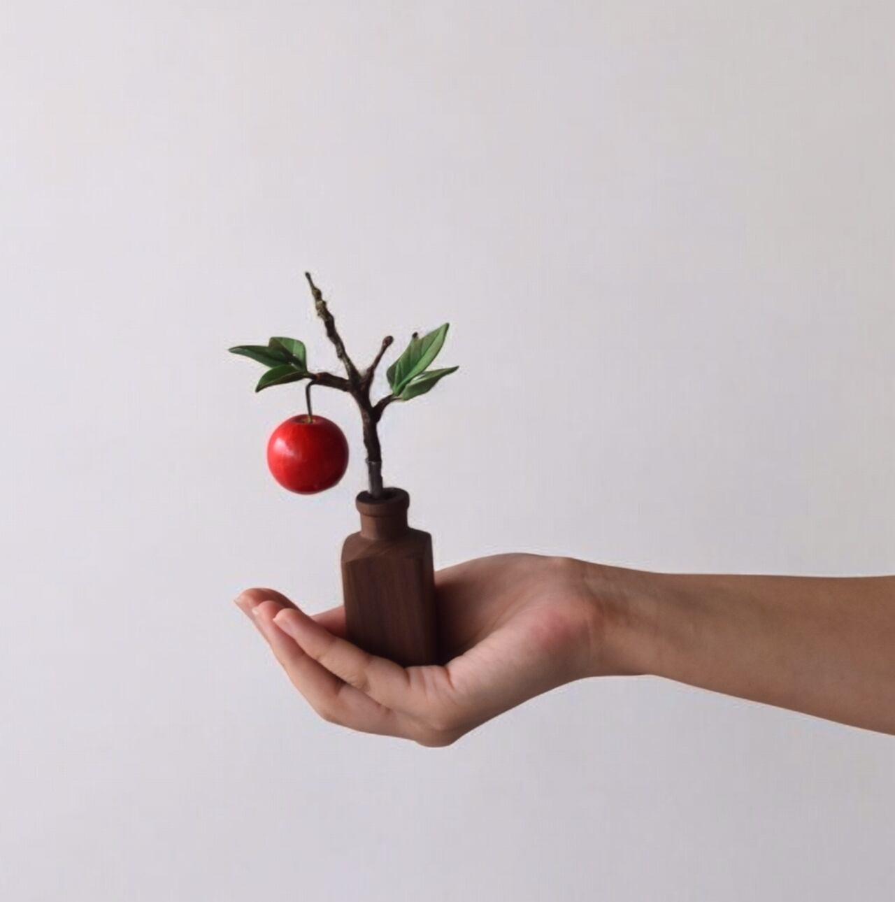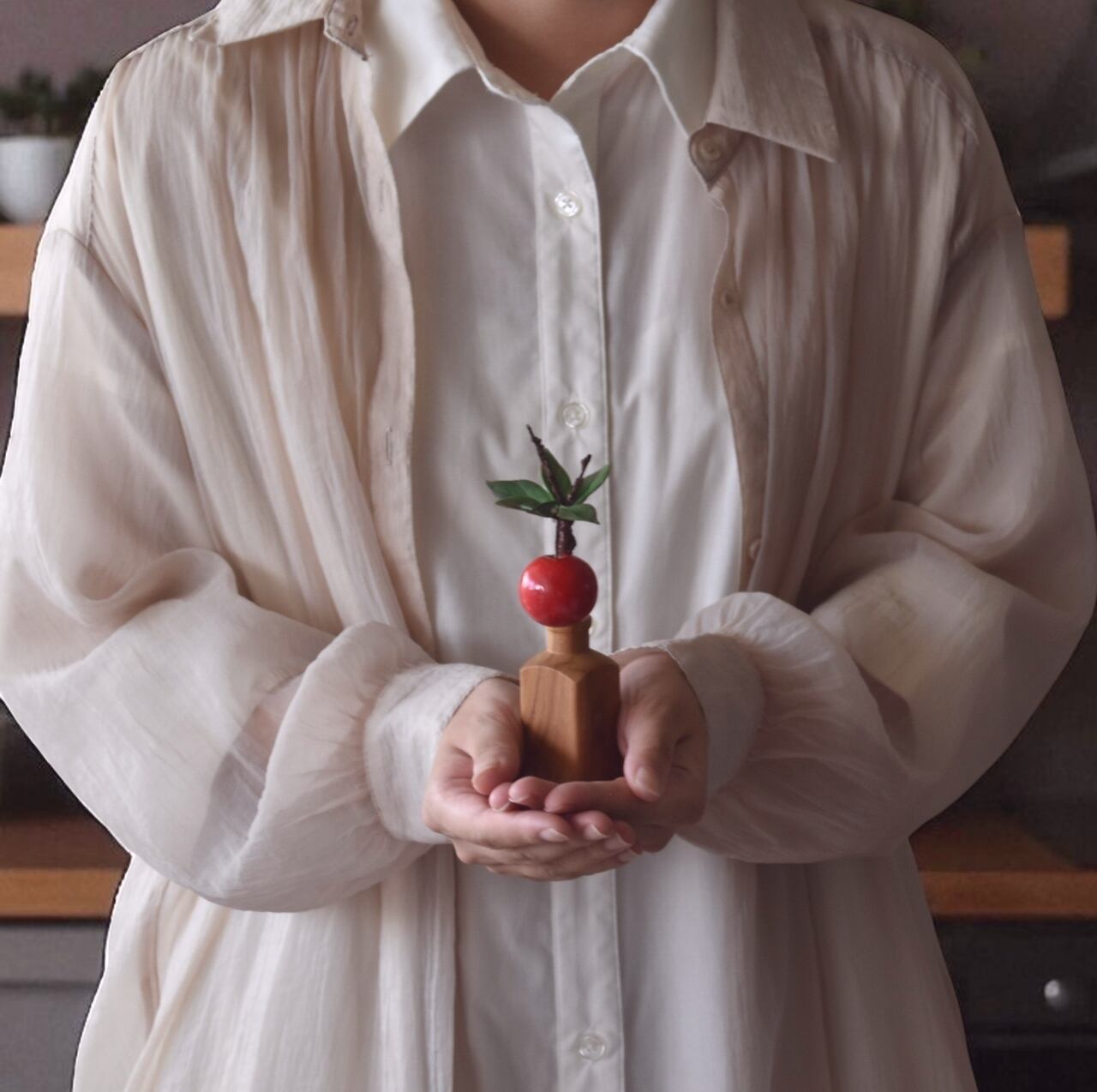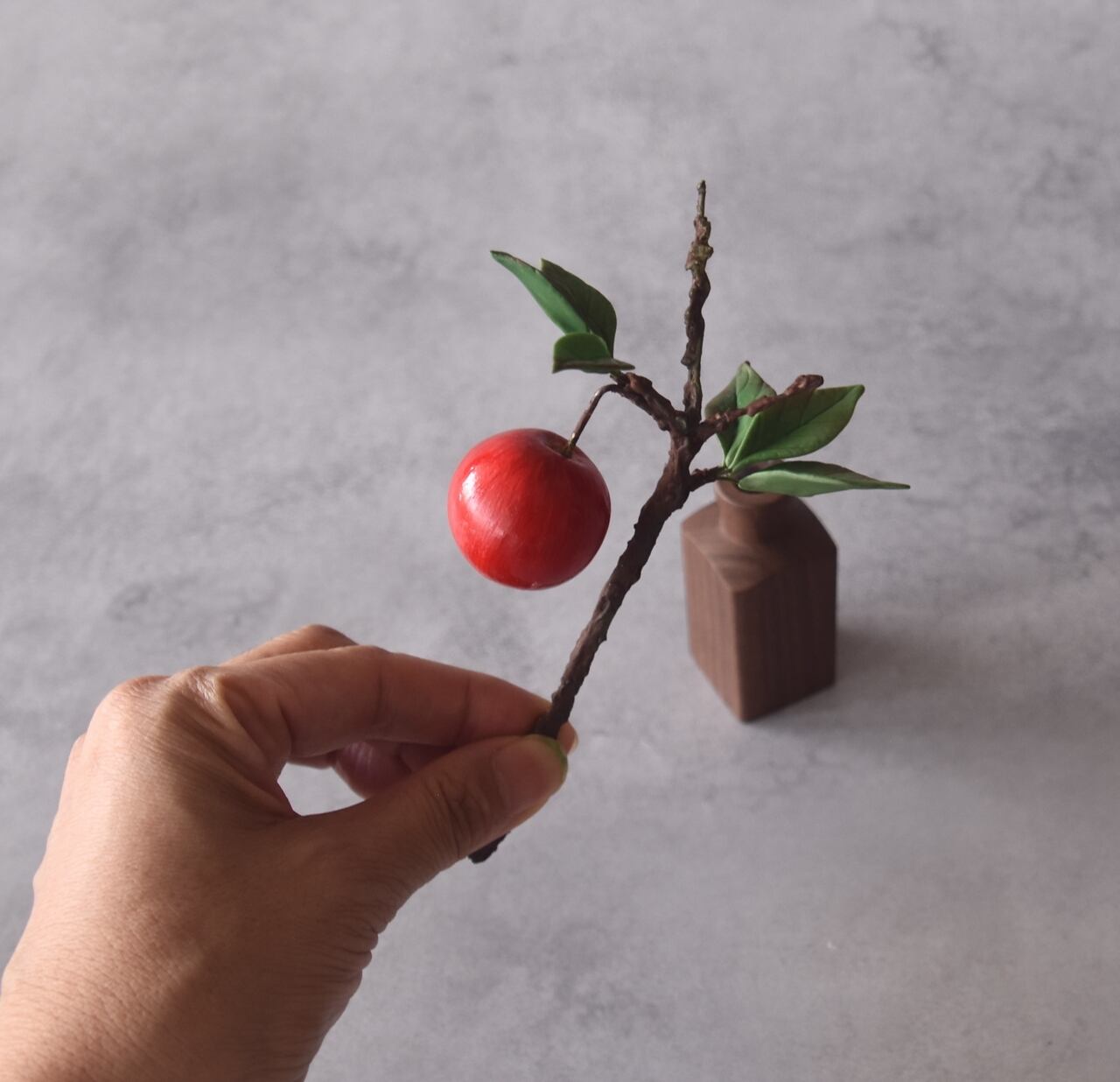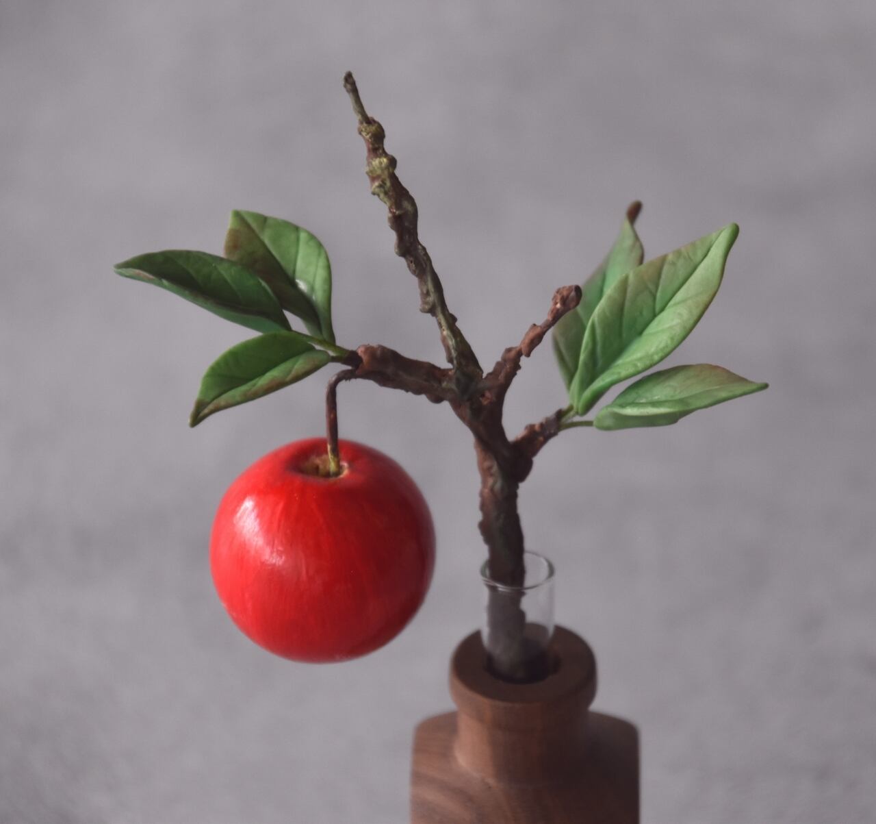 枝と小さなりんごをバランスよく配置し、手のひらに収まる愛らしいサイズに仕上げました。