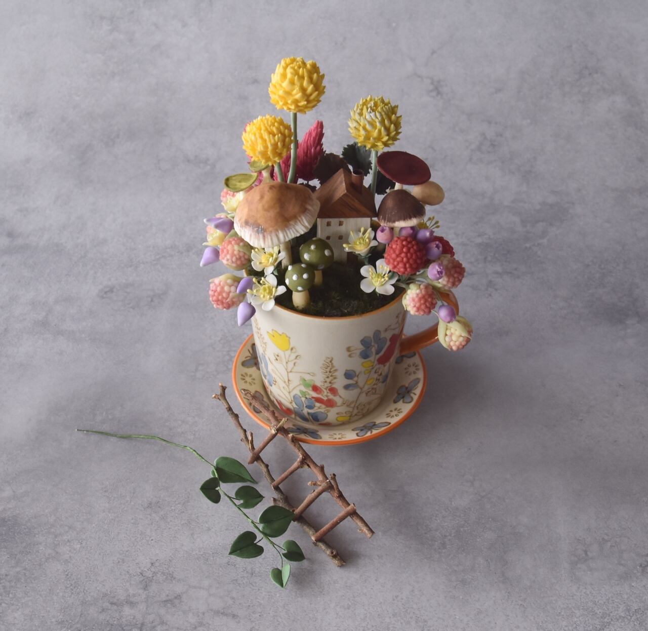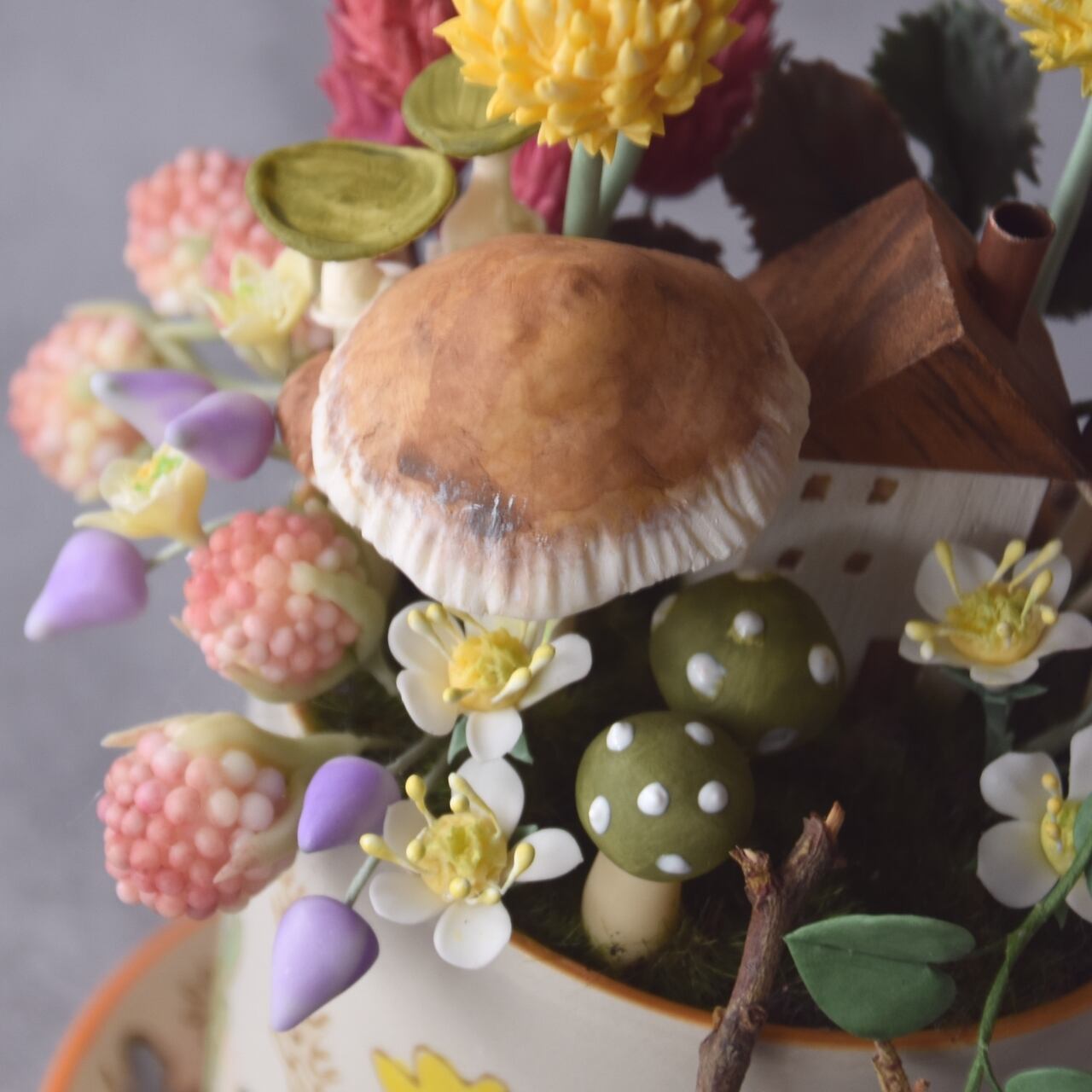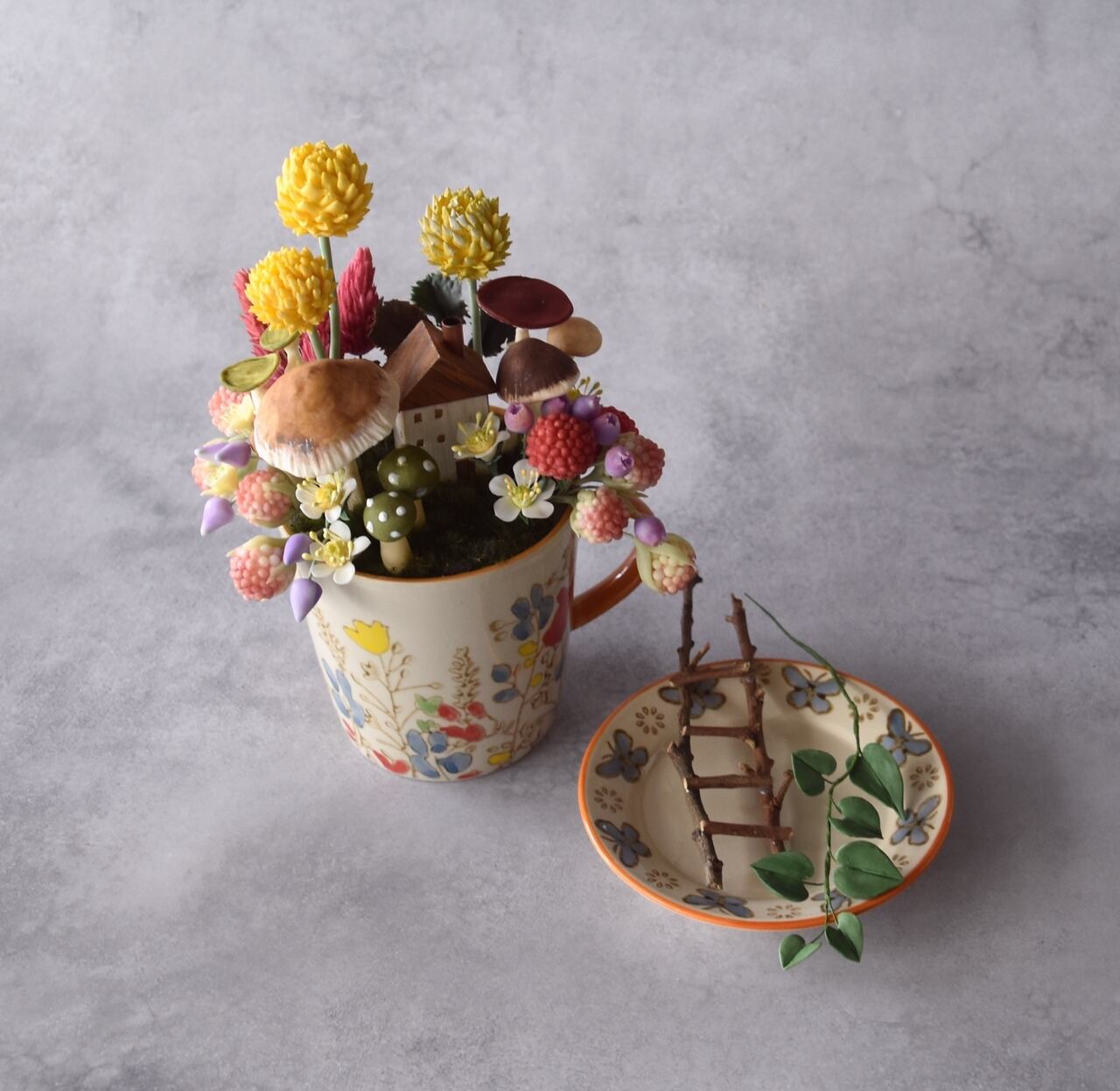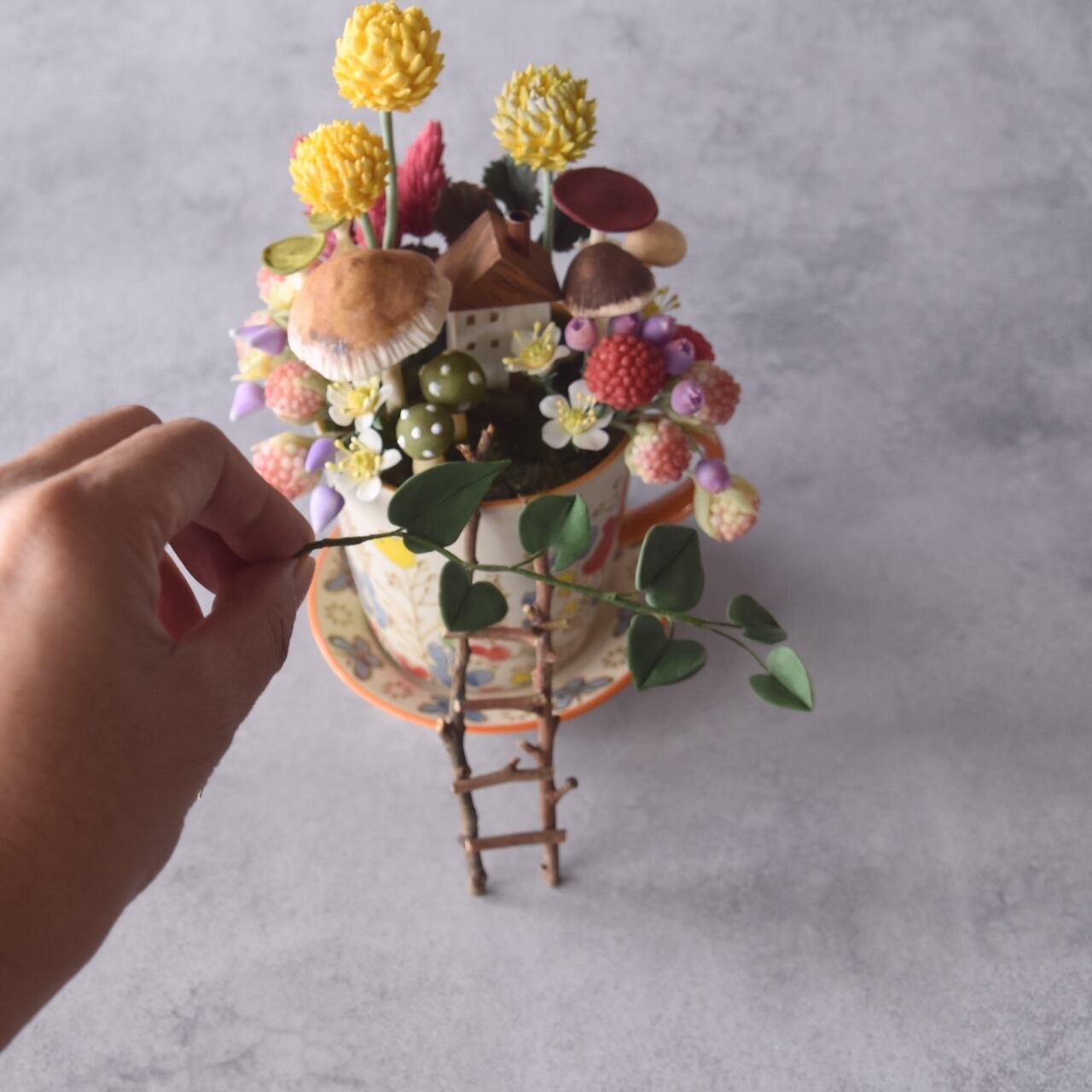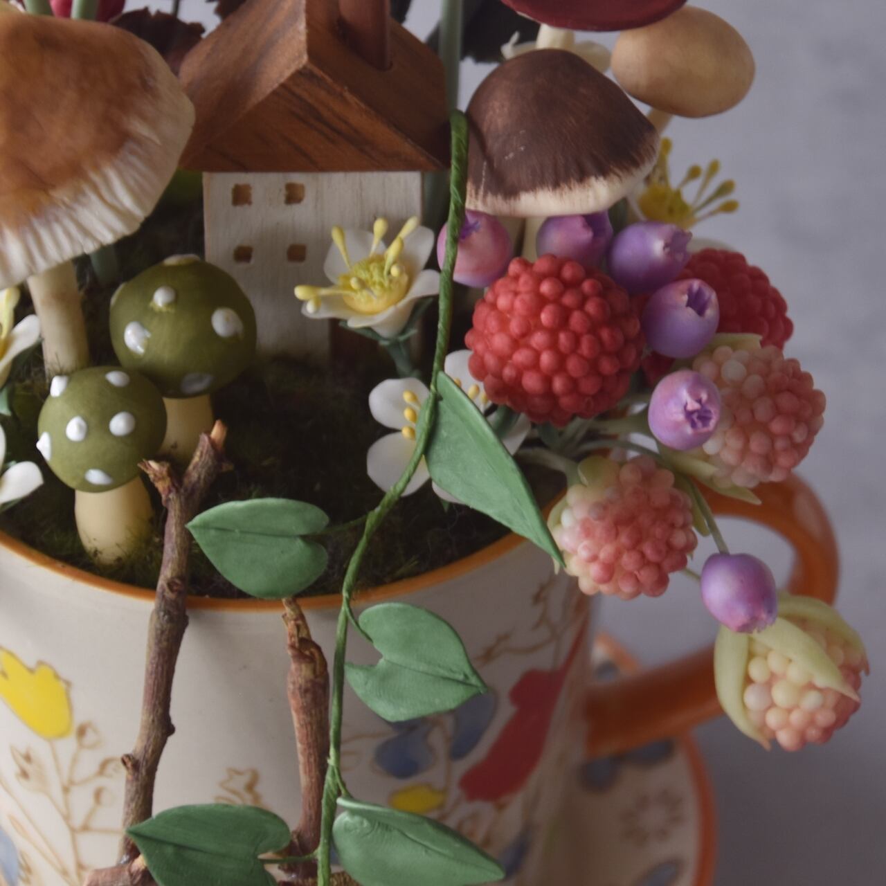 小花や実ものもすべて粘土でできており、木製の小さなお家を添えると、まるで妖精の住む森のような雰囲気に。