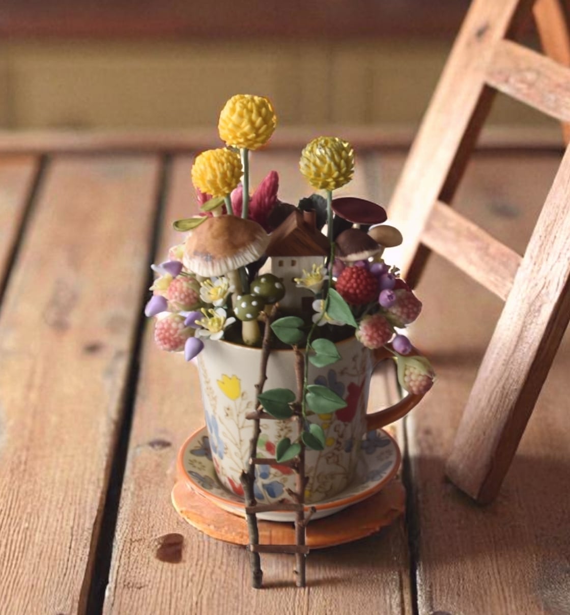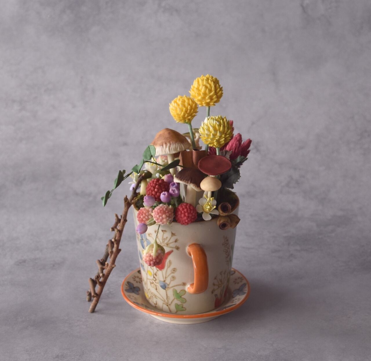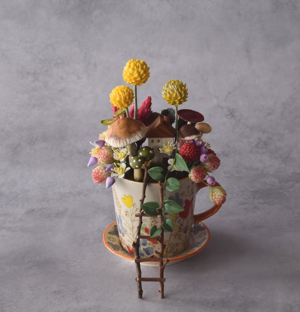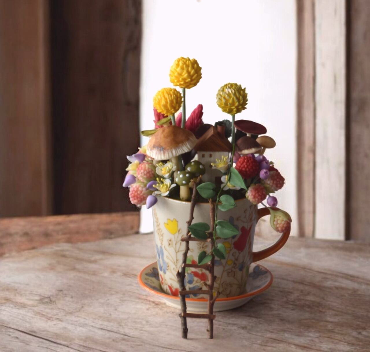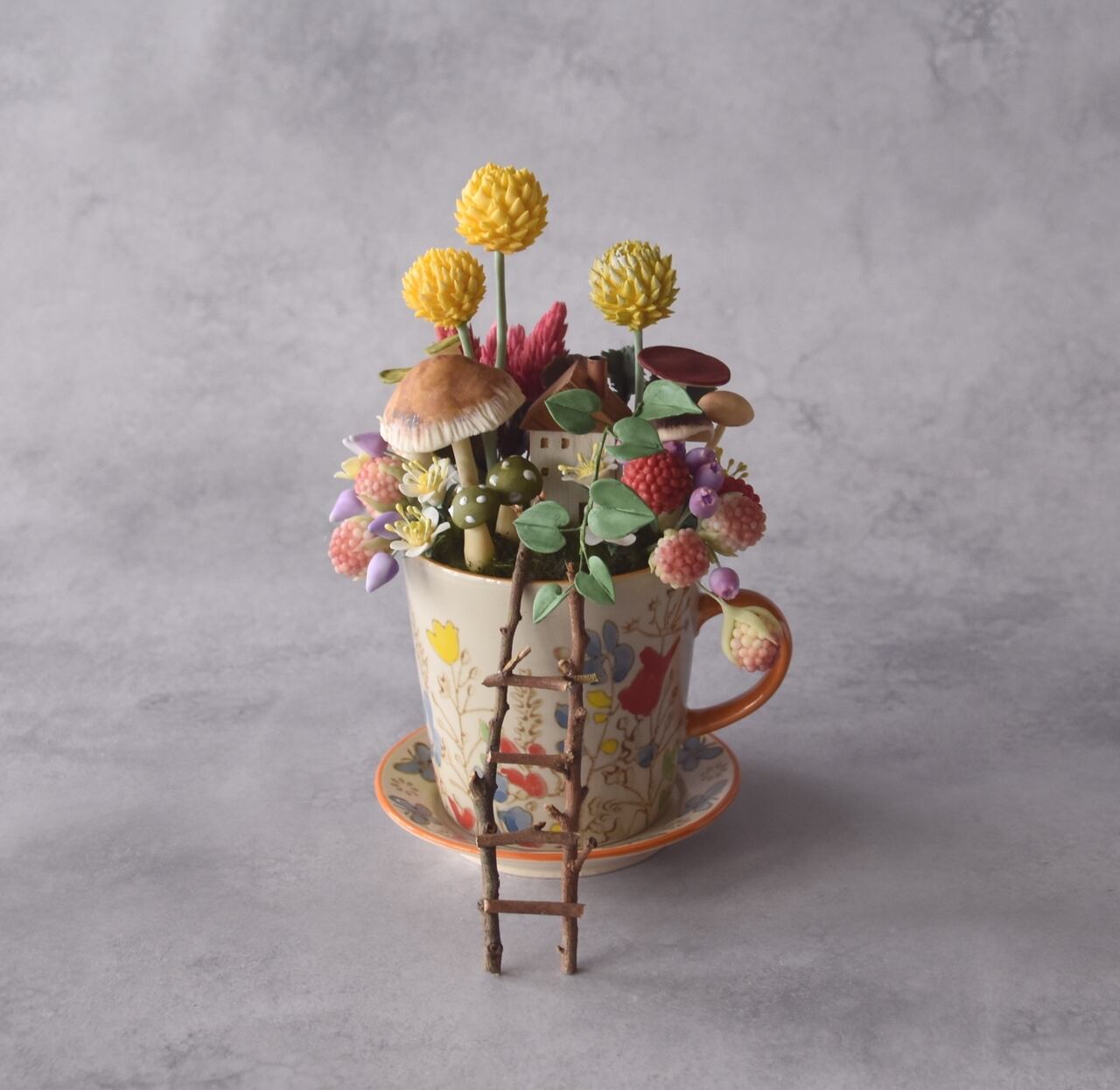 小花や実ものもすべて粘土でできており、木製の小さなお家を添えると、まるで妖精の住む森のような雰囲気に。
