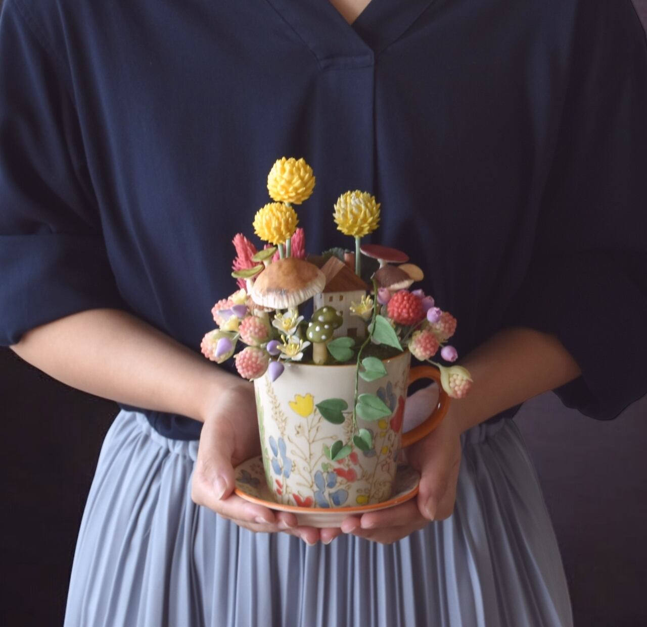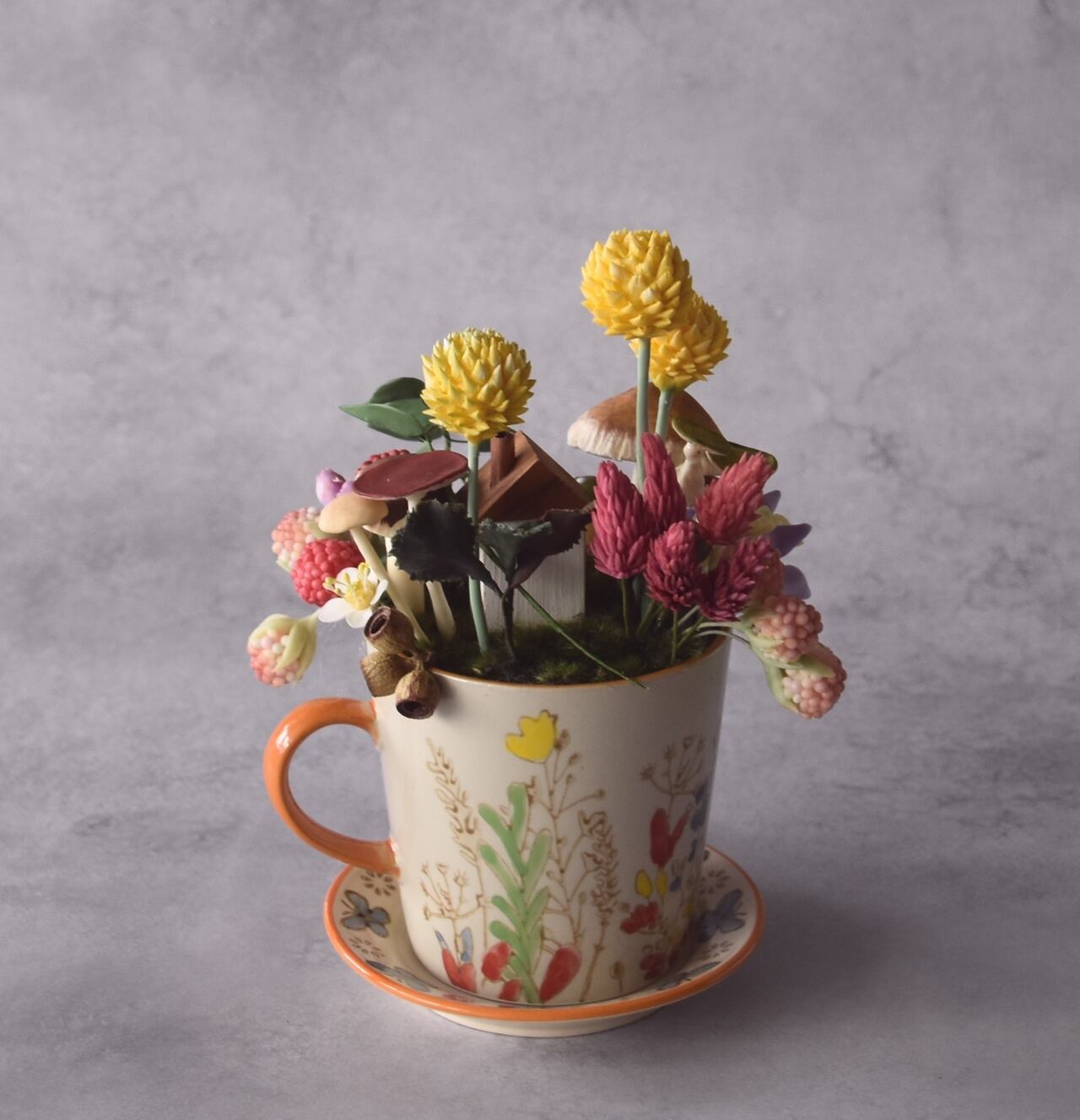 粘土で小さなきのこをひとつひとつ作り、ビリーボタン(クラスペディア)をはじめ、たくさんのお花をポットにアレンジしました。
