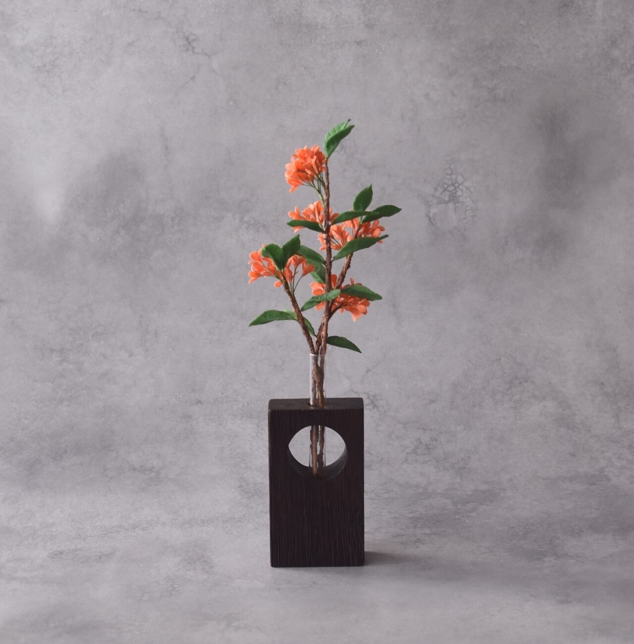お花を生けている一輪挿しは、世界三大銘木のひとつであるチーク材の古材を使用したフラワーベースです。
