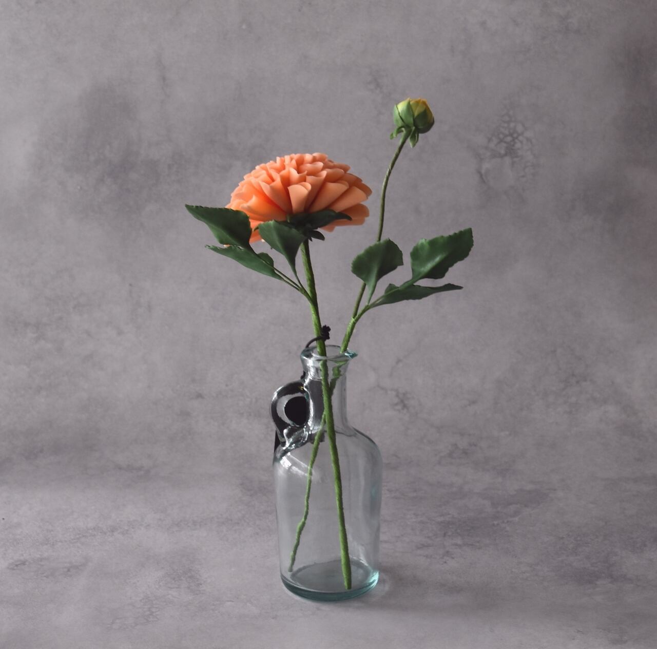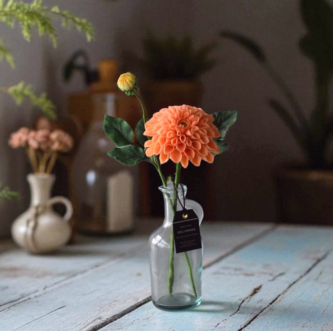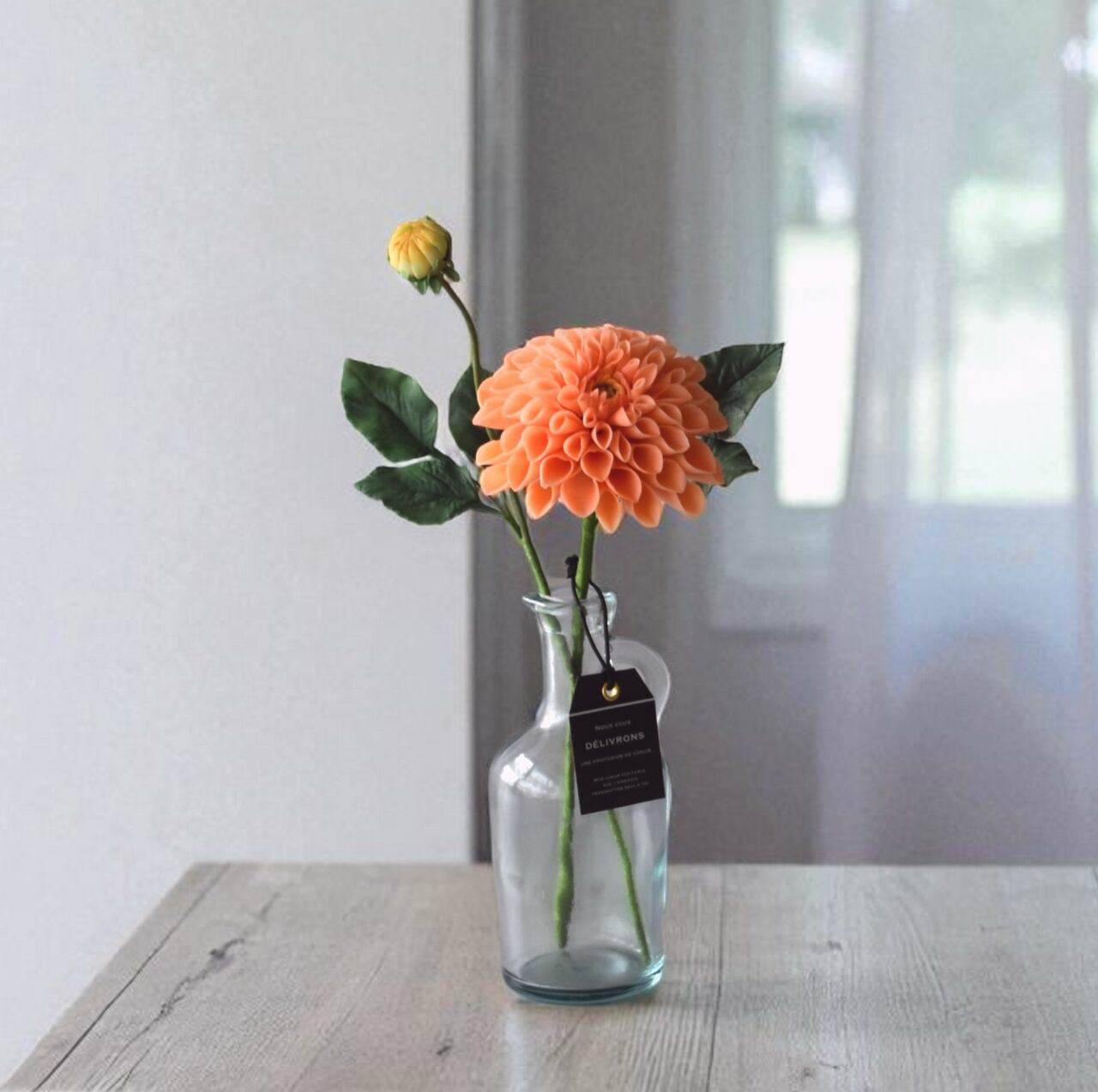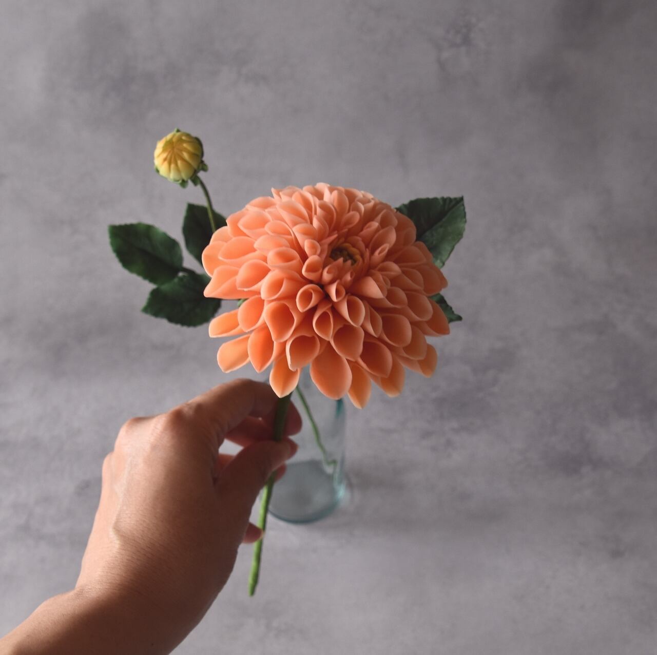 一輪挿しのフラワーベースはガラス製のシンプルなデザインで、ボリュームのあるダリアの可愛らしさを引き立てます。