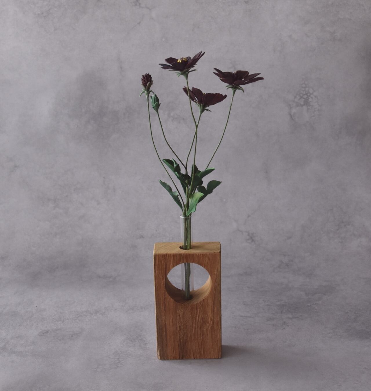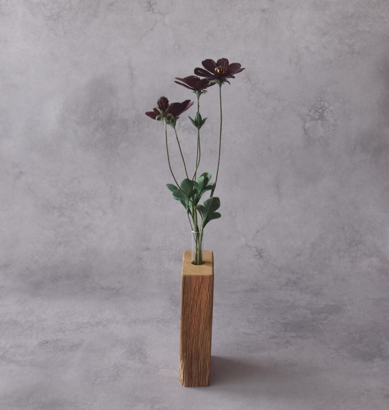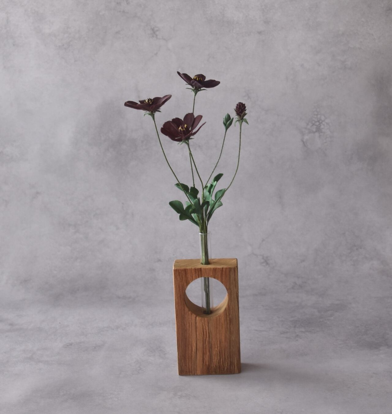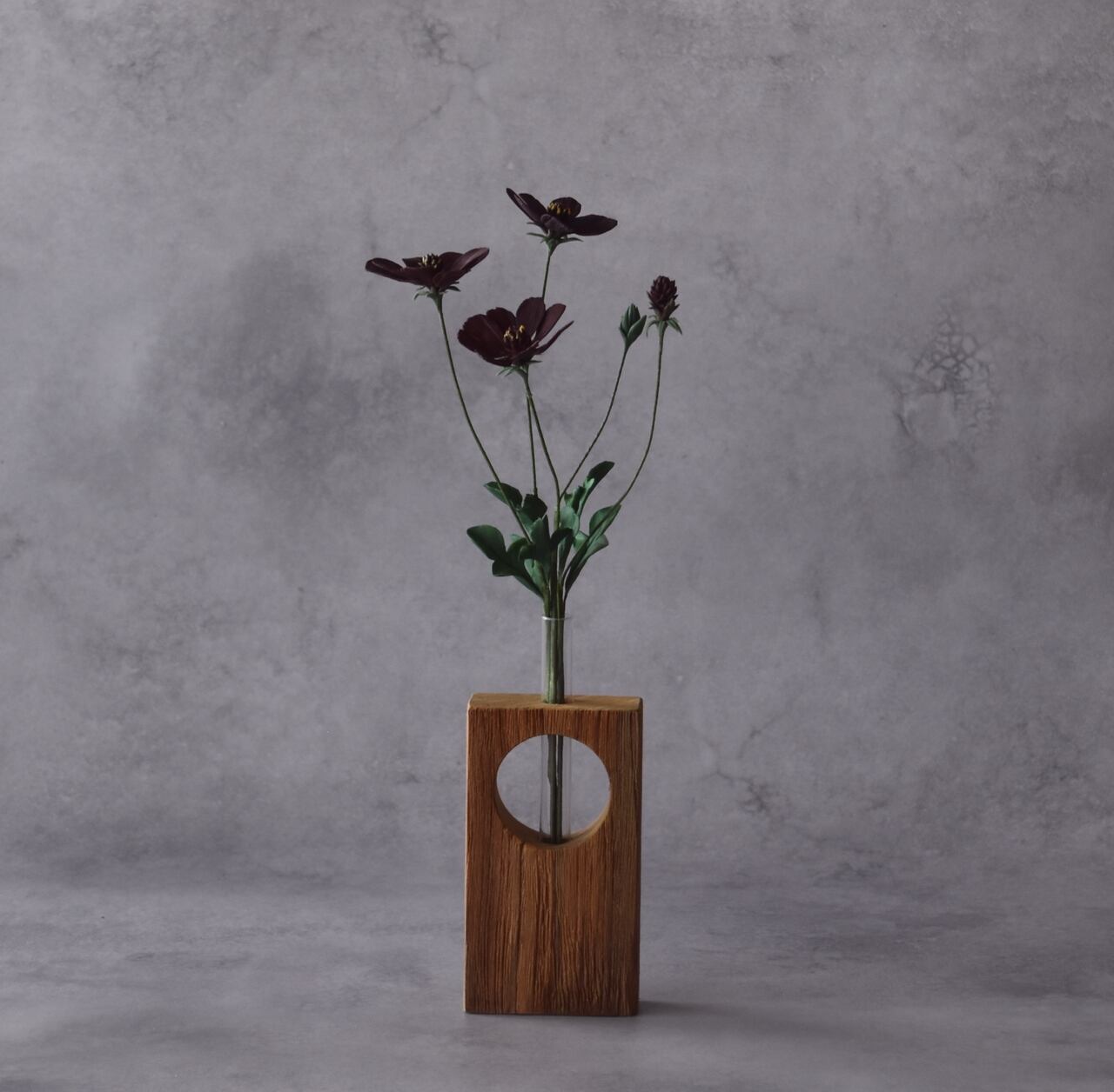 お花を生けている一輪挿しは、世界三大銘木のひとつであるチーク材の古材を使用したフラワーベースです。