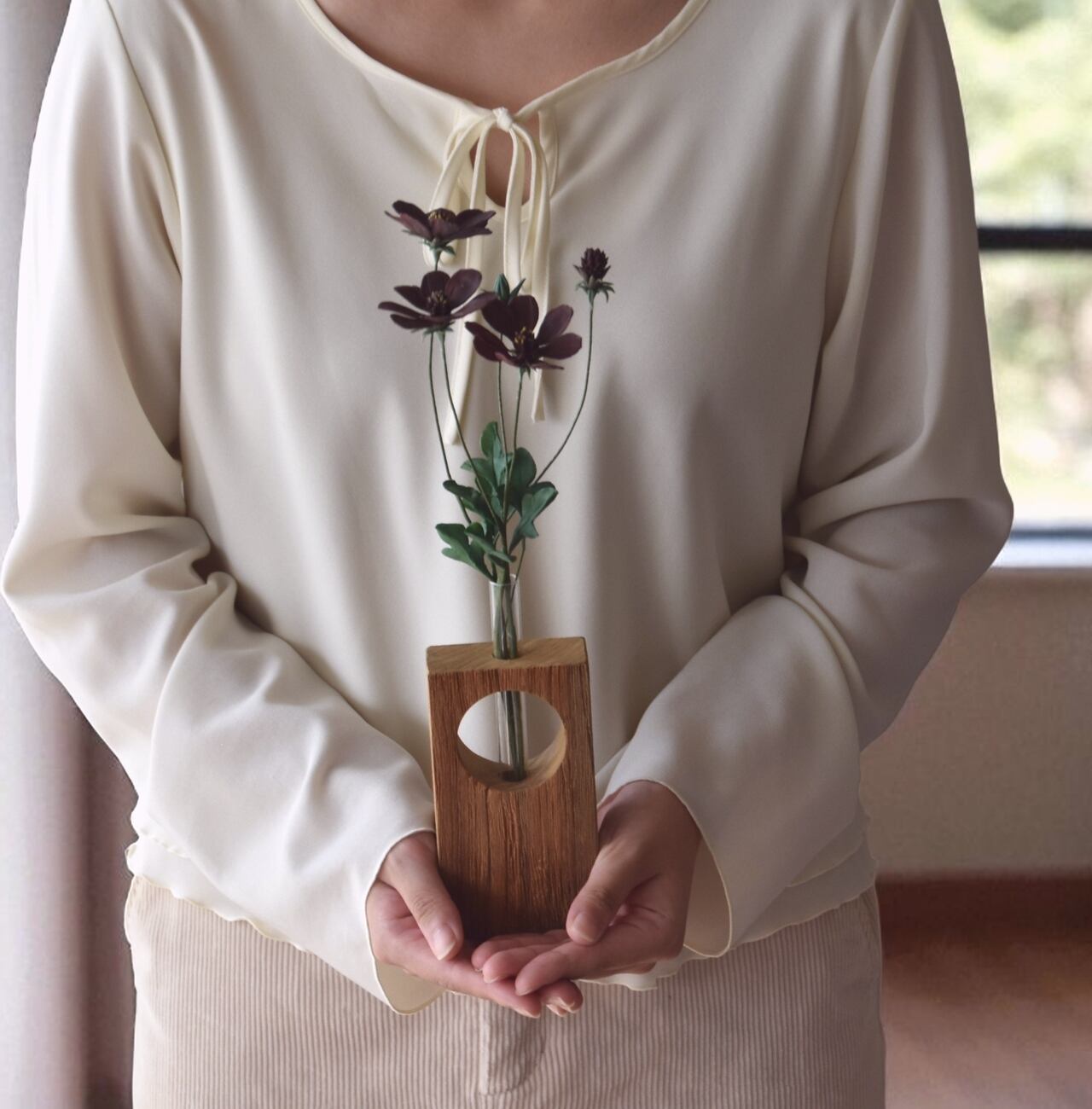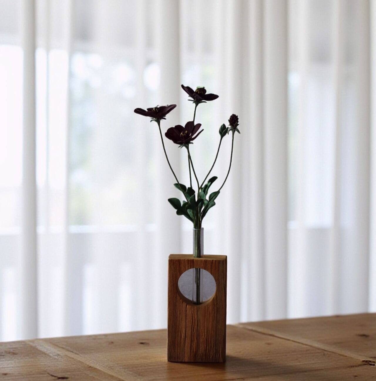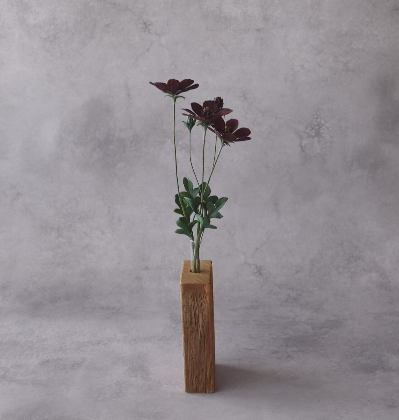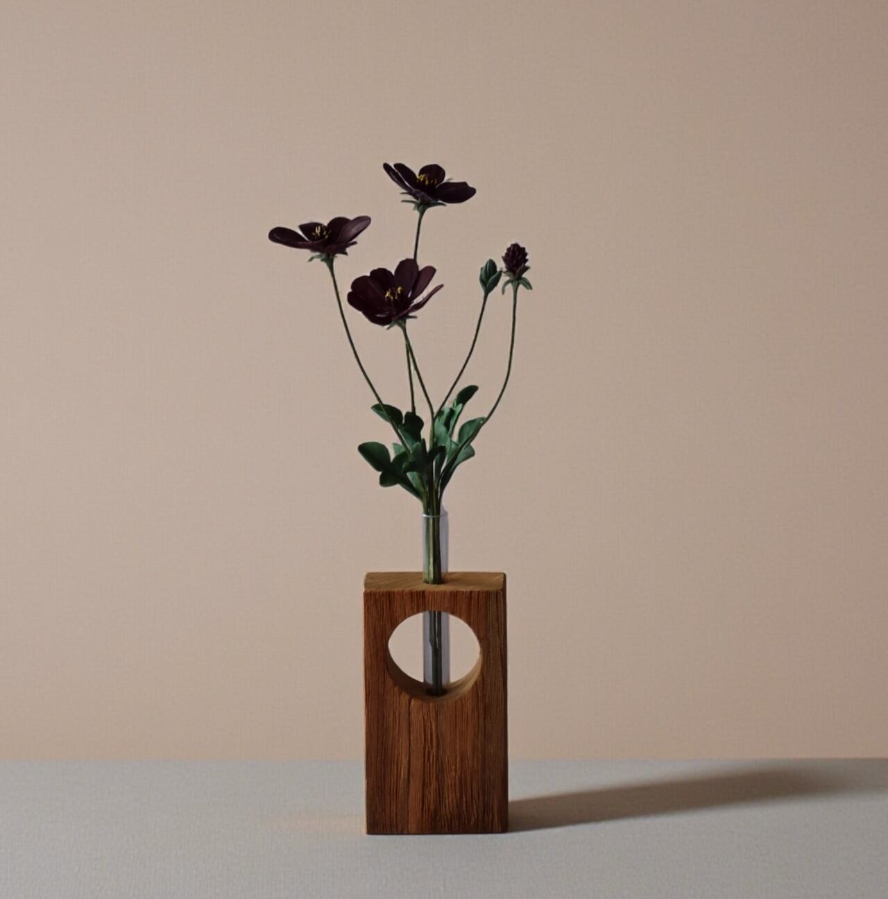 お花を生けている一輪挿しは、世界三大銘木のひとつであるチーク材の古材を使用したフラワーベースです。