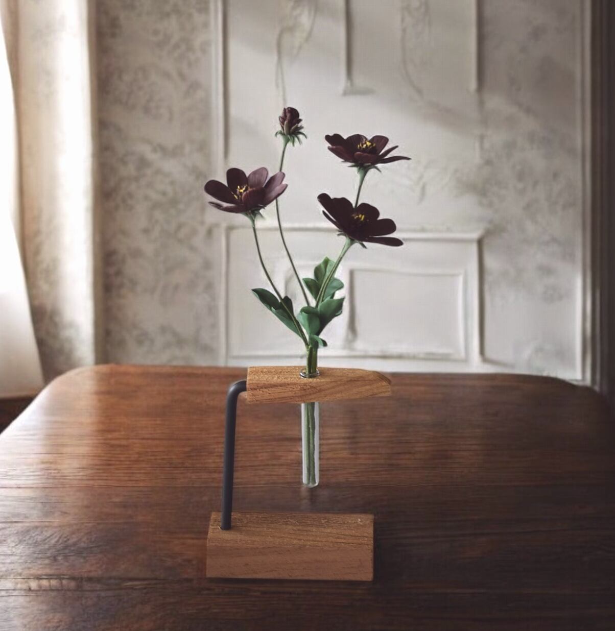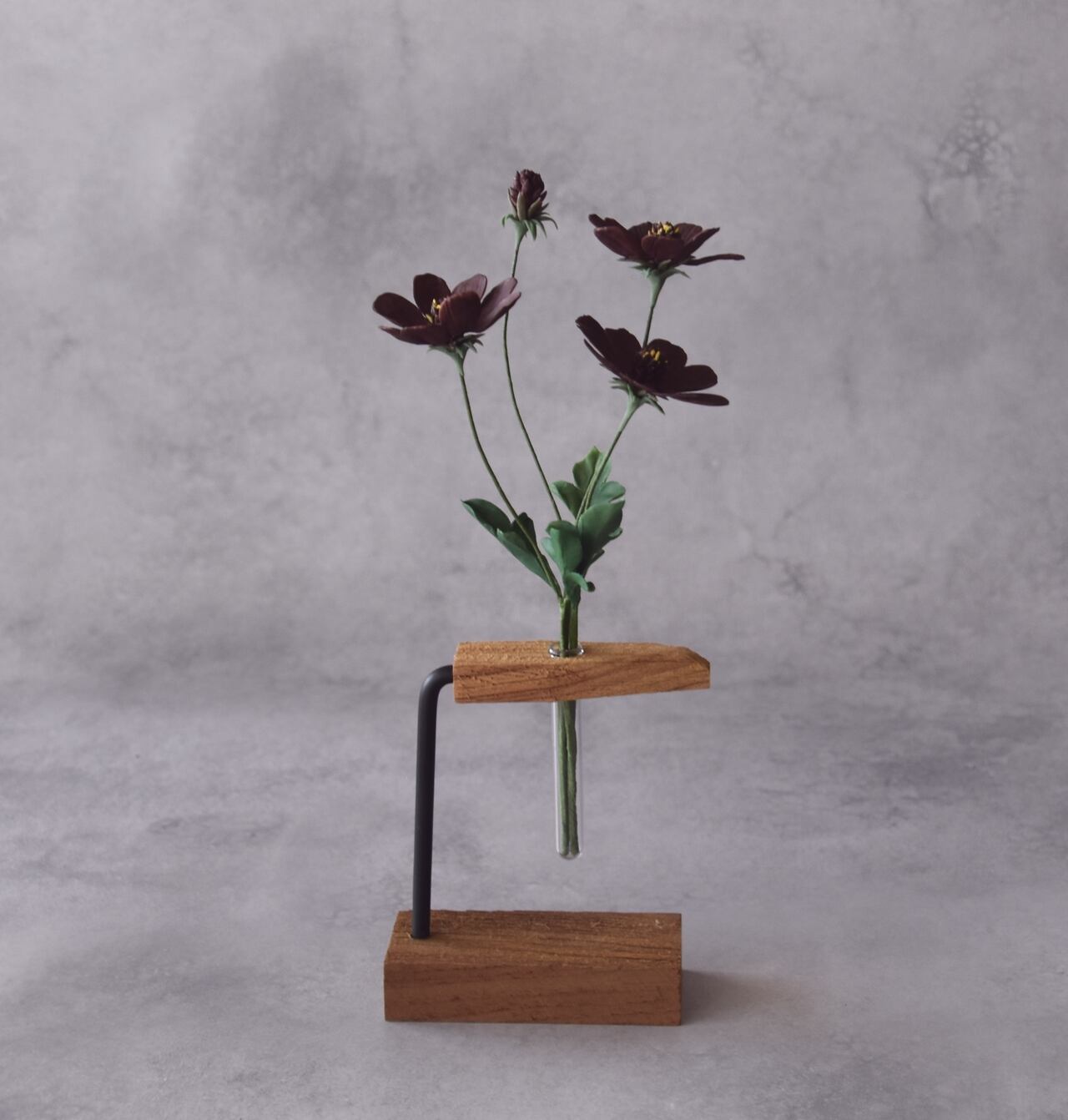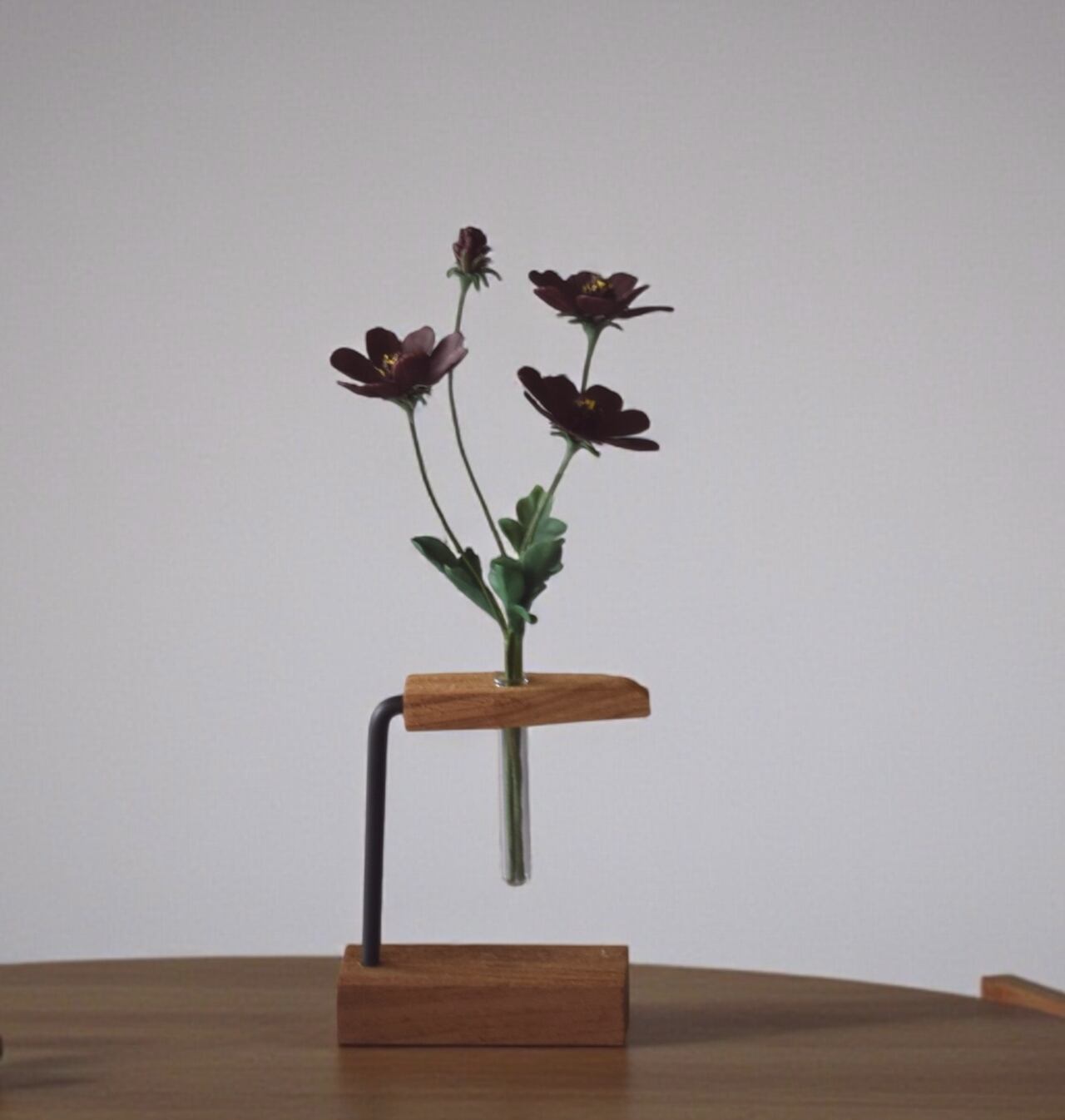 お花を生けている一輪挿しは、古材を使用しており、小さくても存在感バツグンです。