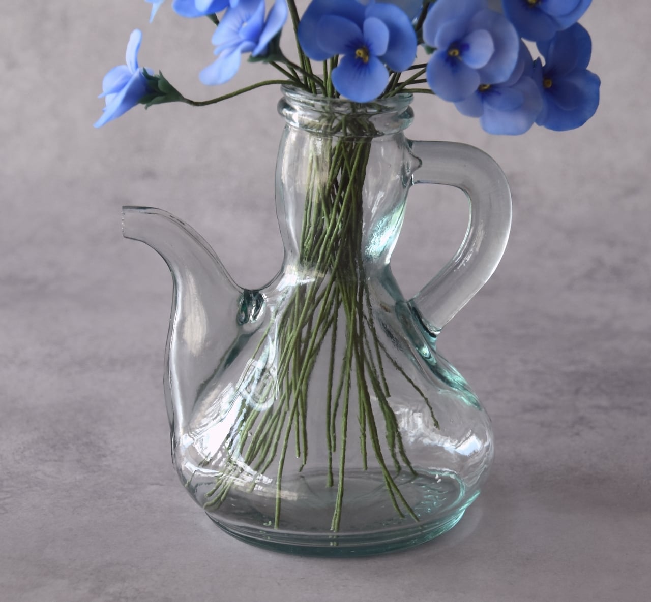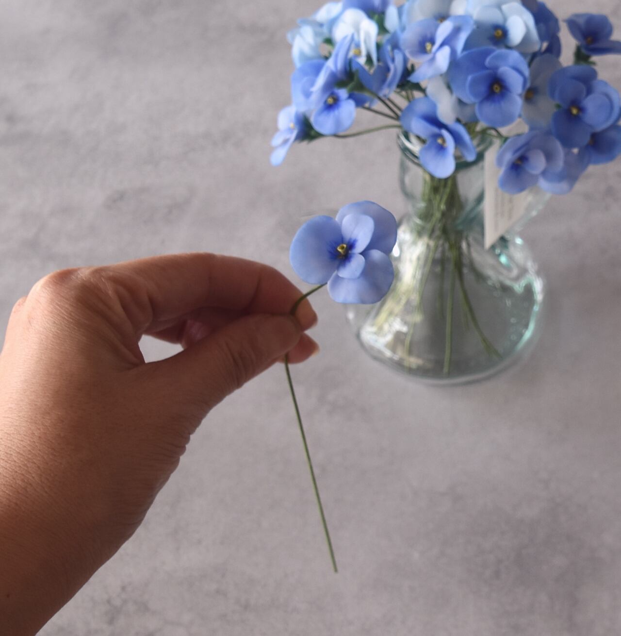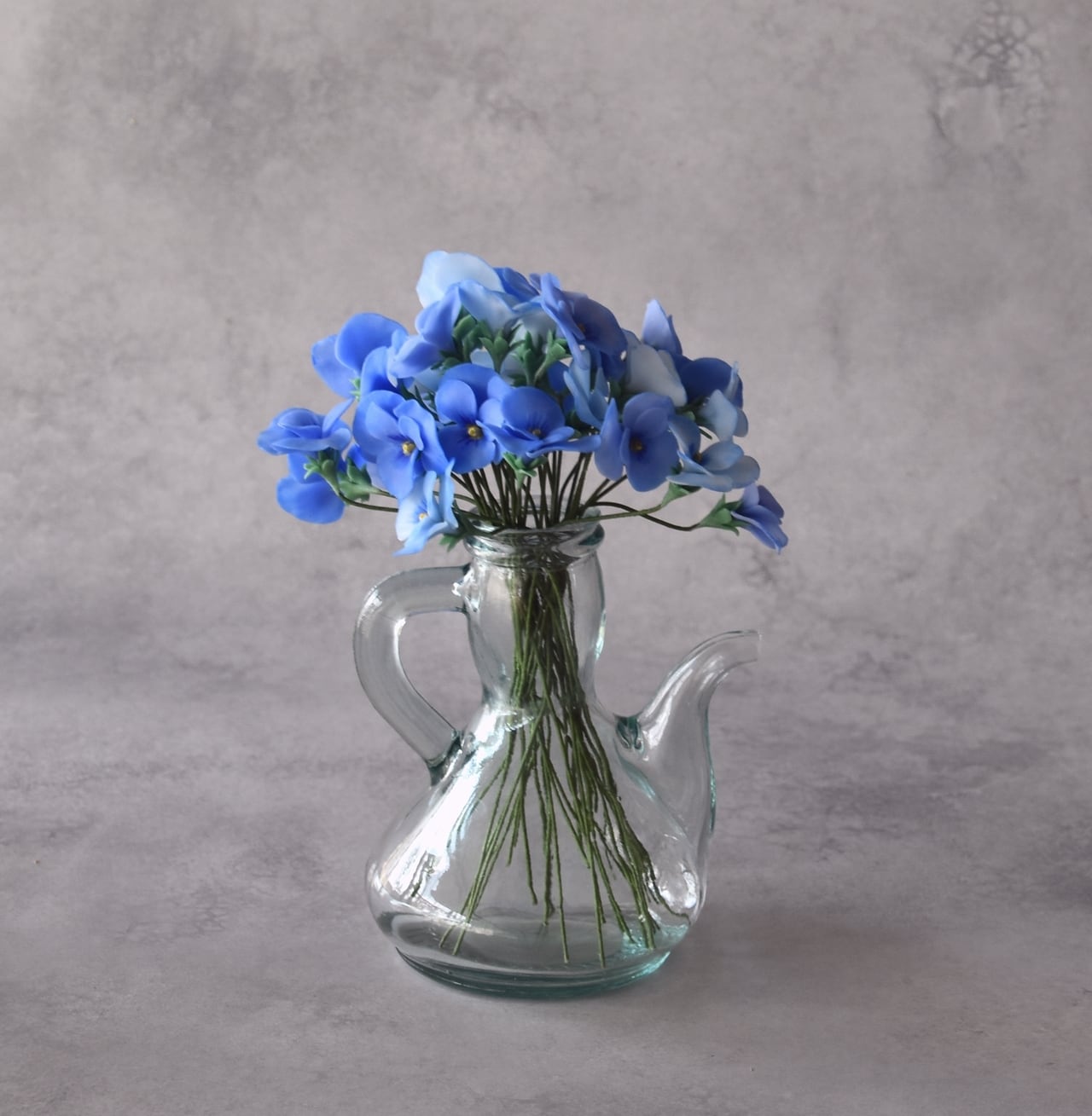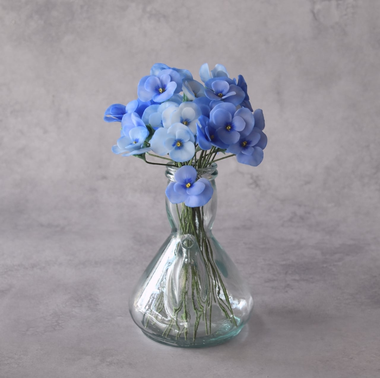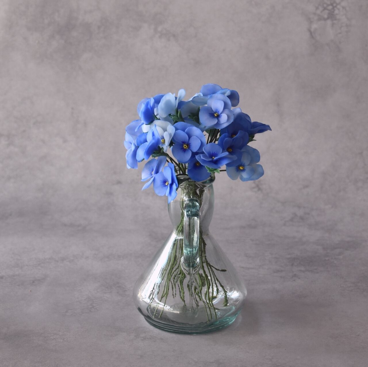 粘土でビオラを制作し、オイルポットのような形のフラワーボトルにアレンジしました。
