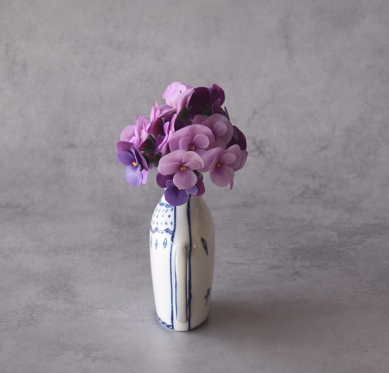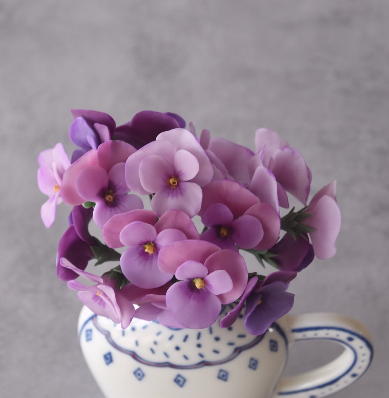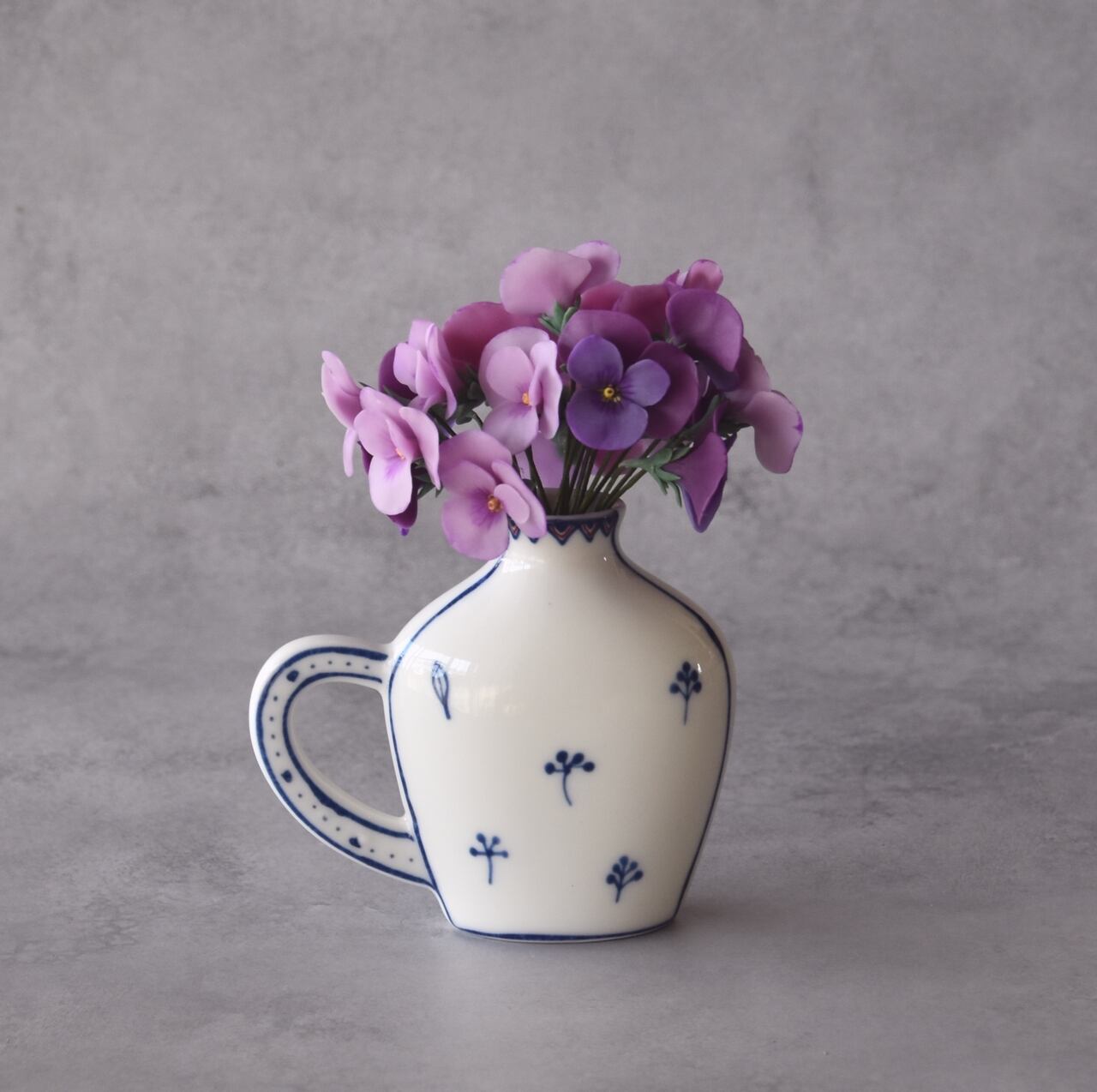 粘土で繊細にかたどったビオラを、持ち手の付いた壺型の花瓶に飾りました。