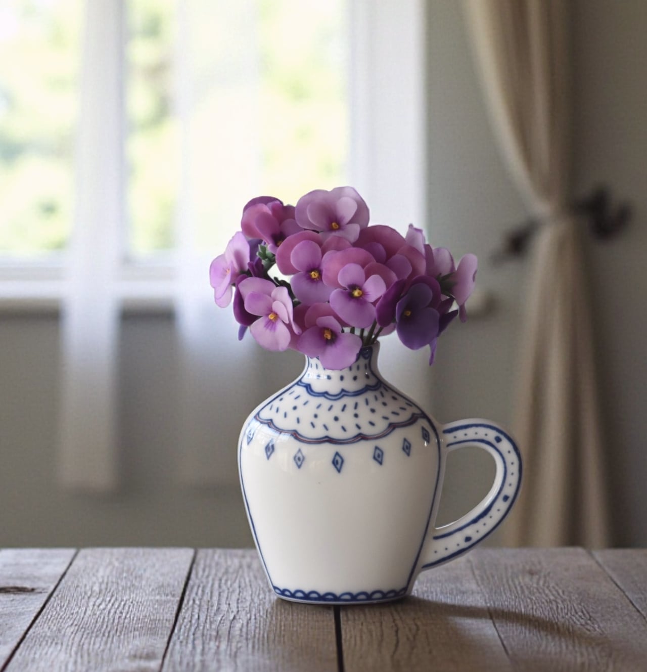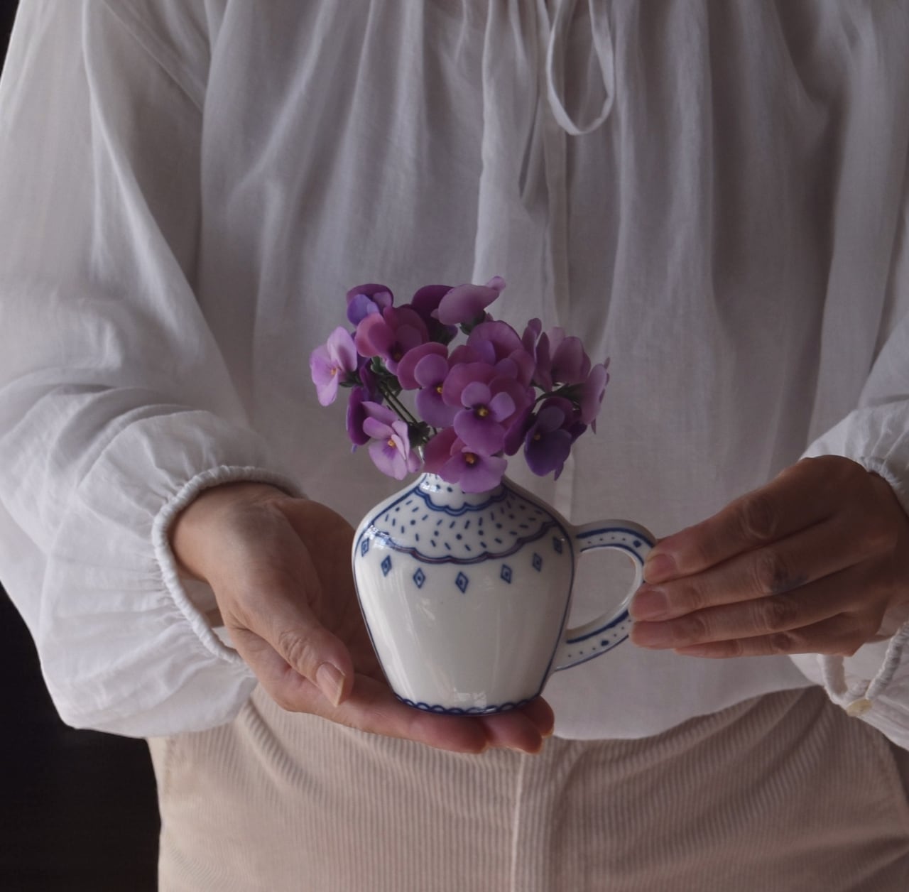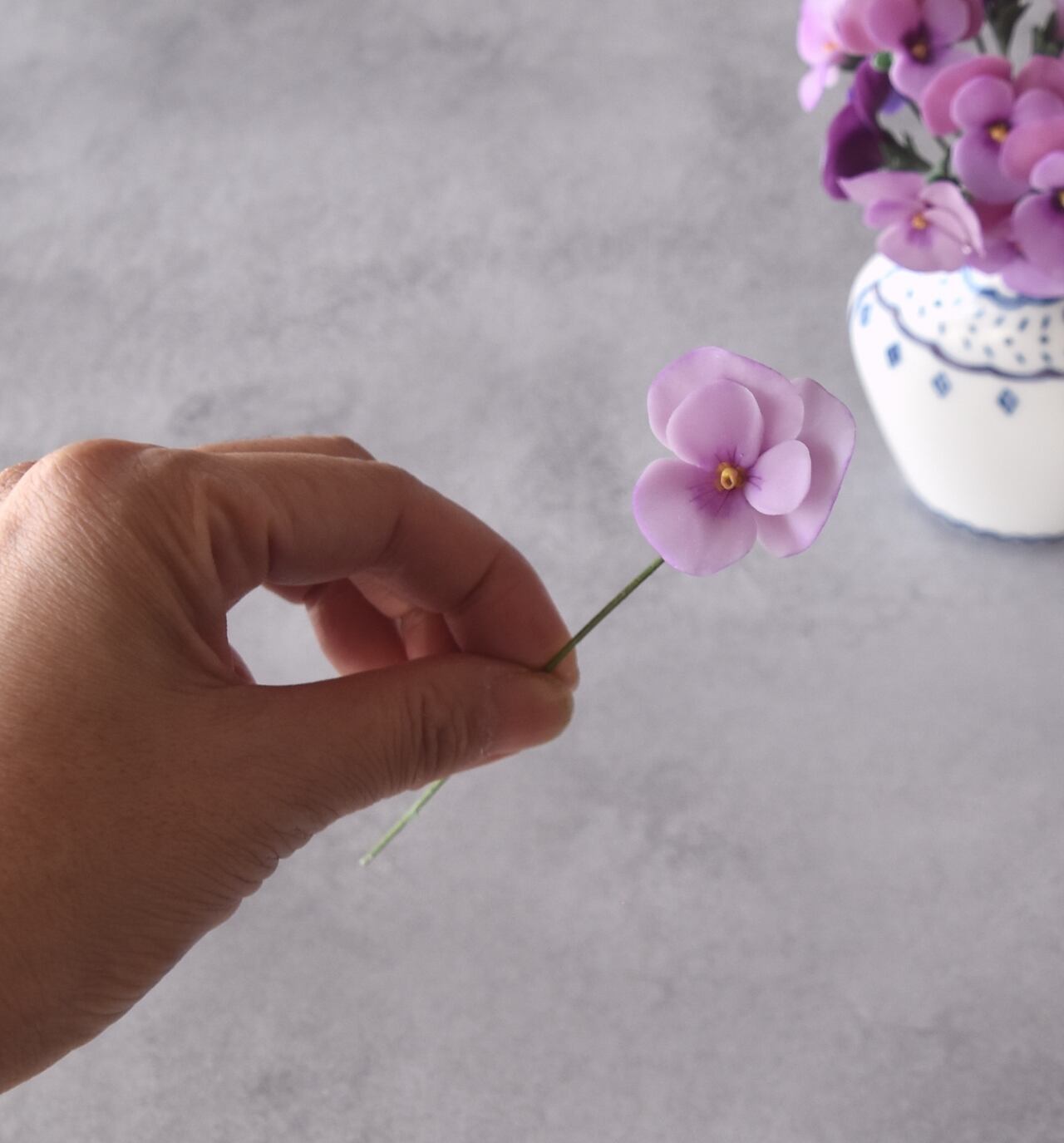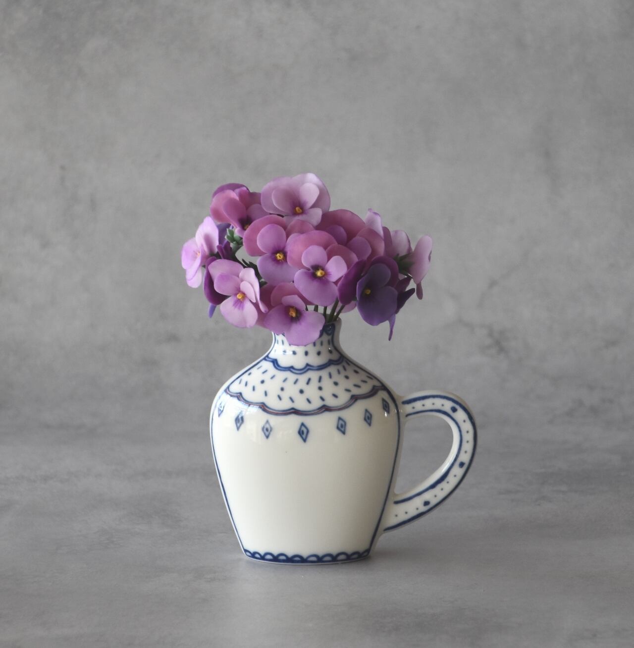 粘土で繊細にかたどったビオラを、持ち手の付いた壺型の花瓶に飾りました。