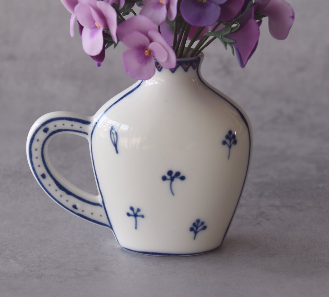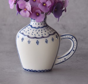 花瓶はスリムなフォルムで、表と裏にそれぞれ異なる手描きの模様が施されており、北欧風のとても愛らしいデザインです。