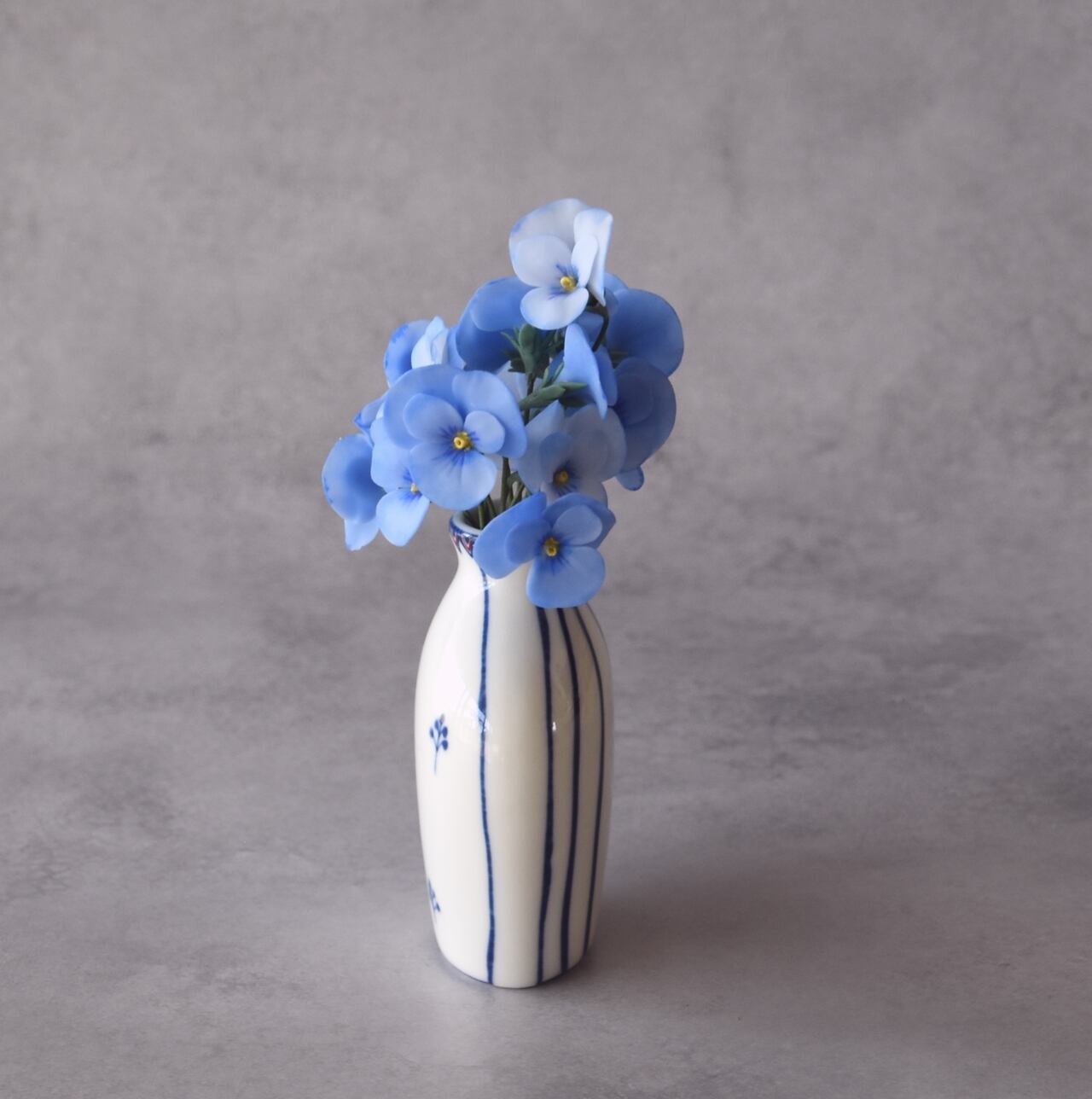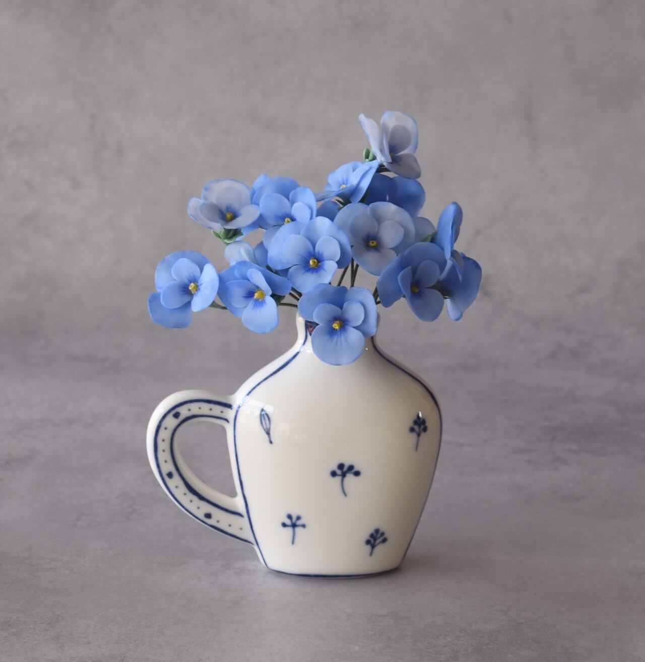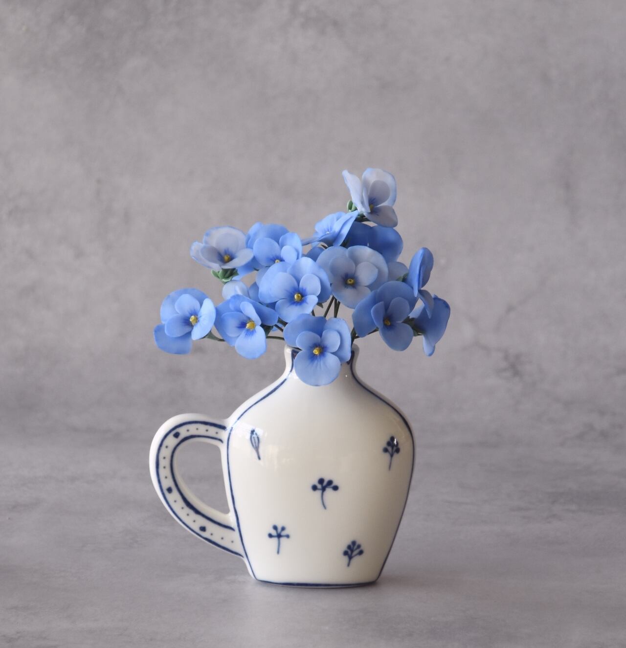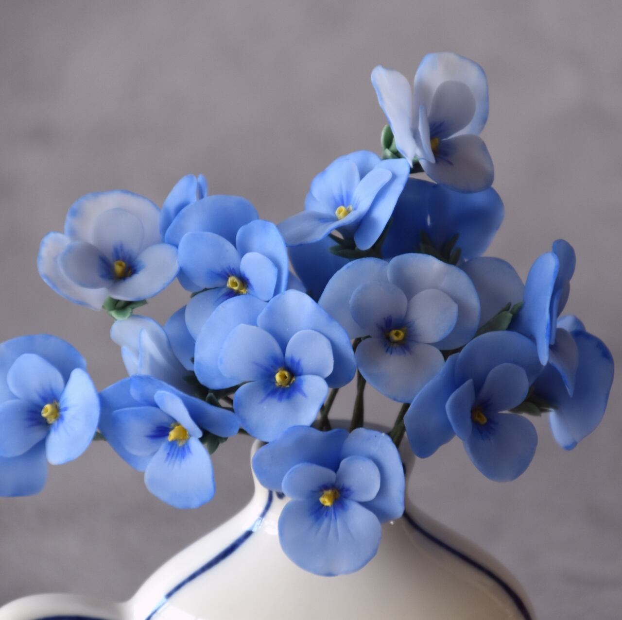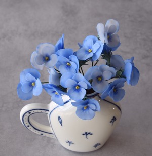 粘土で繊細にかたどったビオラを、持ち手の付いた壺型の花瓶に飾りました。