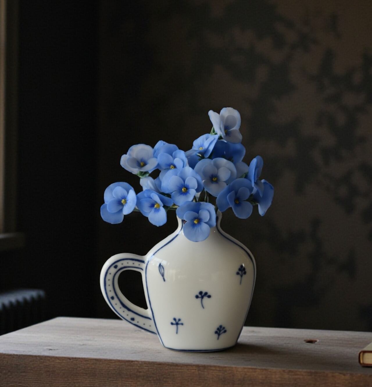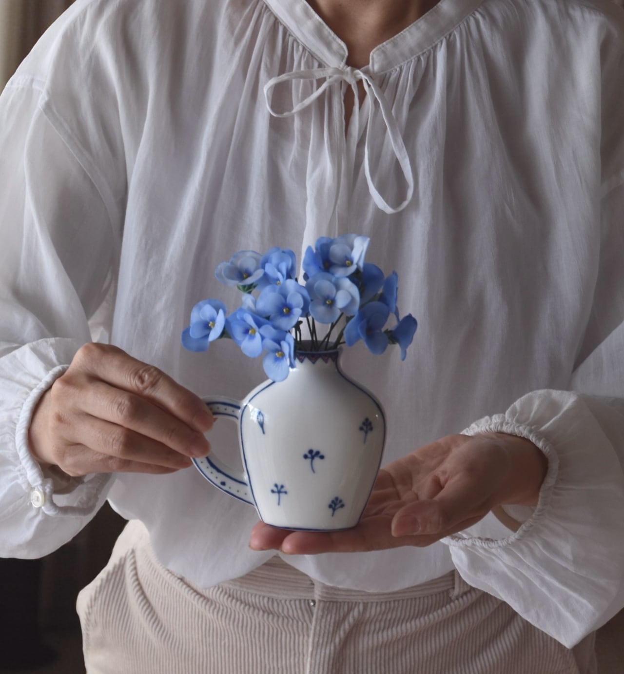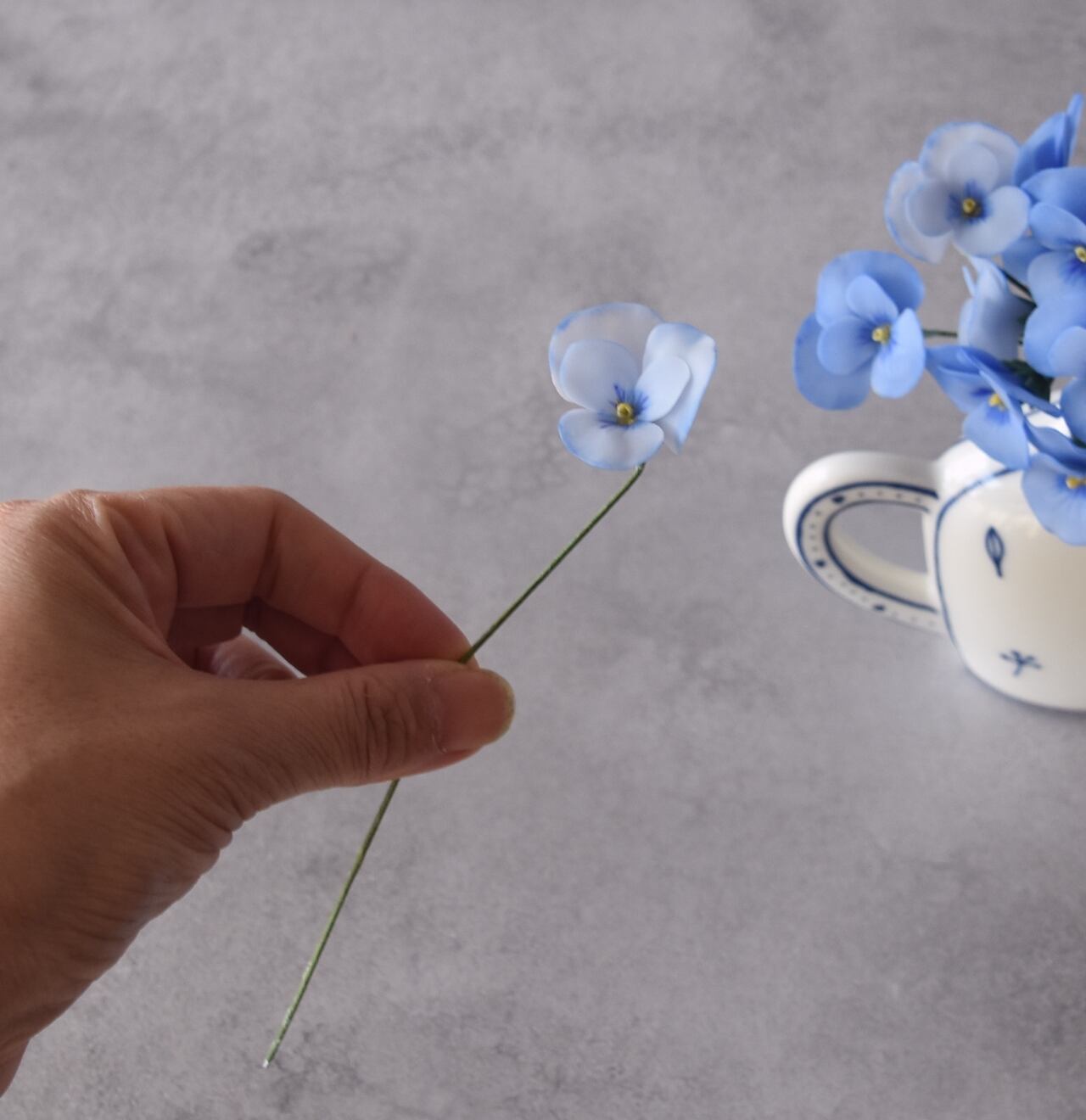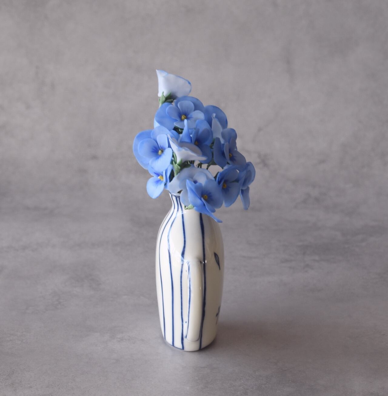 粘土で繊細にかたどったビオラを、持ち手の付いた壺型の花瓶に飾りました。