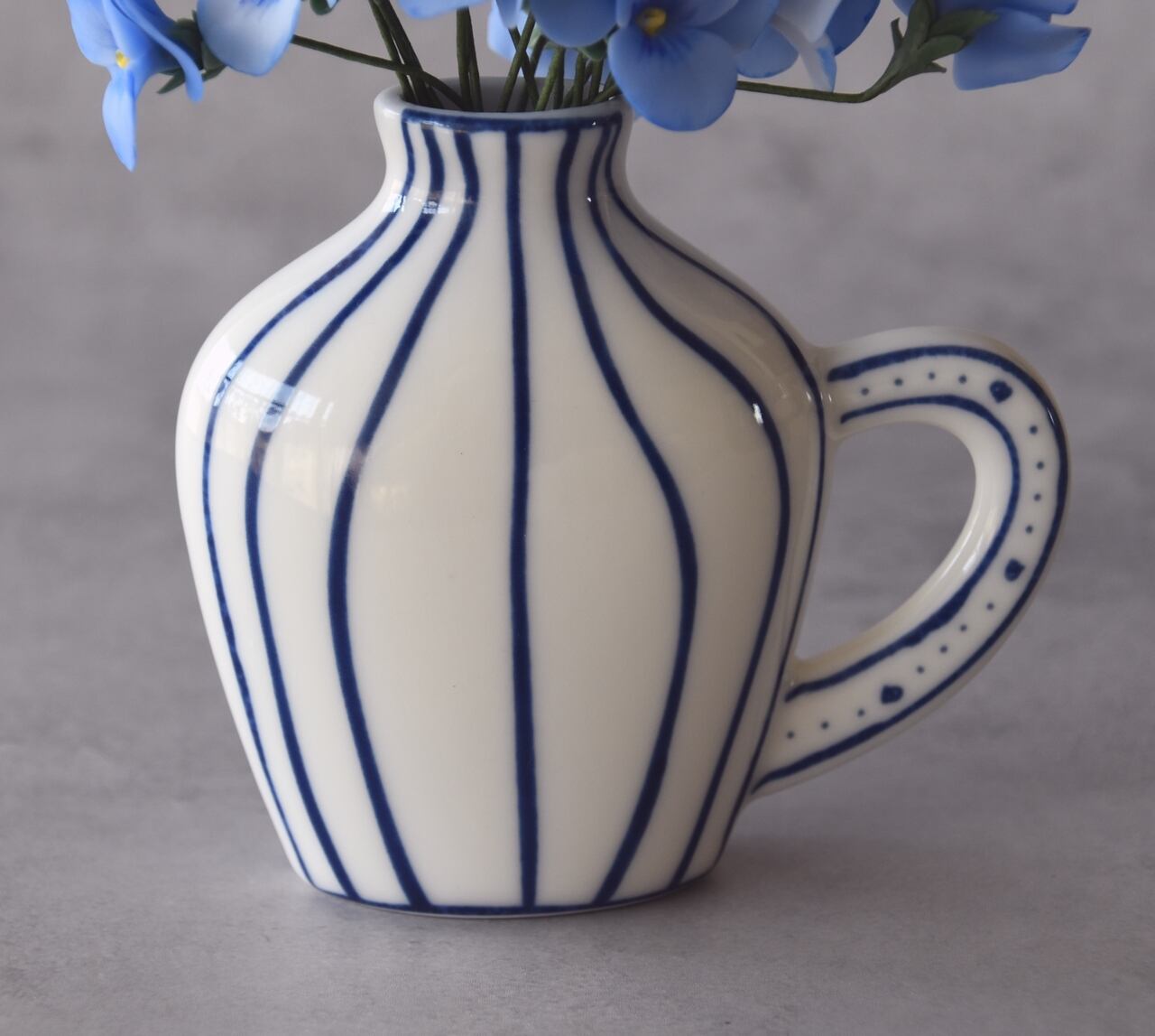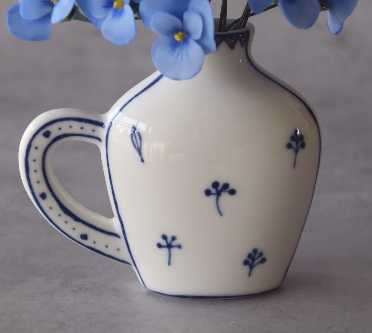 花瓶はスリムなフォルムで、表と裏にそれぞれ異なる手描きの模様が施されており、北欧風のとても愛らしいデザインです。