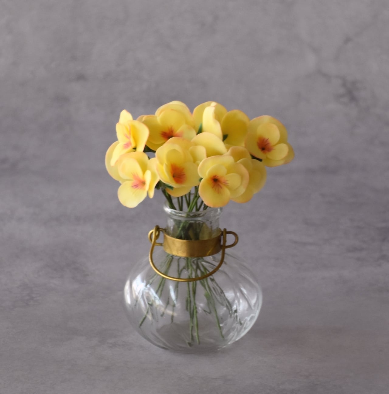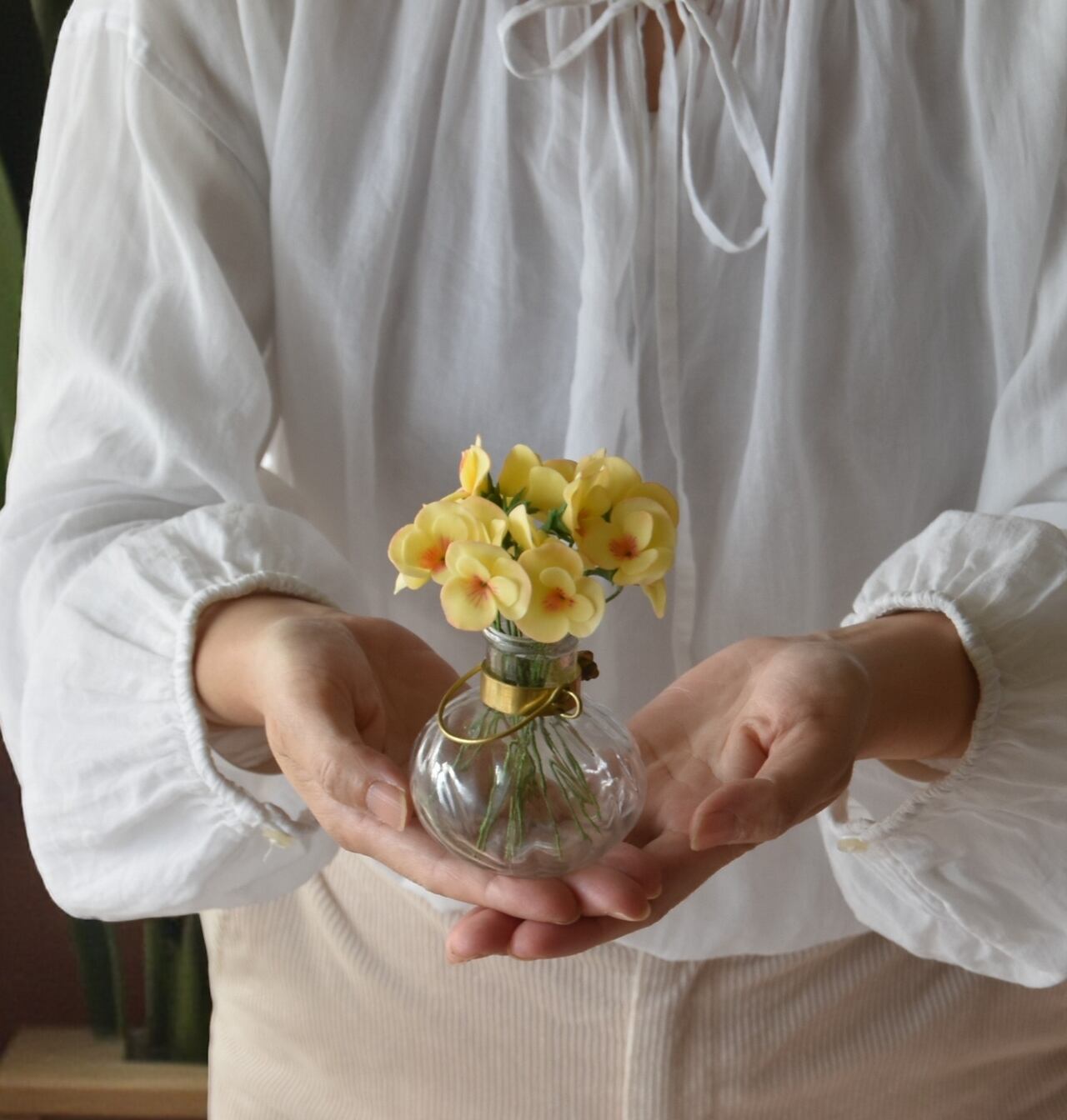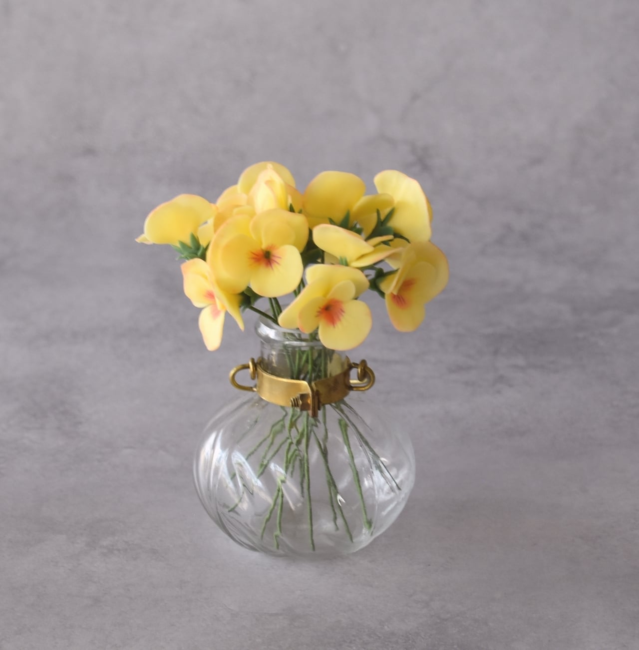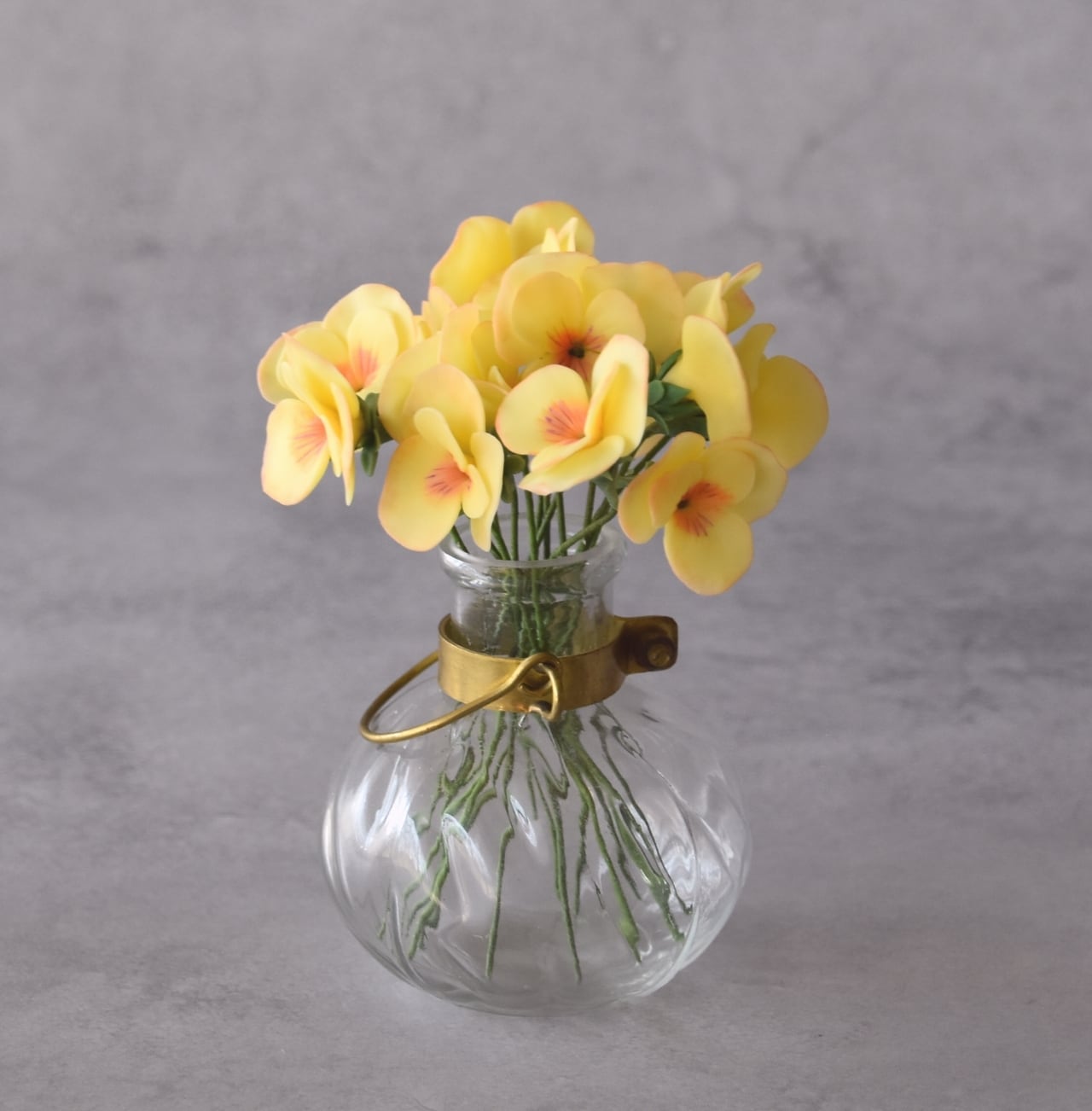 フラワーベースの首元にはハンギング構造の真鍮をあしらい、 蚤の市で見つけたような、時の経過を感じさせるお品で、小さなビオラの可憐さをより引き立ててくれます。