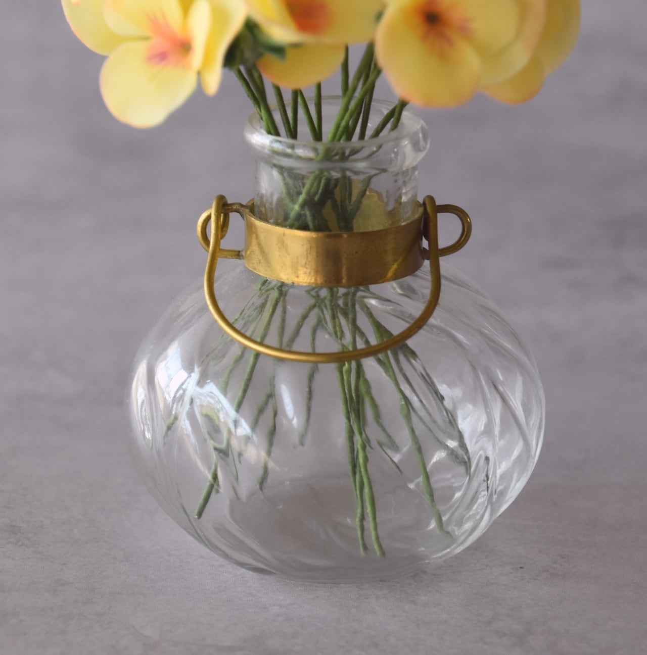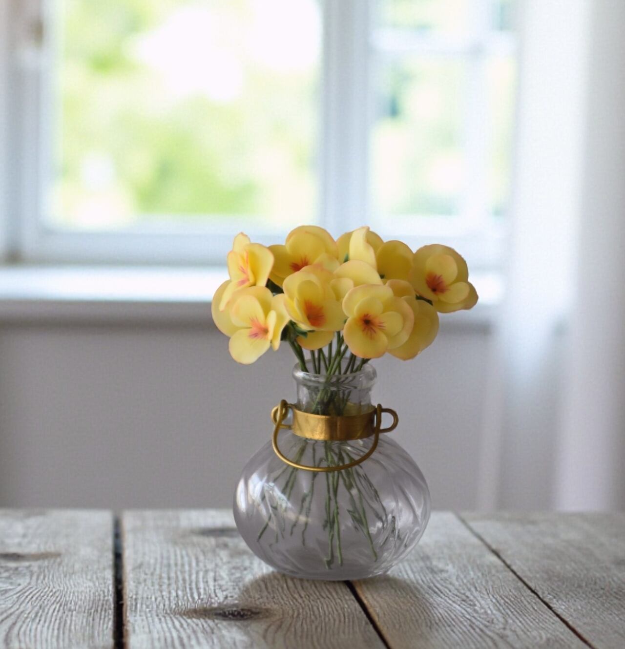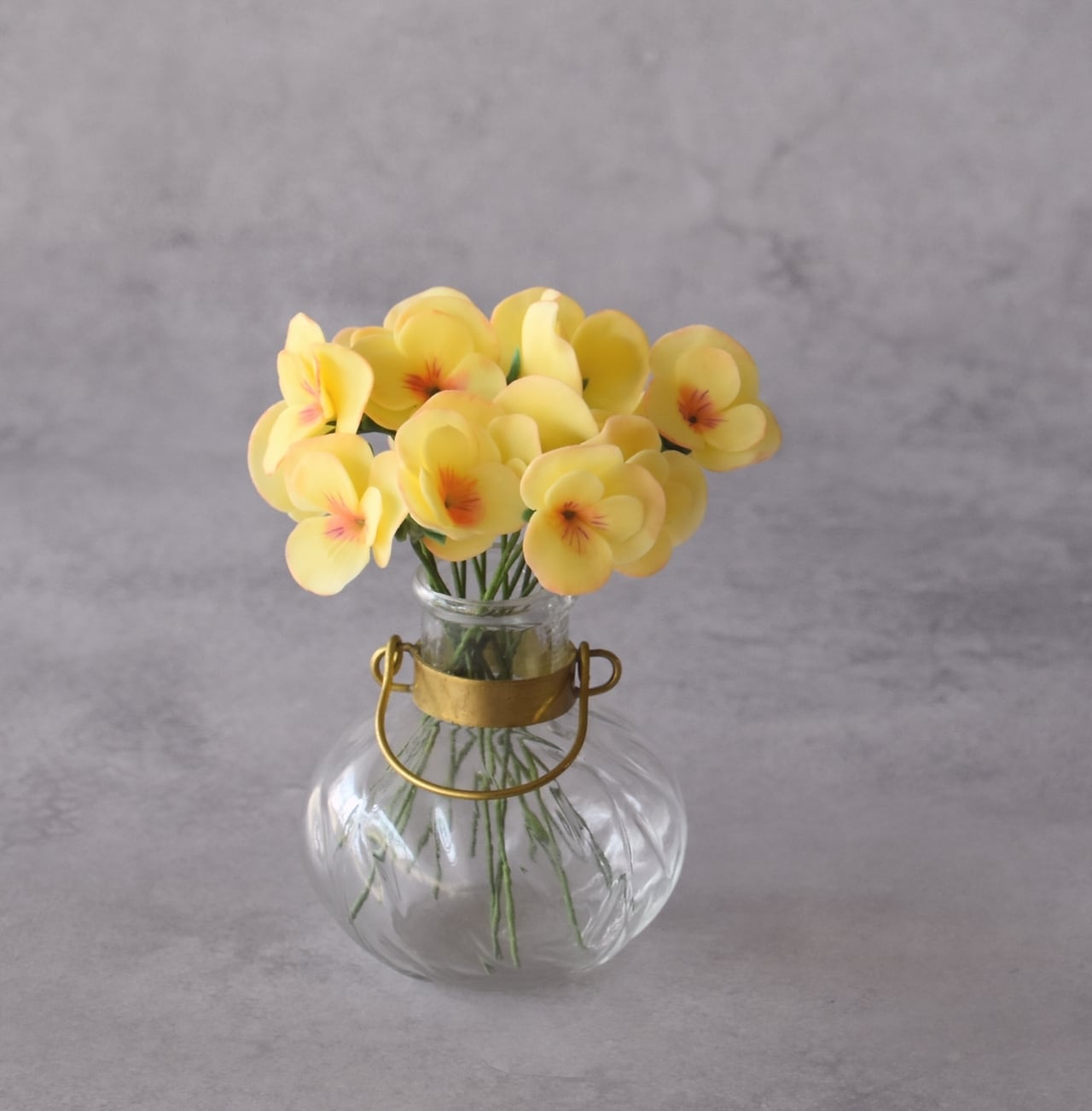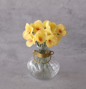 フラワーベースの首元にはハンギング構造の真鍮をあしらい、 蚤の市で見つけたような、時の経過を感じさせるお品で、小さなビオラの可憐さをより引き立ててくれます。