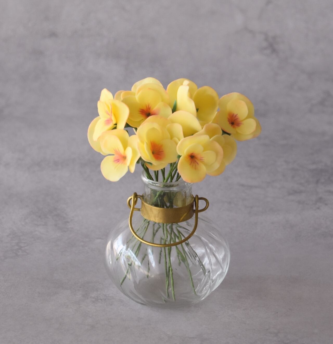 粘土でビオラを制作し、ぷっくりとふくらんだフォルムが可愛い花瓶にアレンジしました。