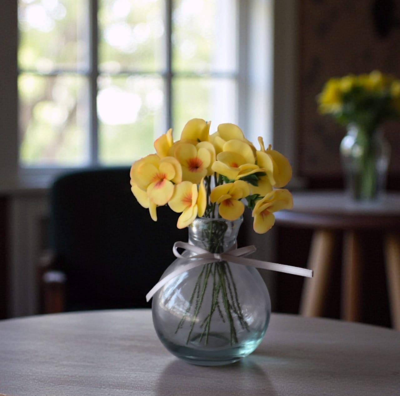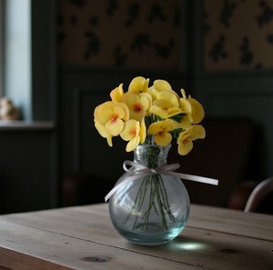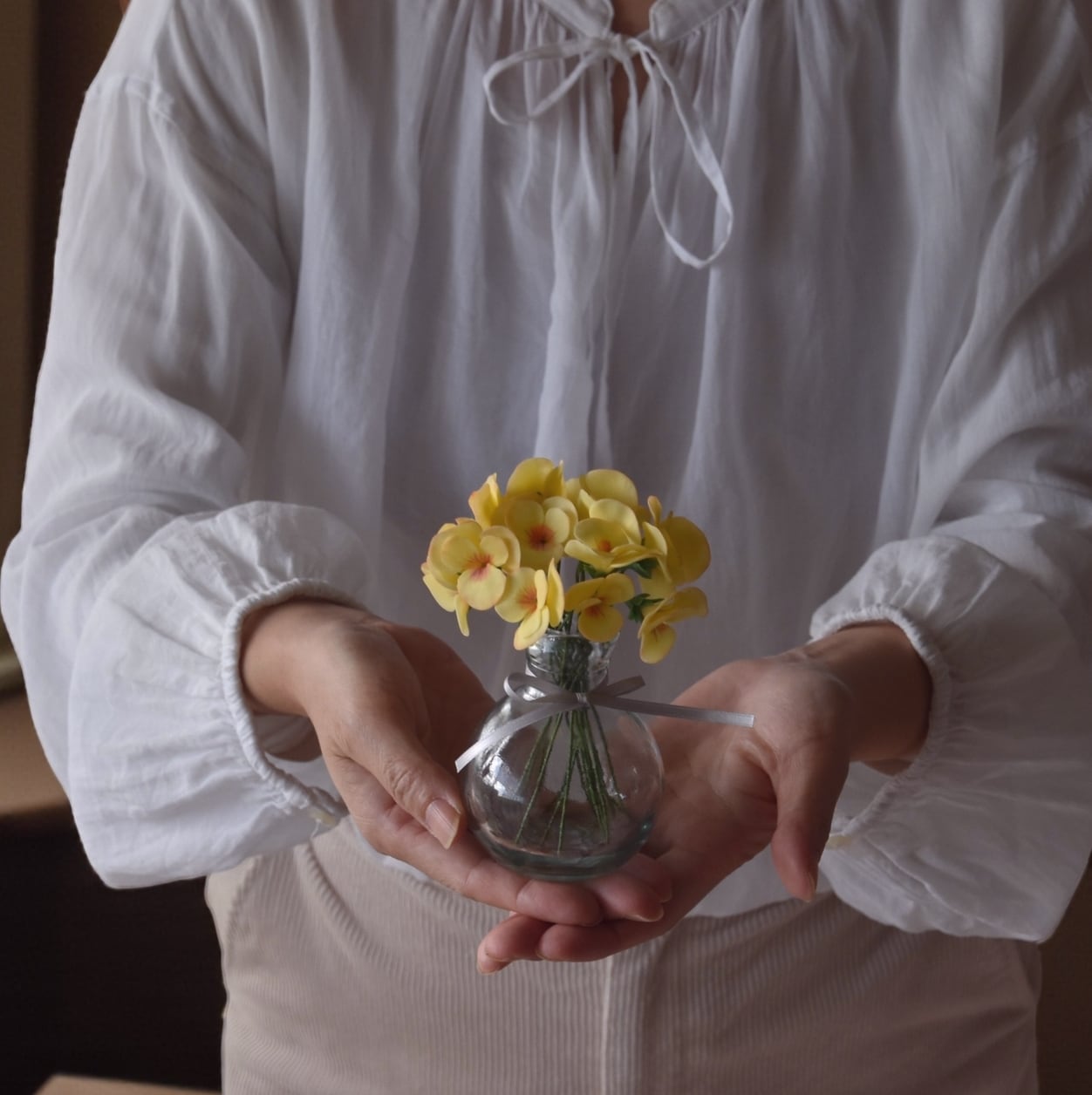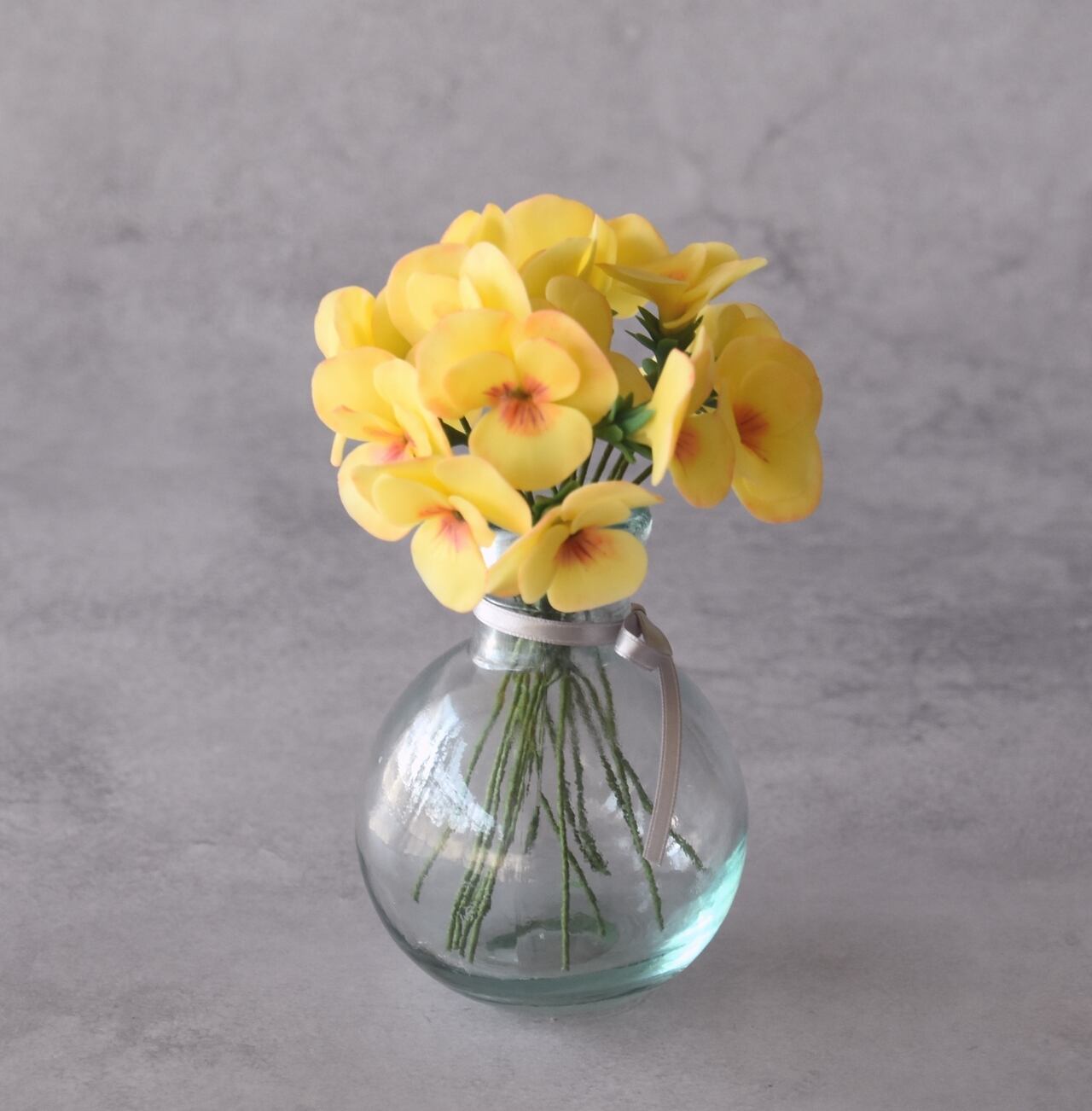 シンプルなガラス製のフラワーボトルが、小さなビオラの可憐さをより引き立ててくれます。