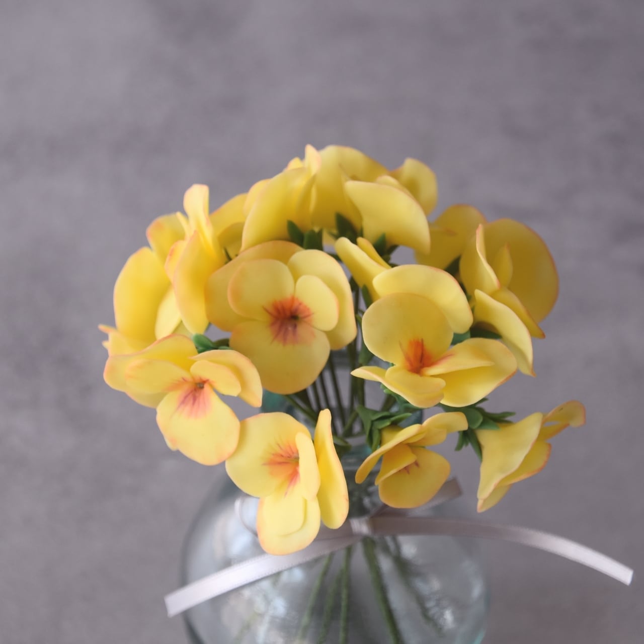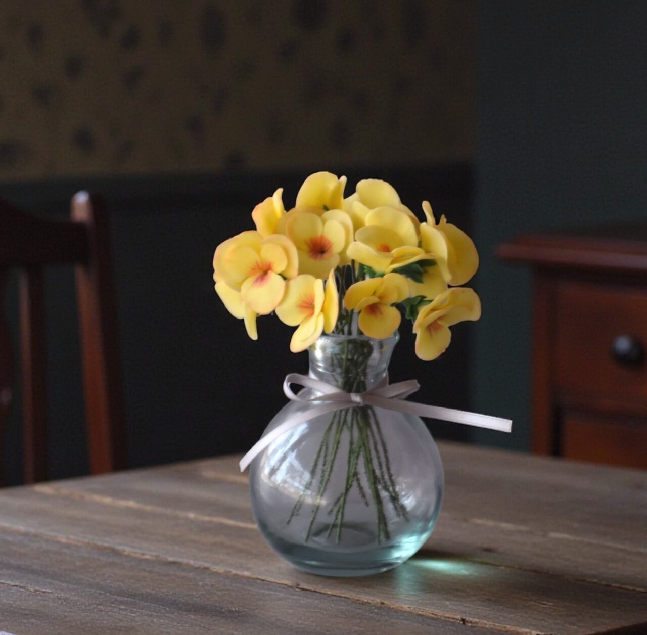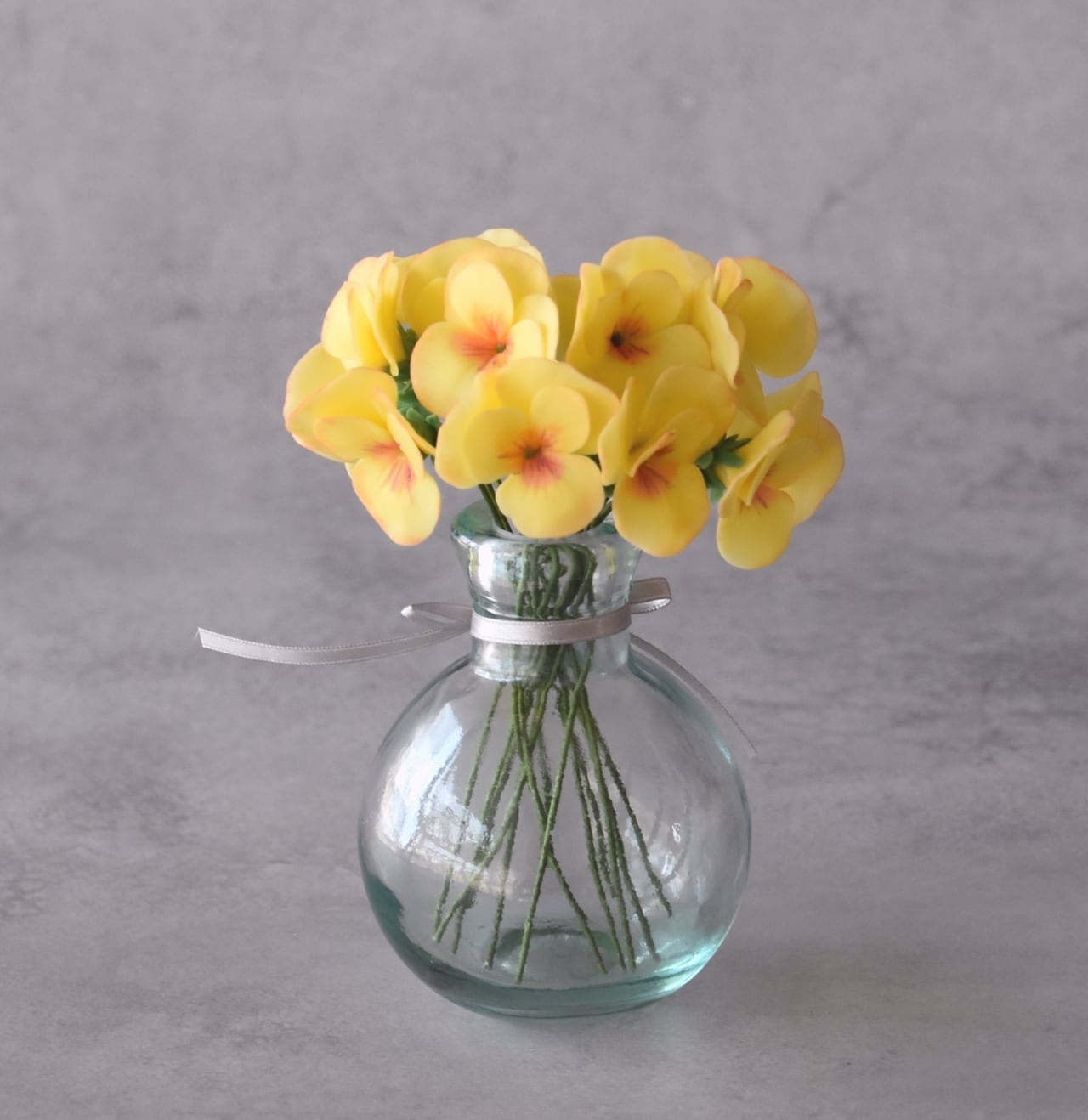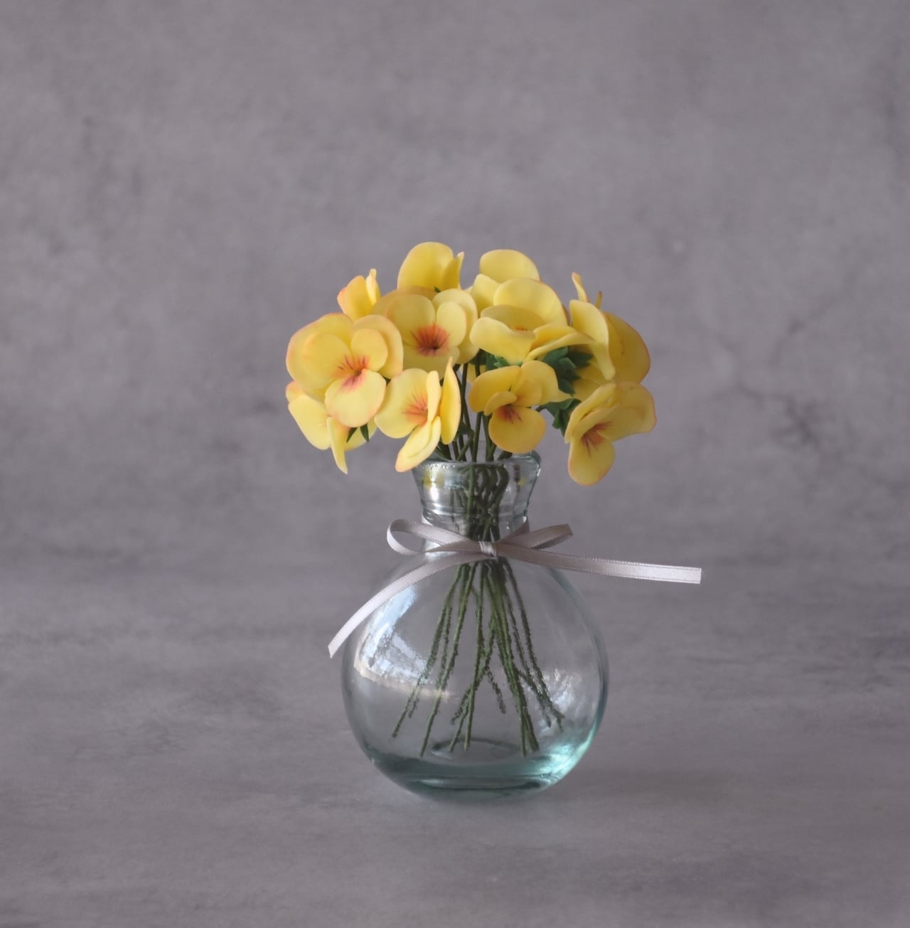 粘土でビオラを制作し、ぷっくりとふくらんだフォルムが可愛い花瓶にアレンジしました。